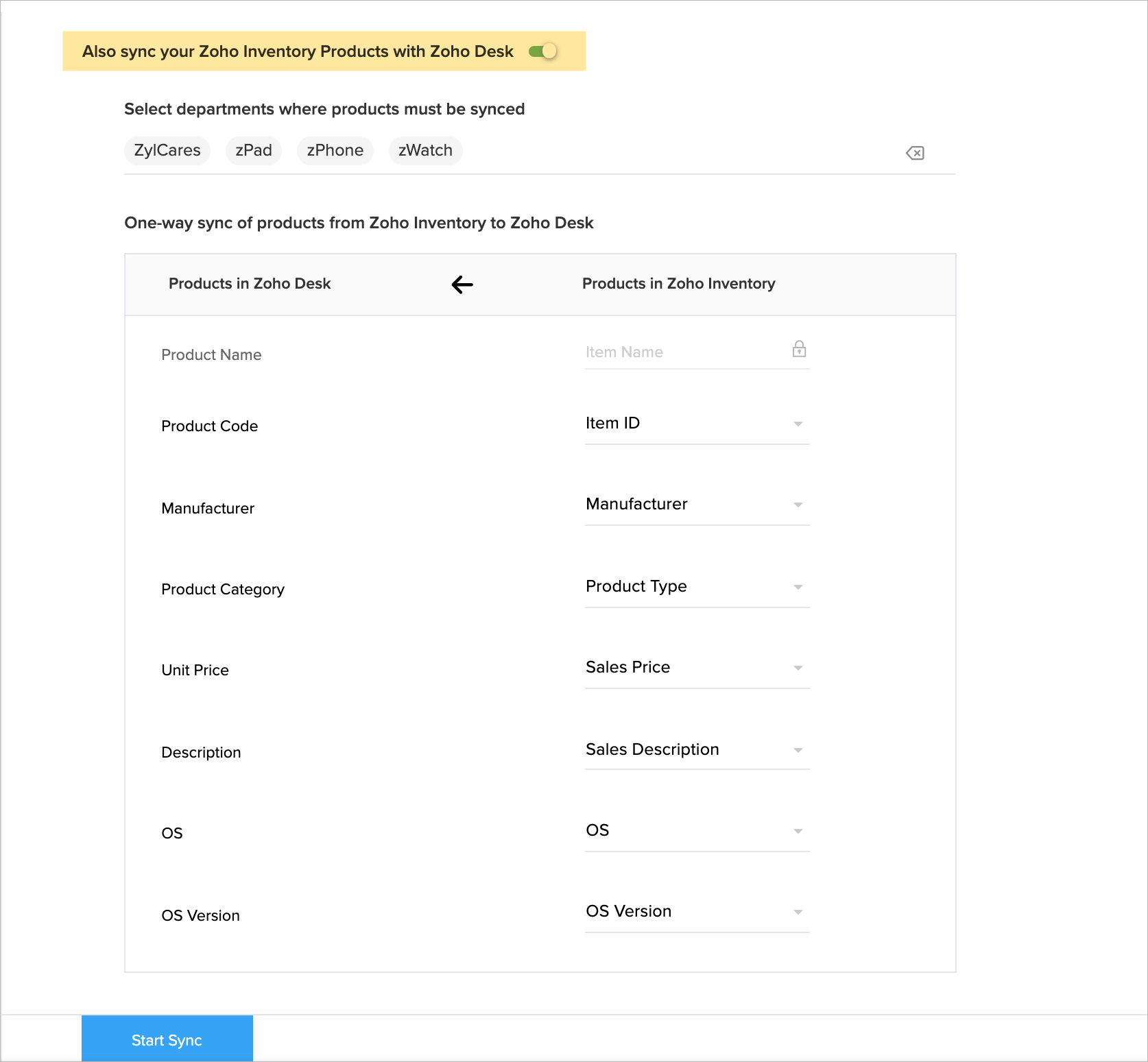 - Zoho InventoryとZoho Desk間で商品情報の同期を有効にします。
