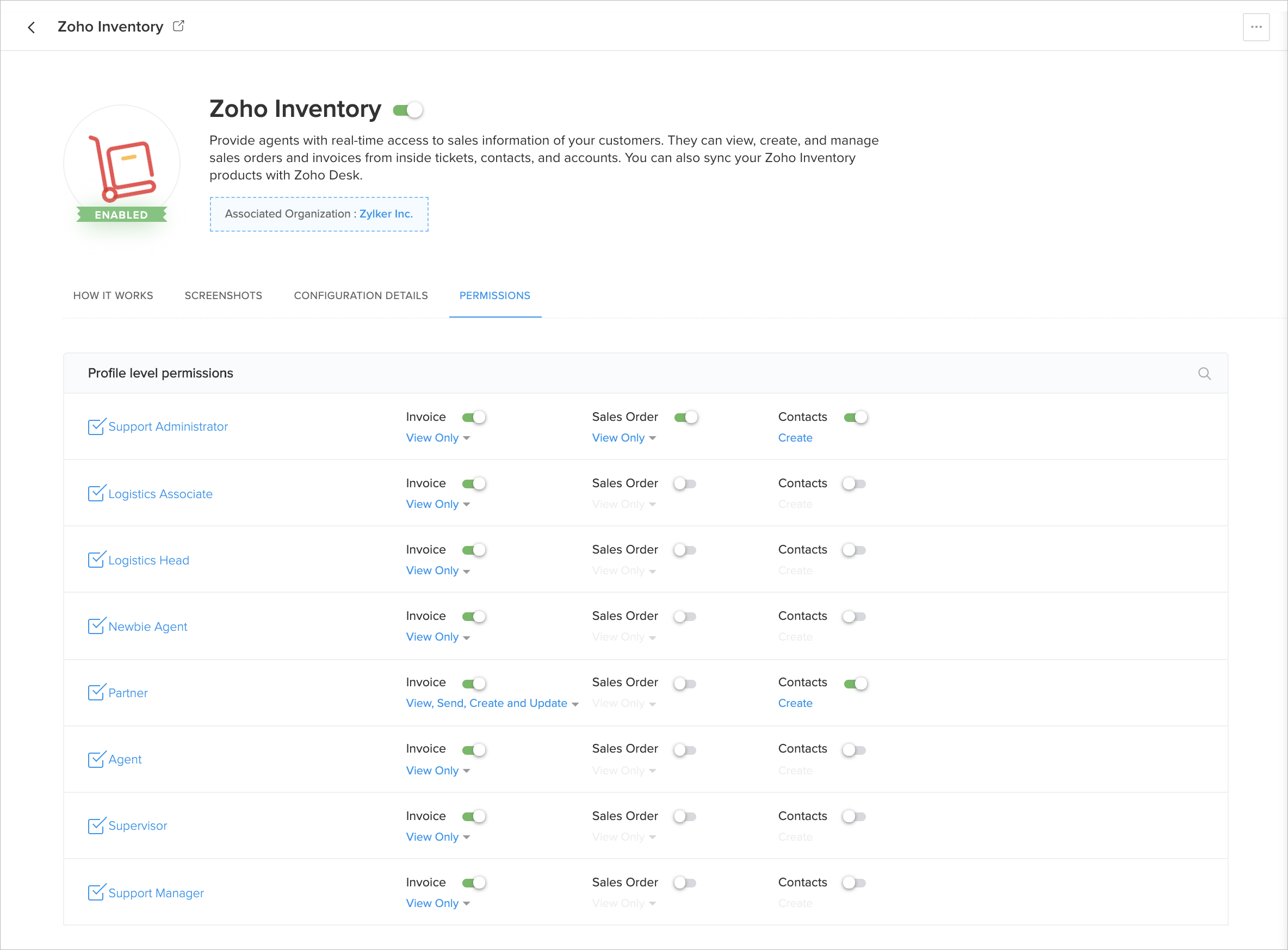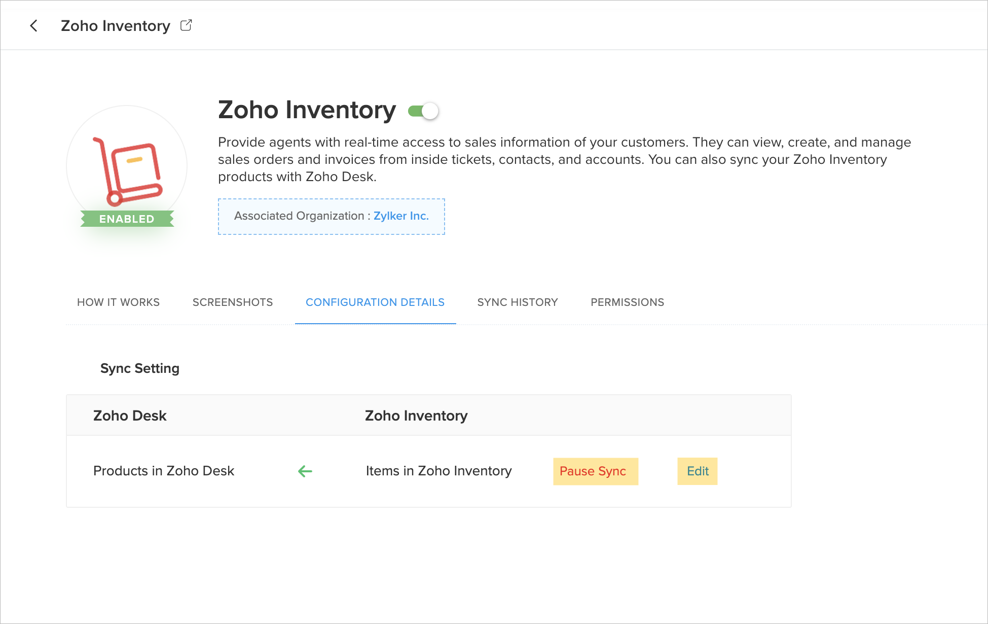 Zoho Deskアカウントから、Zoho Inventory連携を無効にできます。無効にすると、Zoho Inventoryの組織に関する情報にアクセスできなくなります。ただし、次回の連携を有効にするまでの間、連絡先や問い合わせと請求書や受注書の関連付けは保持されます。