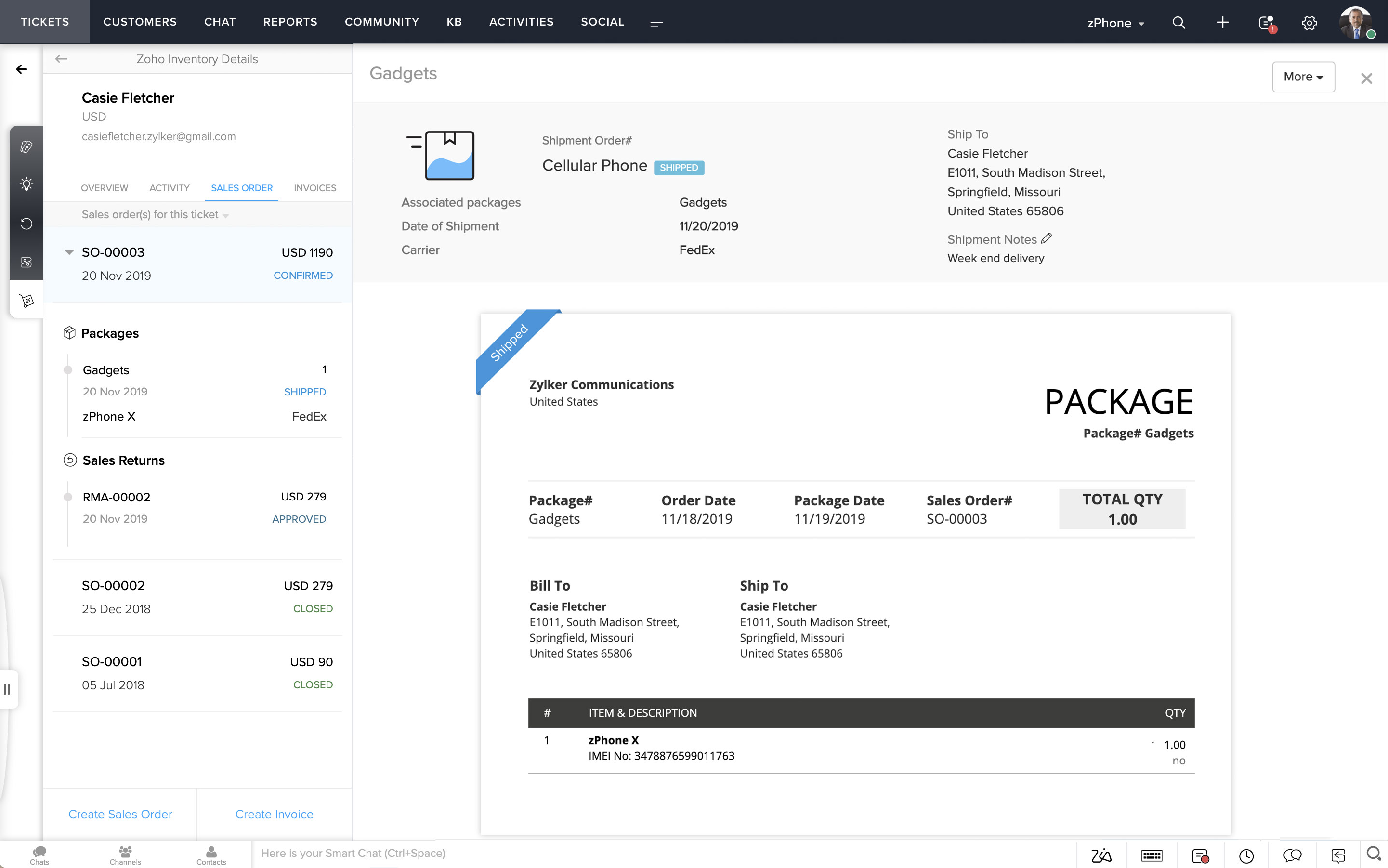 - 顧客に関する最近の出荷情報や商品情報など、Zoho Inventoryに登録されている詳細情報を確認できます。