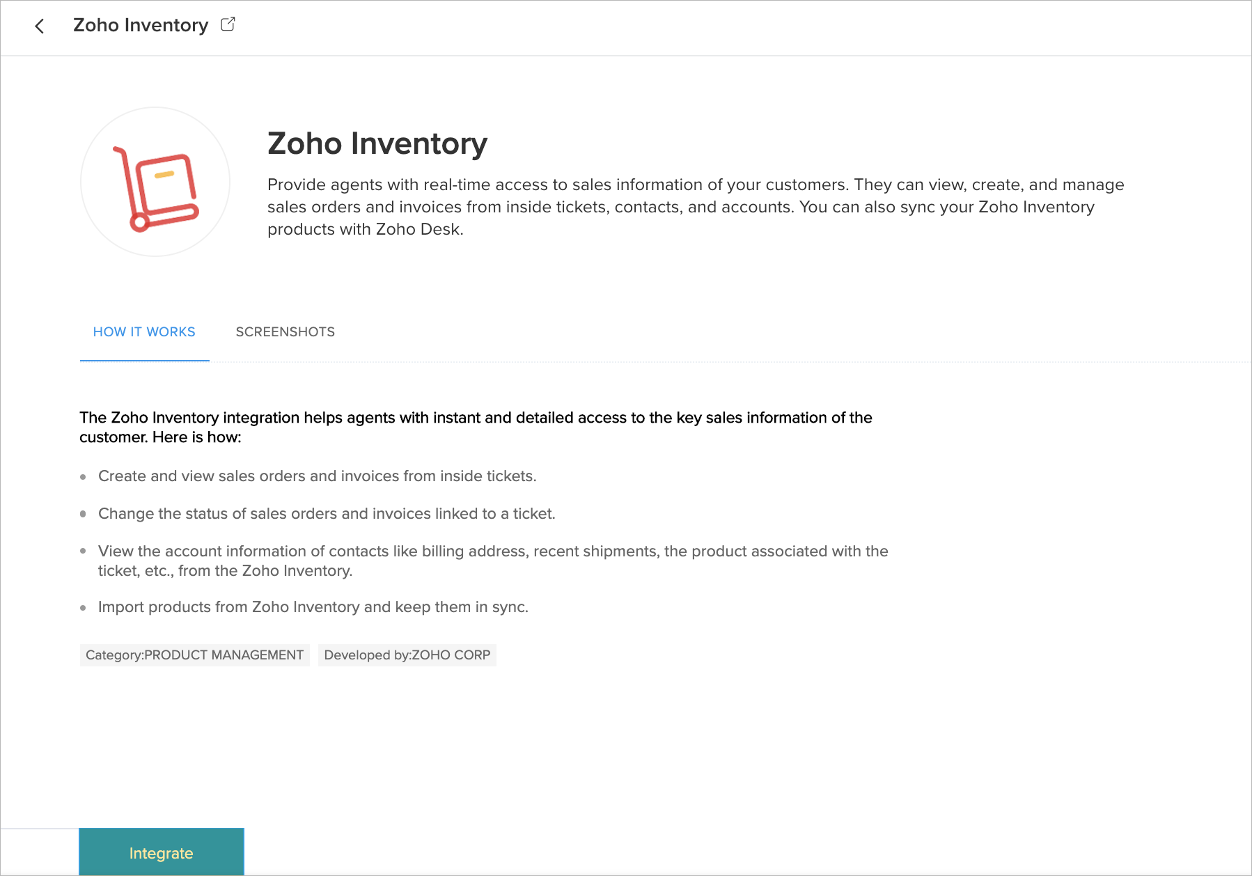 - Zoho Inventoryの商品情報がインポートされ、Zoho Deskと同期されます。