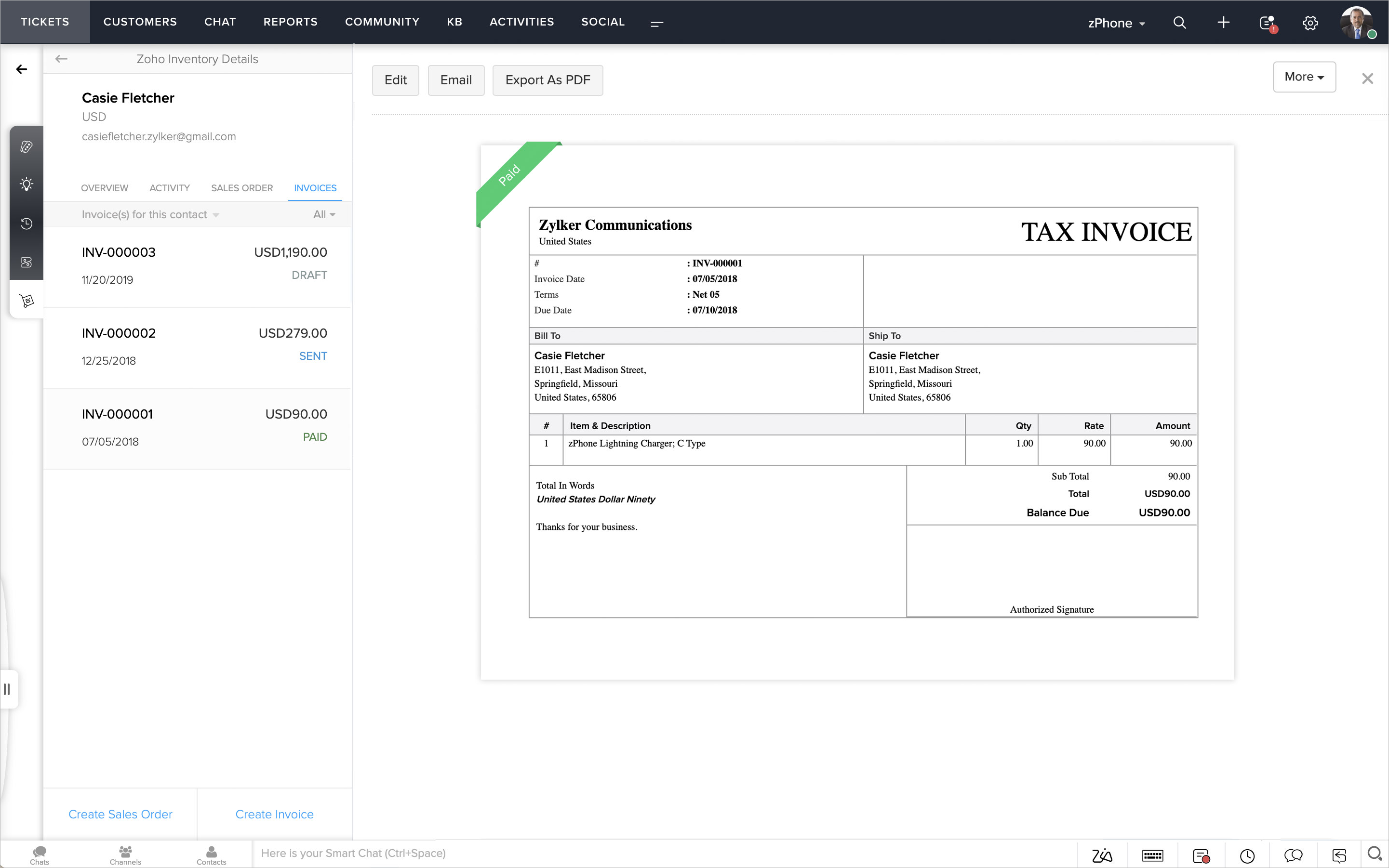 Zoho Inventoryの各データの表示に加えて、担当者はZoho Desk内から新しい受注書や請求書を作成することもできます。