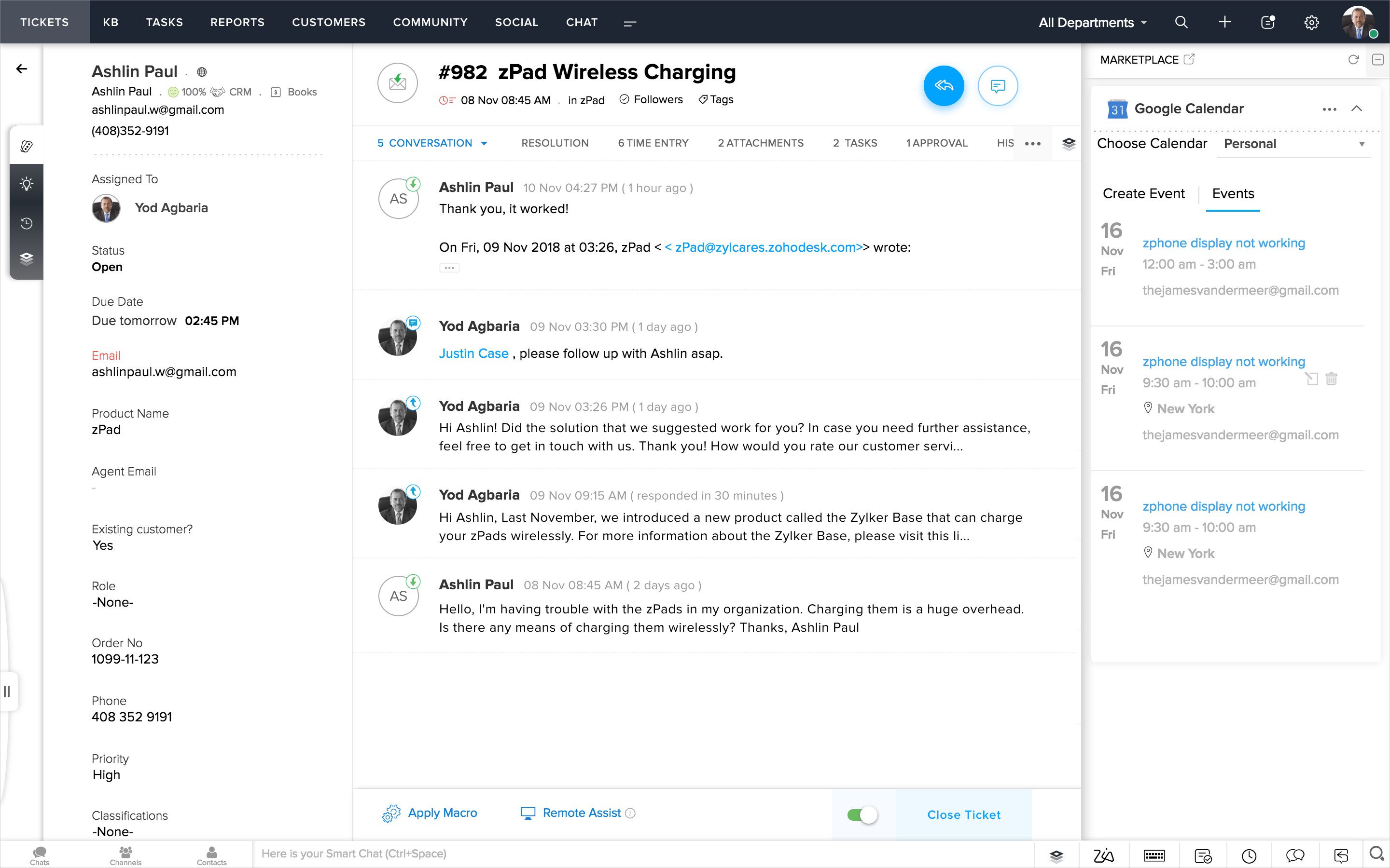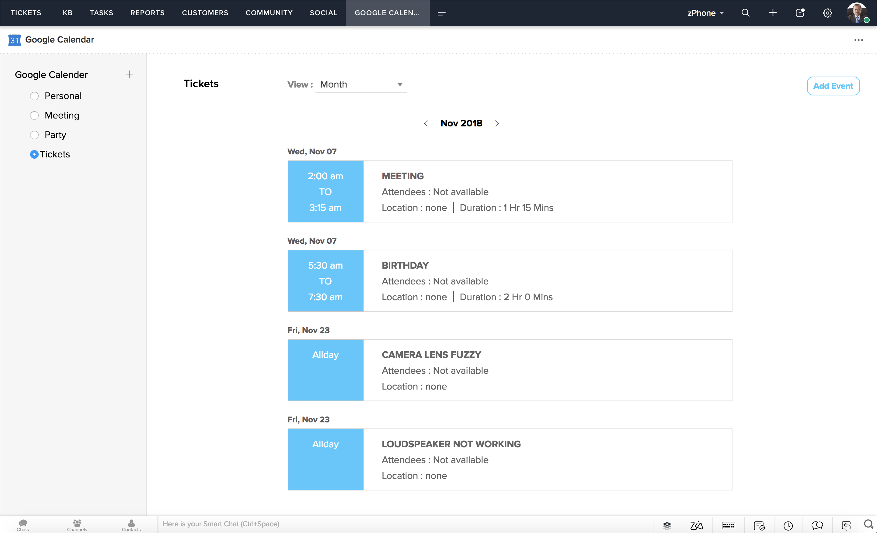 Zoho DeskのGoogle Calendar拡張機能を使用すると、Zoho Desk内でカレンダーや予定を作成し、Google カレンダーと同期することができます。Zoho DeskからGoogle カレンダーの予定を登録、編集、キャンセルすることもできます。この拡張機能では、リマインダーを設定し、今後の予定についてユーザーに通知するように設定することも可能です。