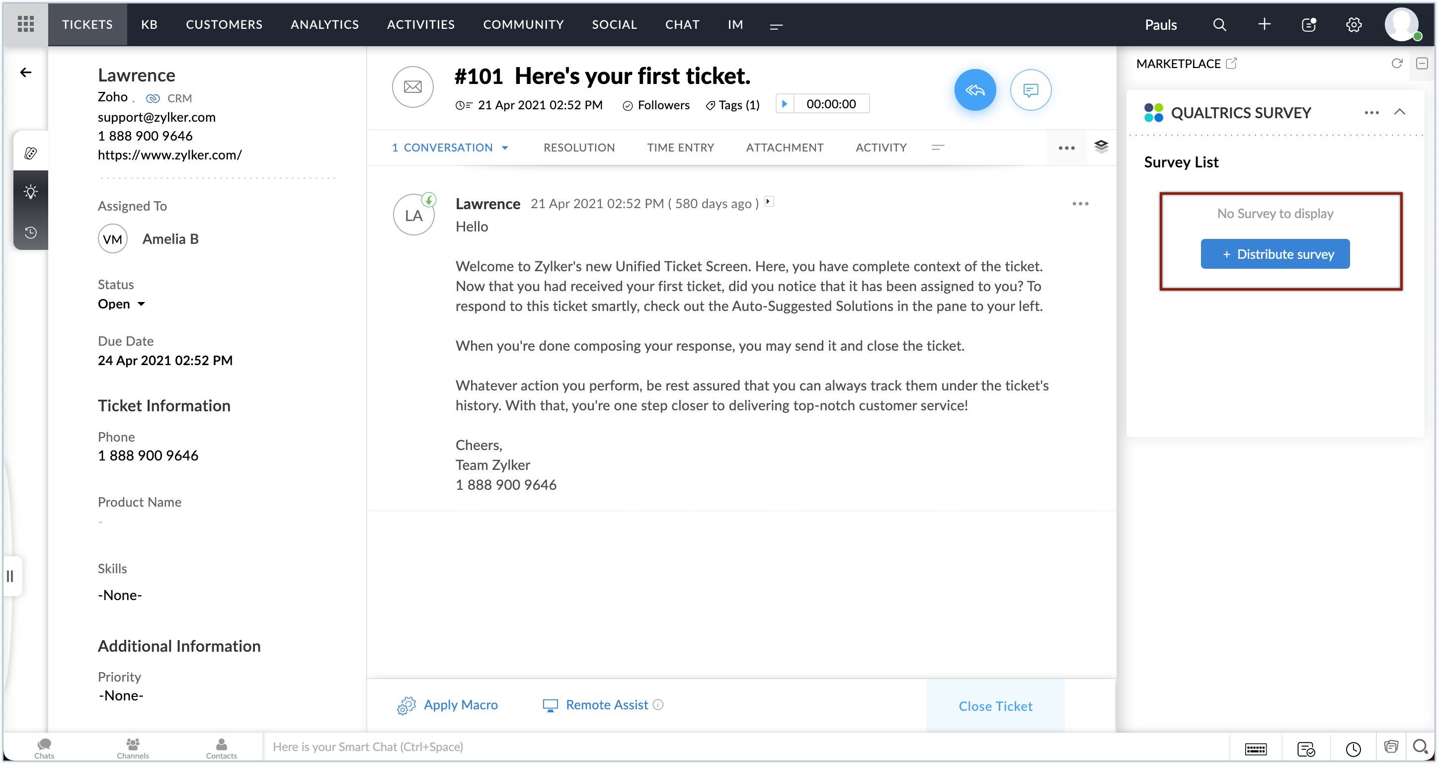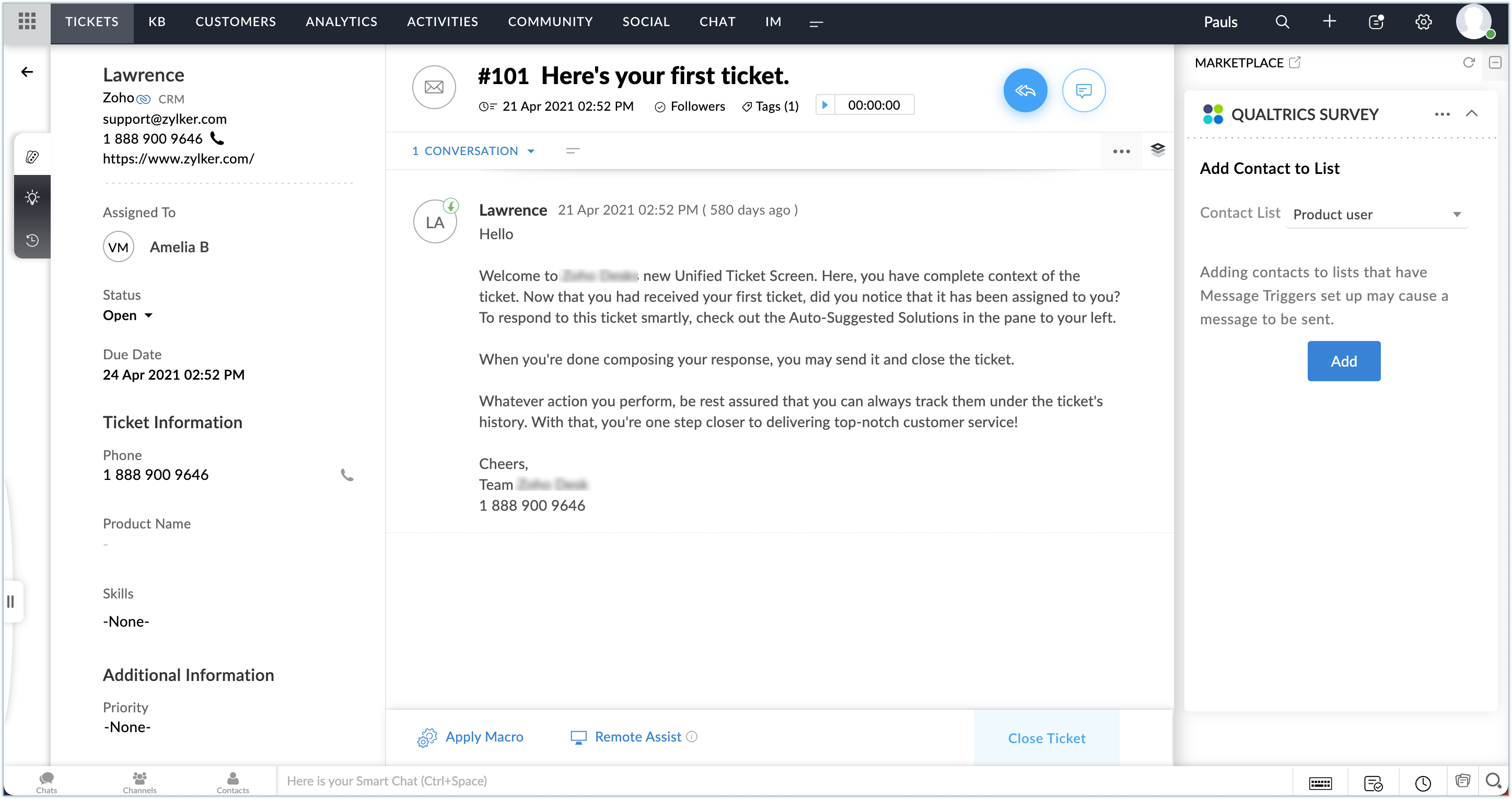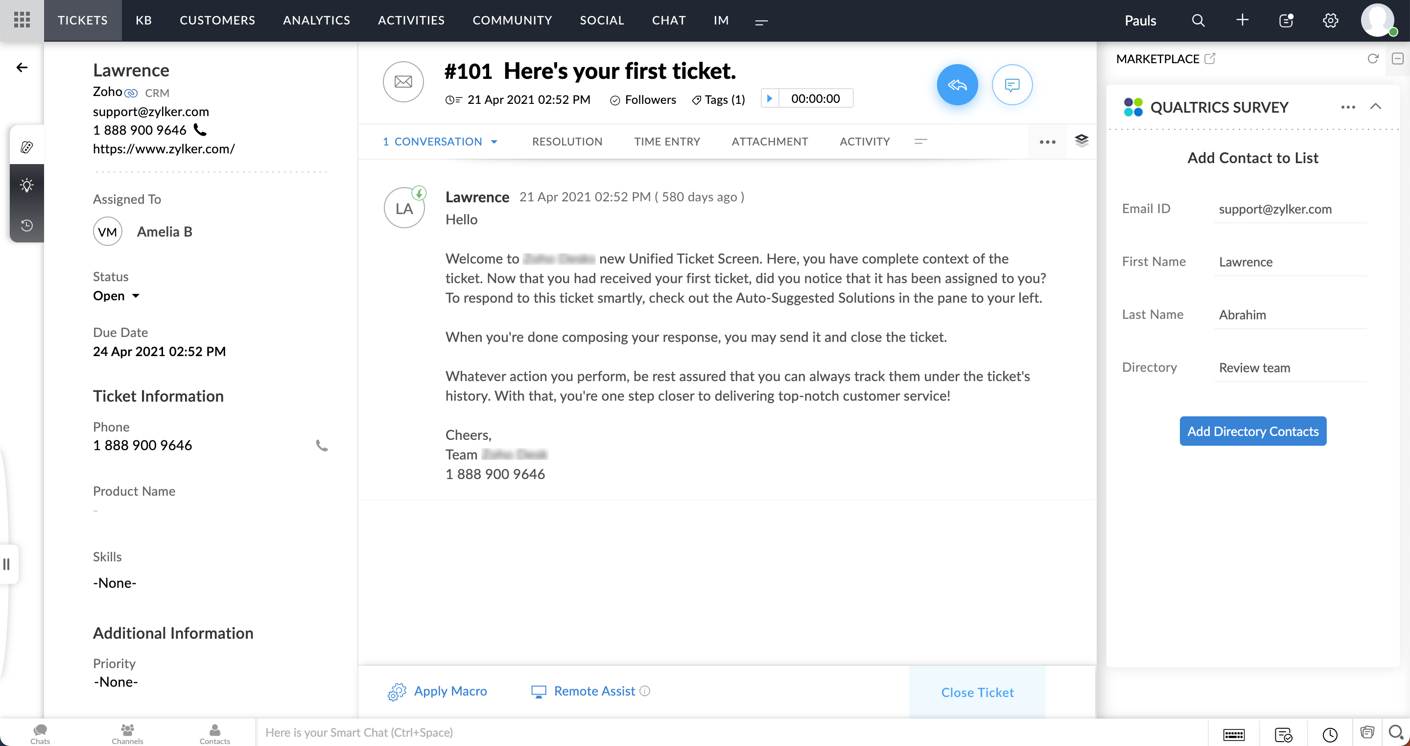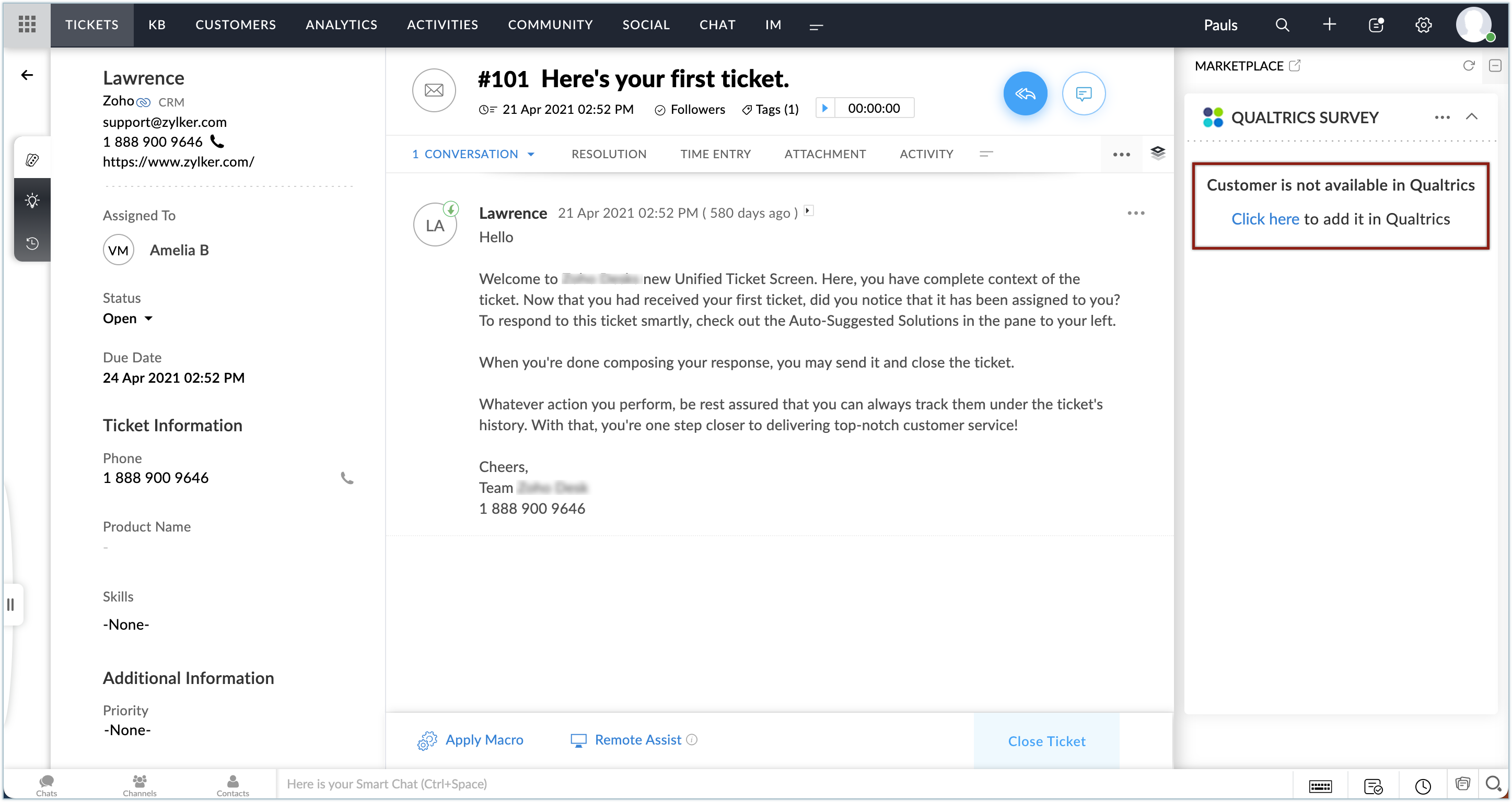 Qualtrics拡張機能では、Zoho Deskの問い合わせを送信した顧客がQualtricsに登録されているかどうかがメールアドレスに基づいて判断されます。未登録の場合は、Qualtrics拡張機能の欄に対象の顧客をQualtricsに追加するためのリンクが表示されます。
