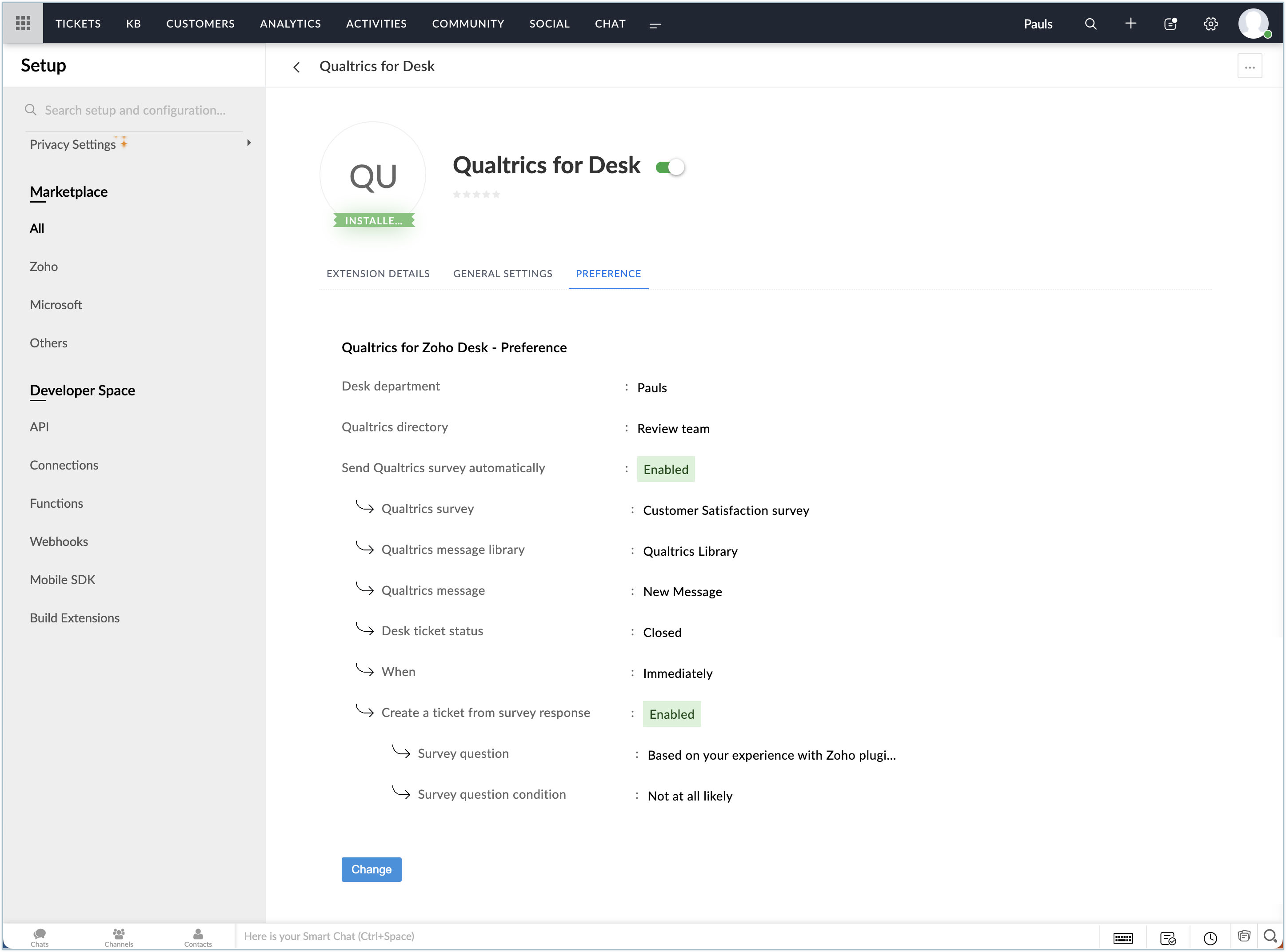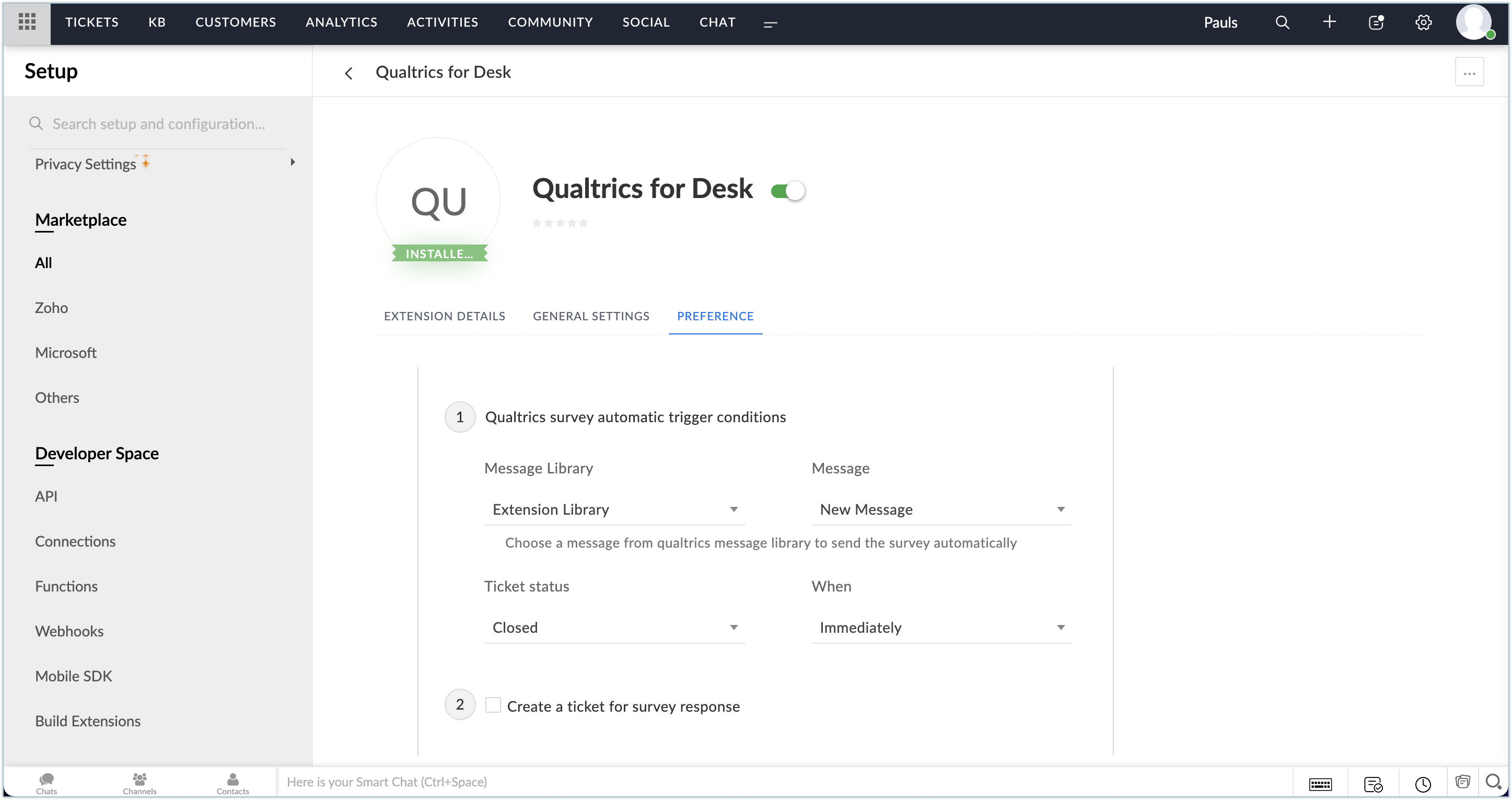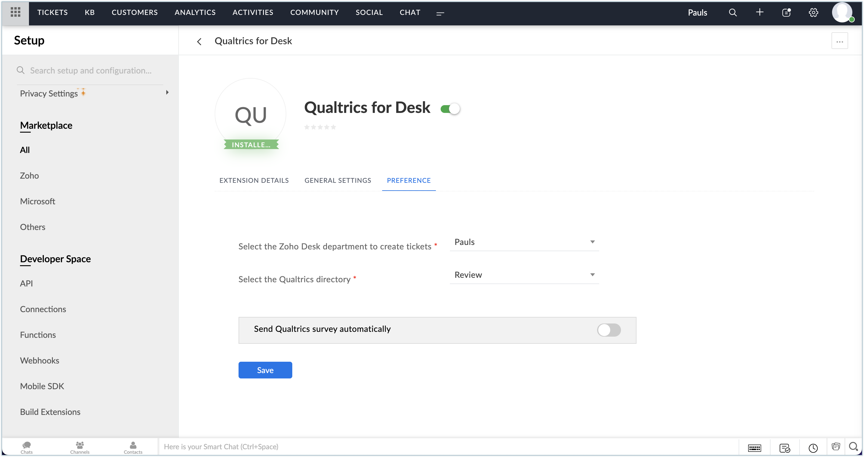 インストールが完了したら、Zoho Deskの部門やQualtricsのディレクトリに関する設定を行う必要があります。部門を設定すると、アンケートに関連する問い合わせが自動的に各部門に関連付けられて登録されます。