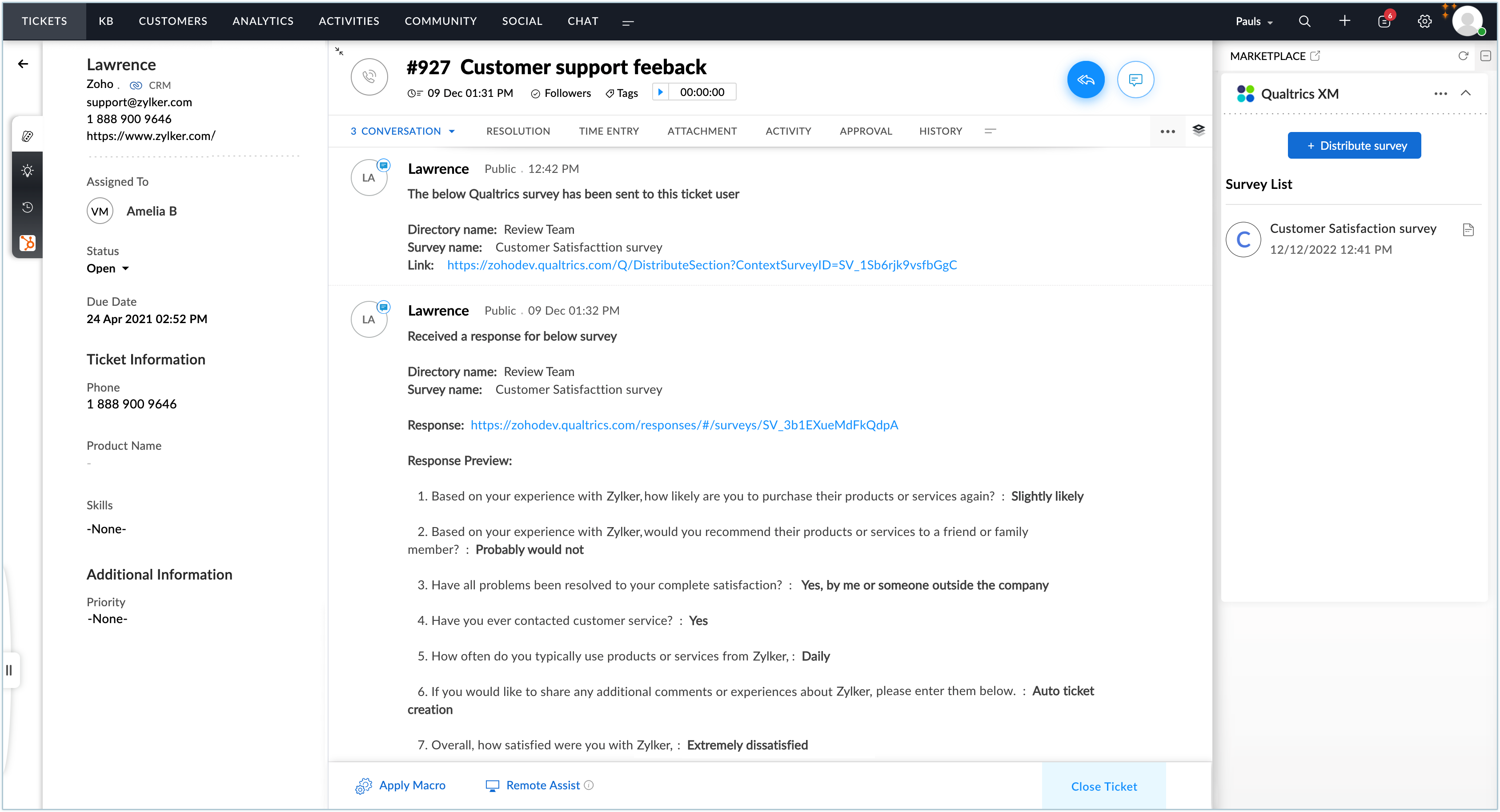 Zoho DeskのQualtrics拡張機能を利用すると、Zoho Deskにおいて顧客にメールでアンケートを送信して顧客満足度を調査し、サポート品質の向上に役立てることができます。具体的には、Zoho DeskからQualtricsのメッセージテンプレートを利用したり、Qualtricsの連絡先データやメッセージテンプレートを作成したりすることが可能です。また、特定の条件を満たした場合に、顧客にアンケートを自動で送信することもできます。