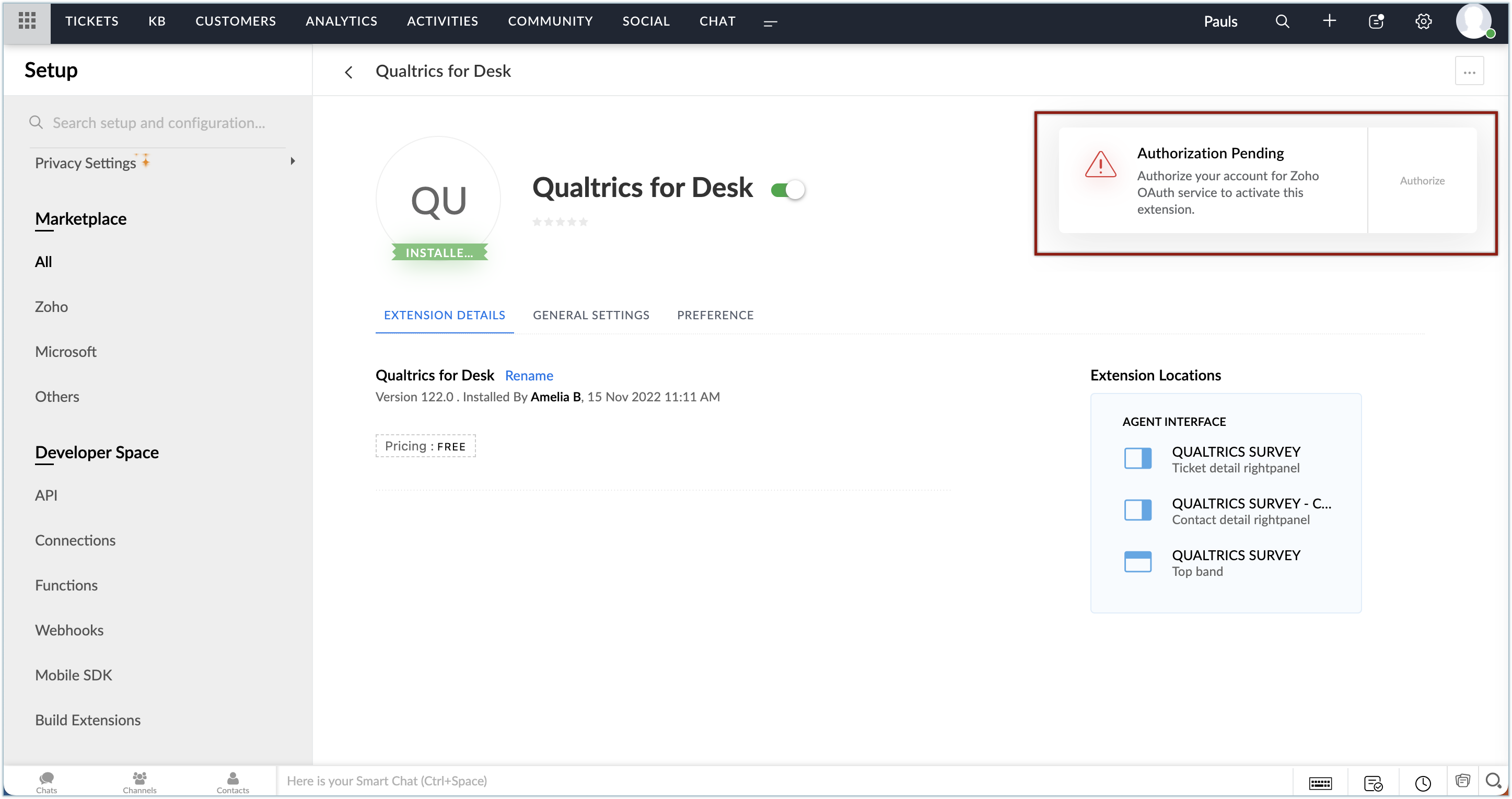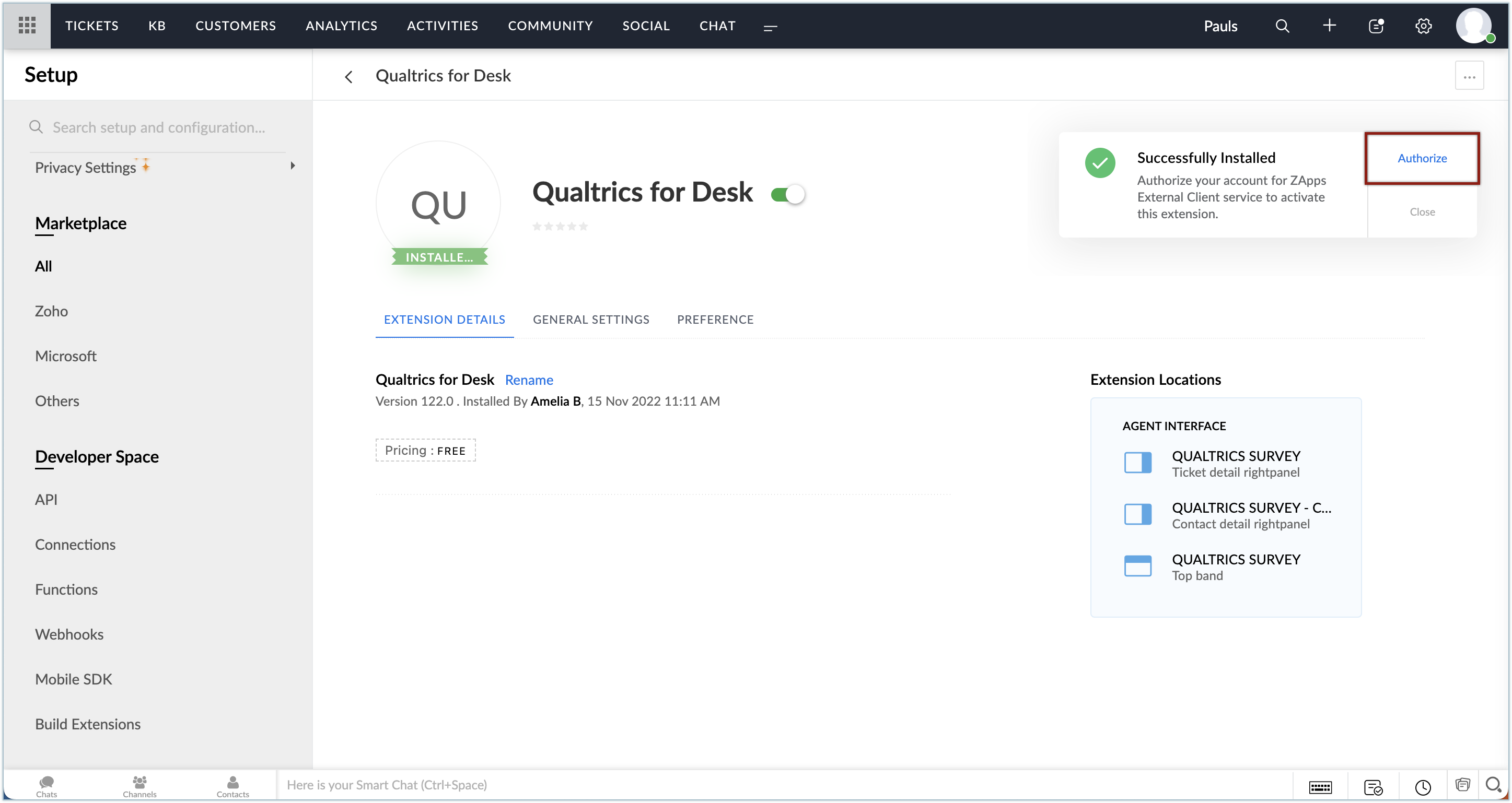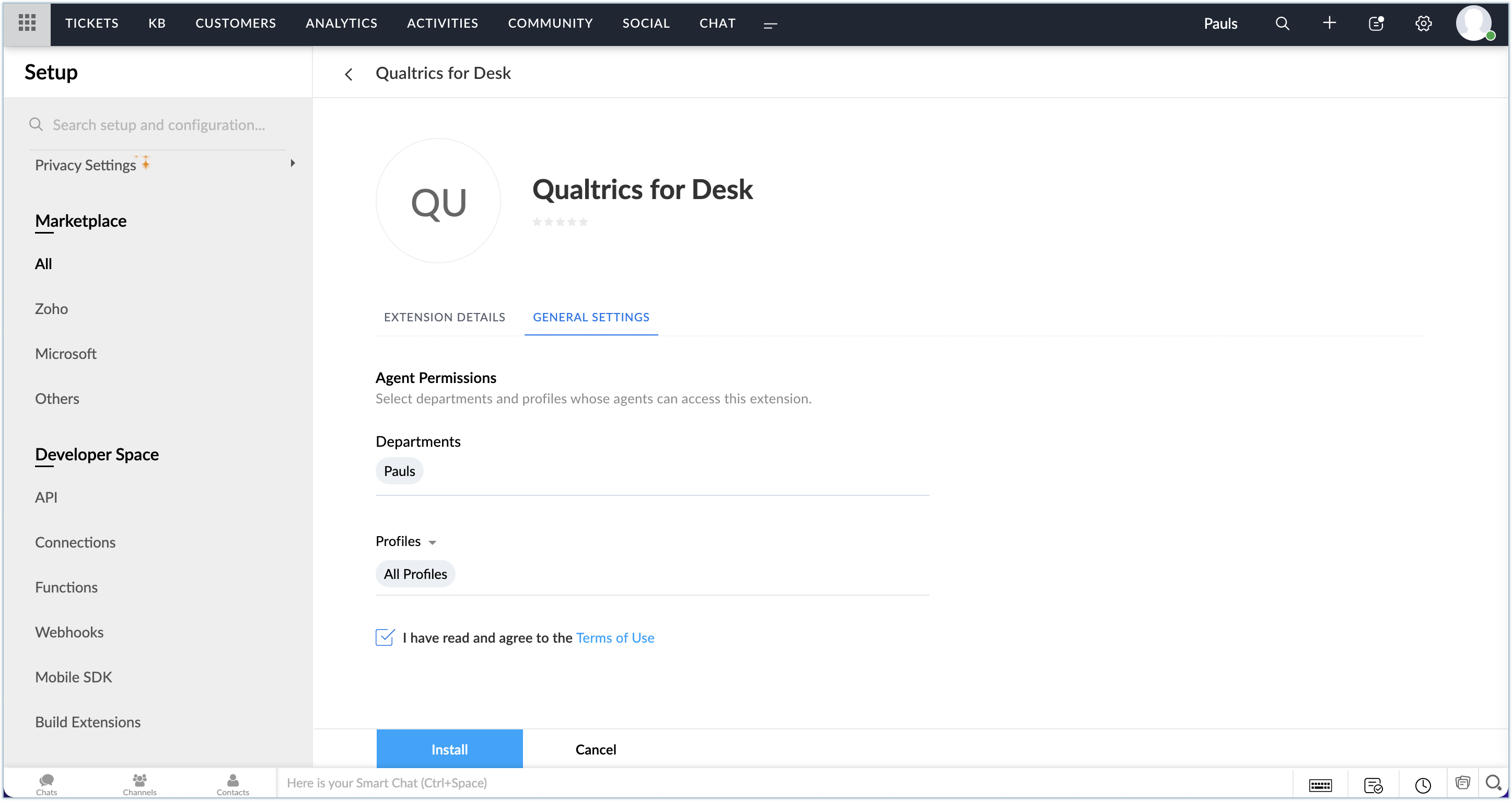 Zoho Deskから拡張機能をインストールするには: