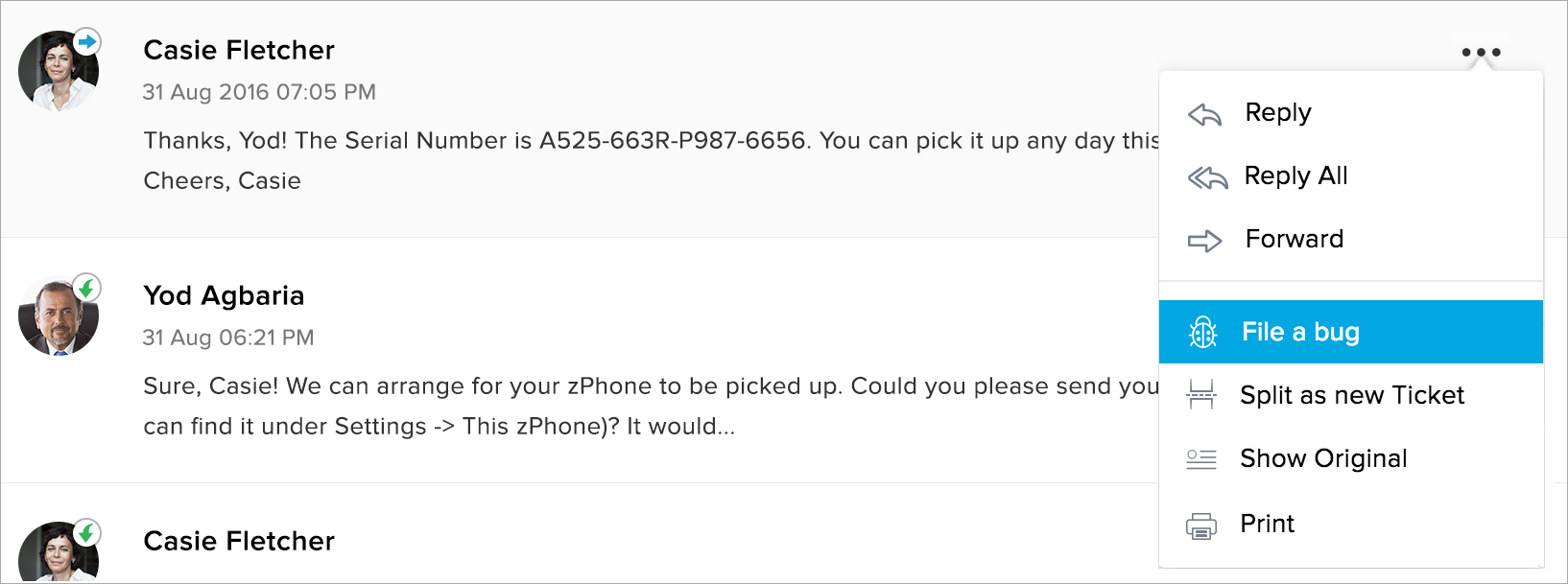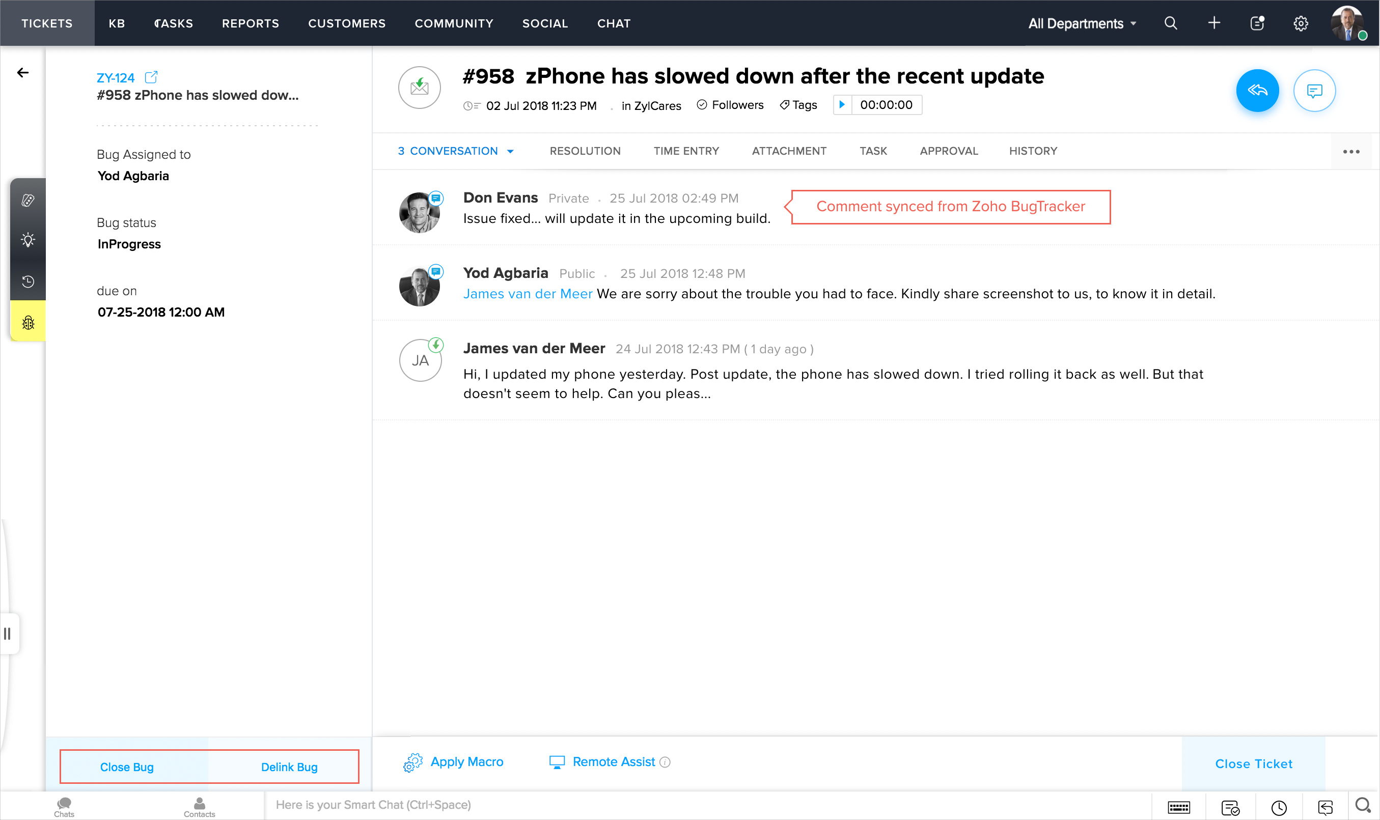 サポート担当者とエンジニアの双方が課題についてのコメントを追加できます。課題に追加したコメントは、関連する問い合わせに同期されます。また、その逆も同様です。該当の内容は、問い合わせのスレッド内のコメントの欄で表示されます。また、Zoho BugTrackerの課題を解決すると、問い合わせのステータスが更新されます。ステータスは、課題を報告した顧客に通知する際に役立ちます。