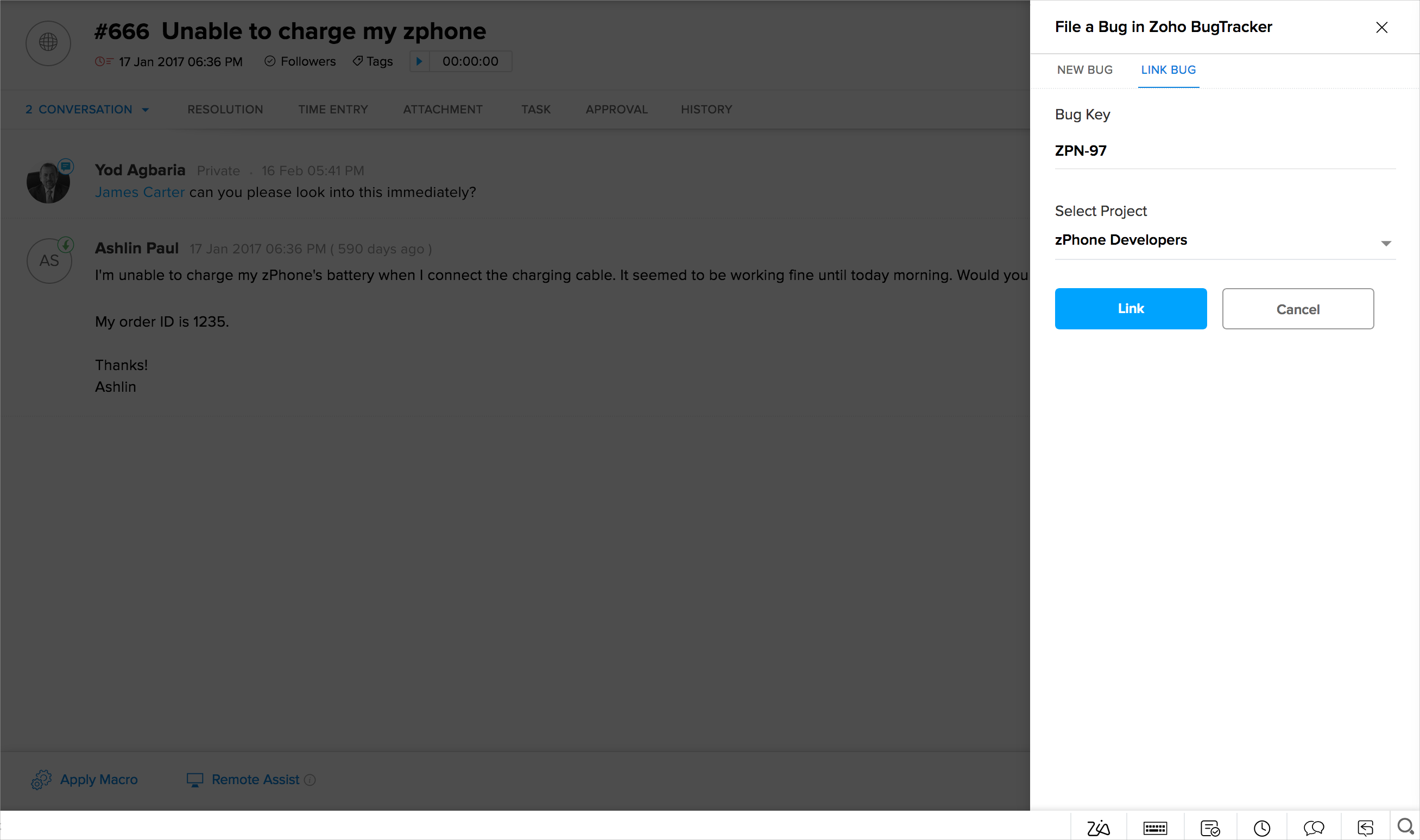 Zoho BugTrackerで作業中の課題があり、それに関連する問い合わせを受け取った場合は、その問い合わせを課題と関連付けることができます。ただし、同じ問い合わせを複数の課題に関連付けることはできません。