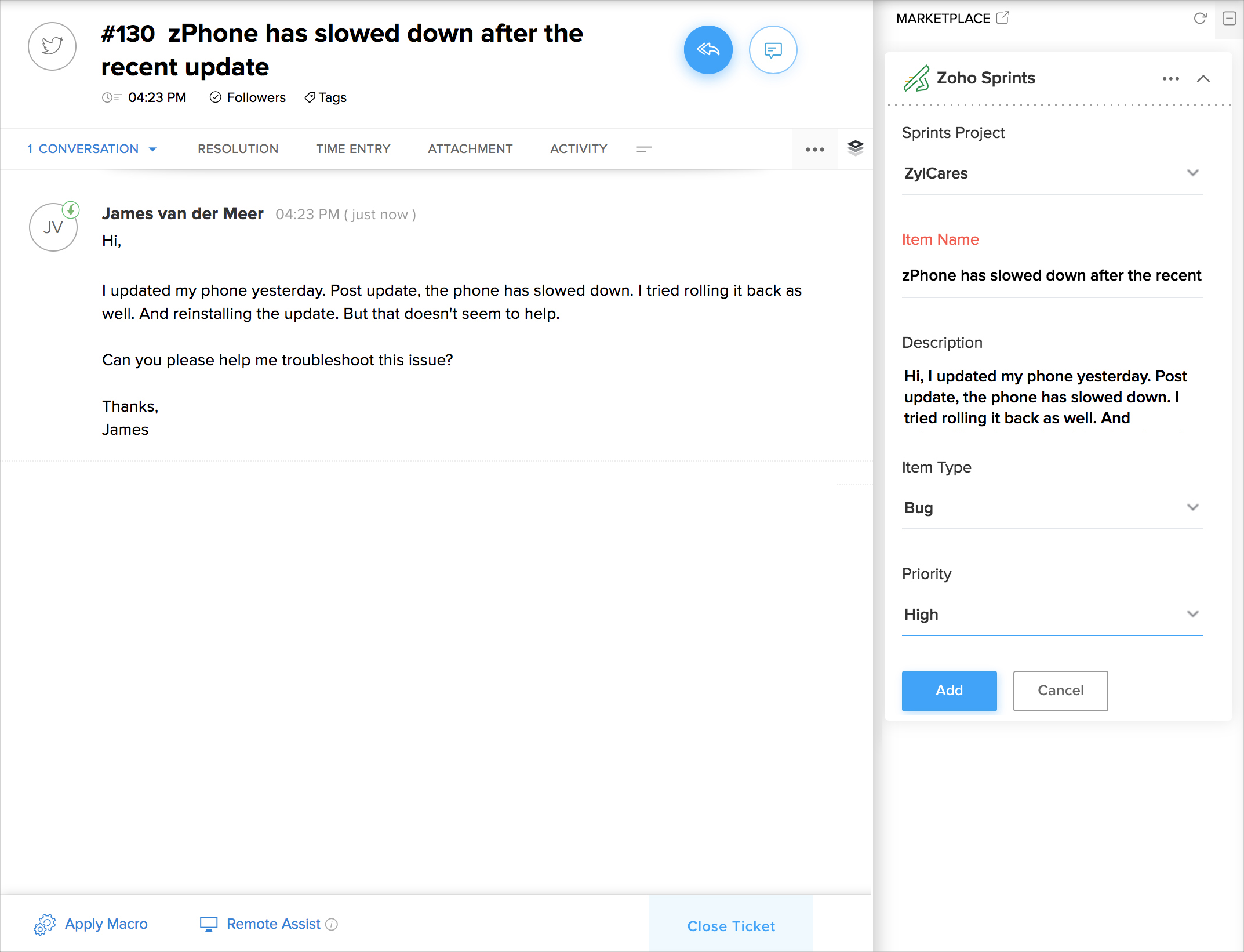 拡張機能のインストール後、Zoho Deskの問い合わせから直接Zoho Sprintsの作業項目を作成できます。