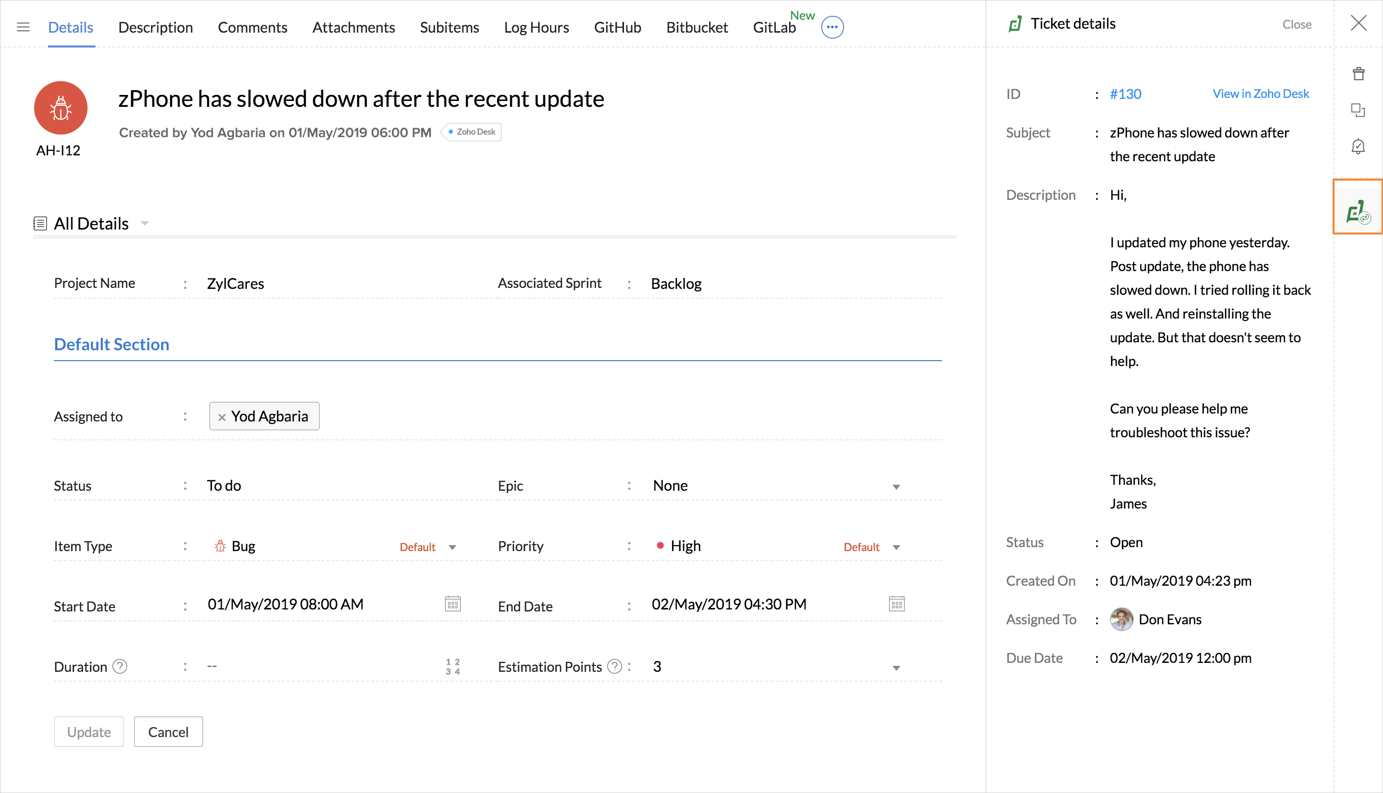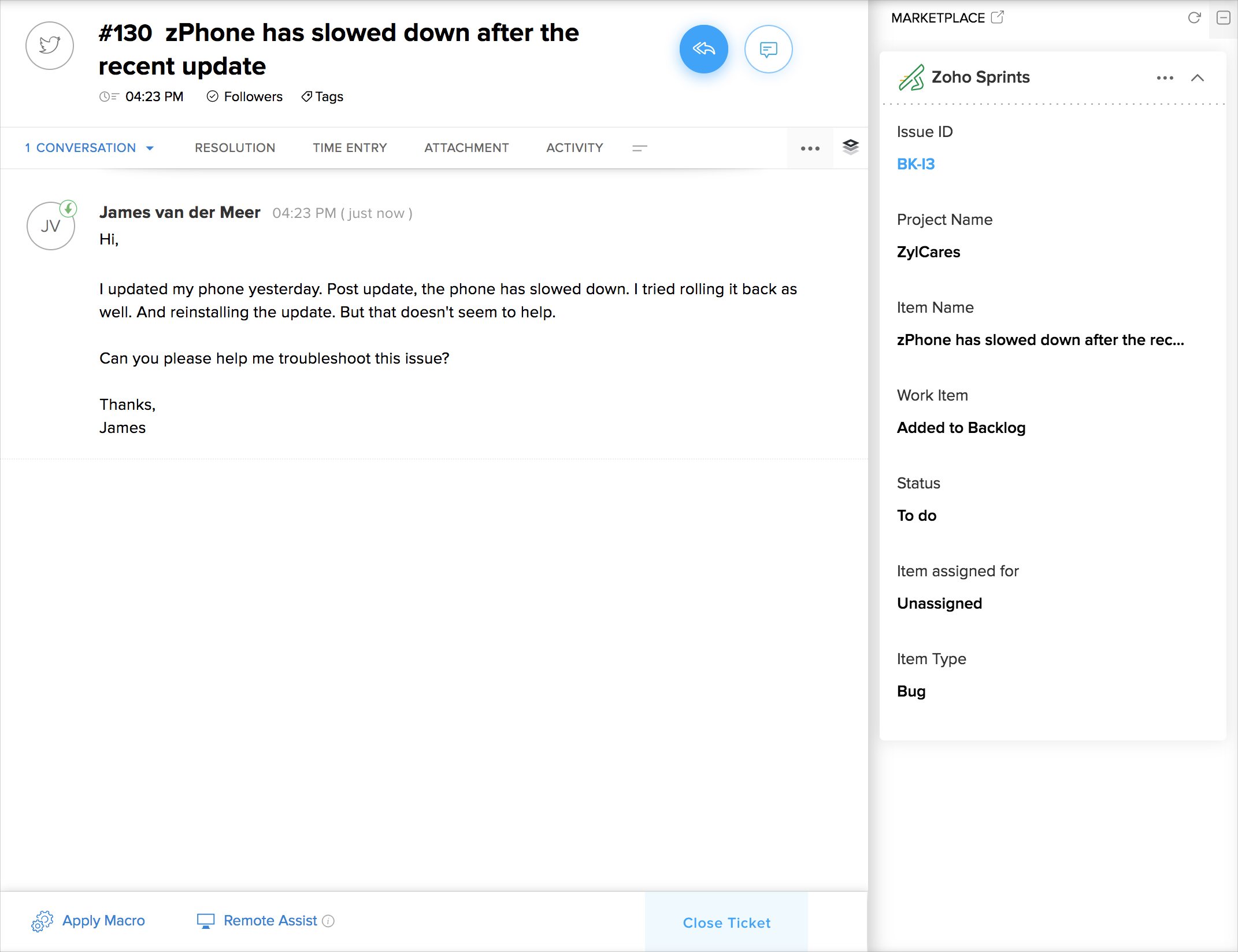 Zoho Sprintsユーザーは、問い合わせのステータス、期限、担当者のステータスといった、作業項目に関連付けられている問い合わせの詳細を表示できます。