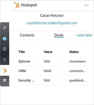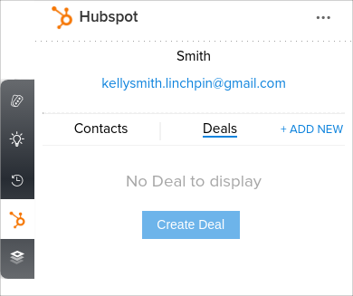 ウィジェットの[Deals](商談)タブをクリックすると、顧客に関連付けられた商談に関する情報を表示できます。問い合わせに関連付けられた商談の詳細情報がHubSpot内に登録されている場合、このタブに表示されます。詳細情報が登録されていない場合は、HubSpotに追加できます。