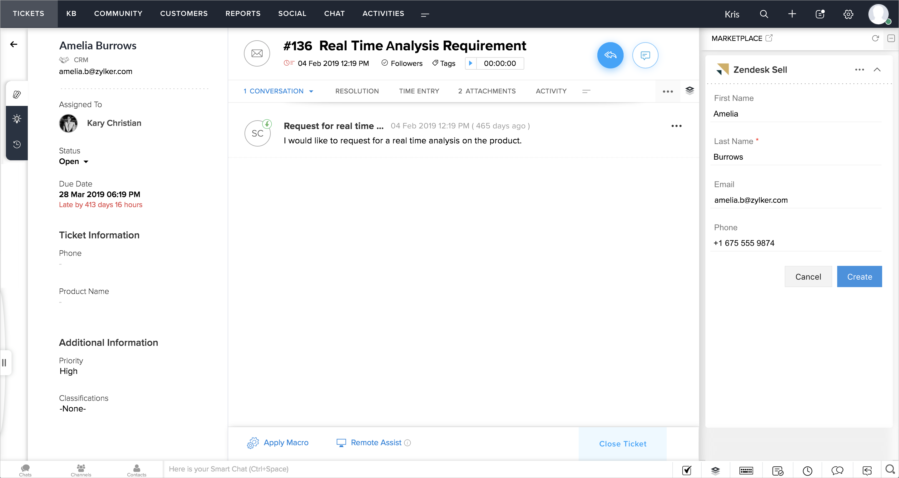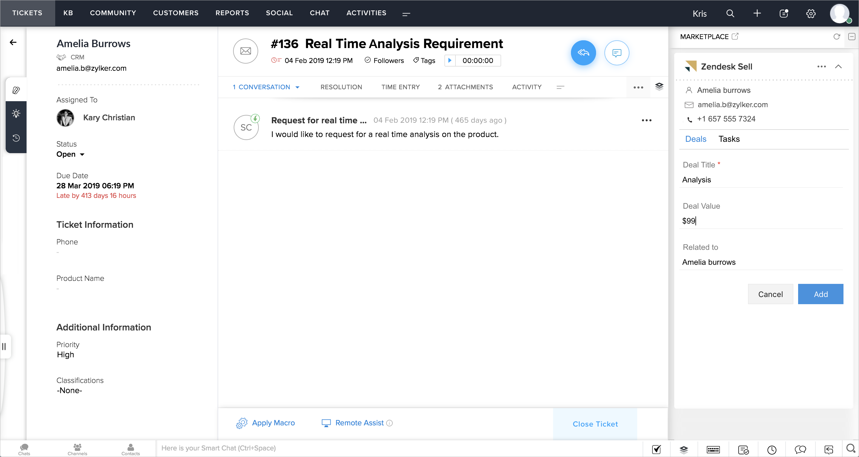 「Zendesk Sell for Zoho Desk」拡張機能を使用すると、顧客の詳細を簡単に把握できるため、Zoho Deskでの問い合わせの優先度付けと管理をより適切に行えます。2つのアプリケーション間で連絡先、商談、タスクを管理できます。Zoho Desk内で、Zendesk Sellのすべての情報を表示できます。Zoho DeskからZendesk Sellに新しい顧客の詳細を追加することもできます。