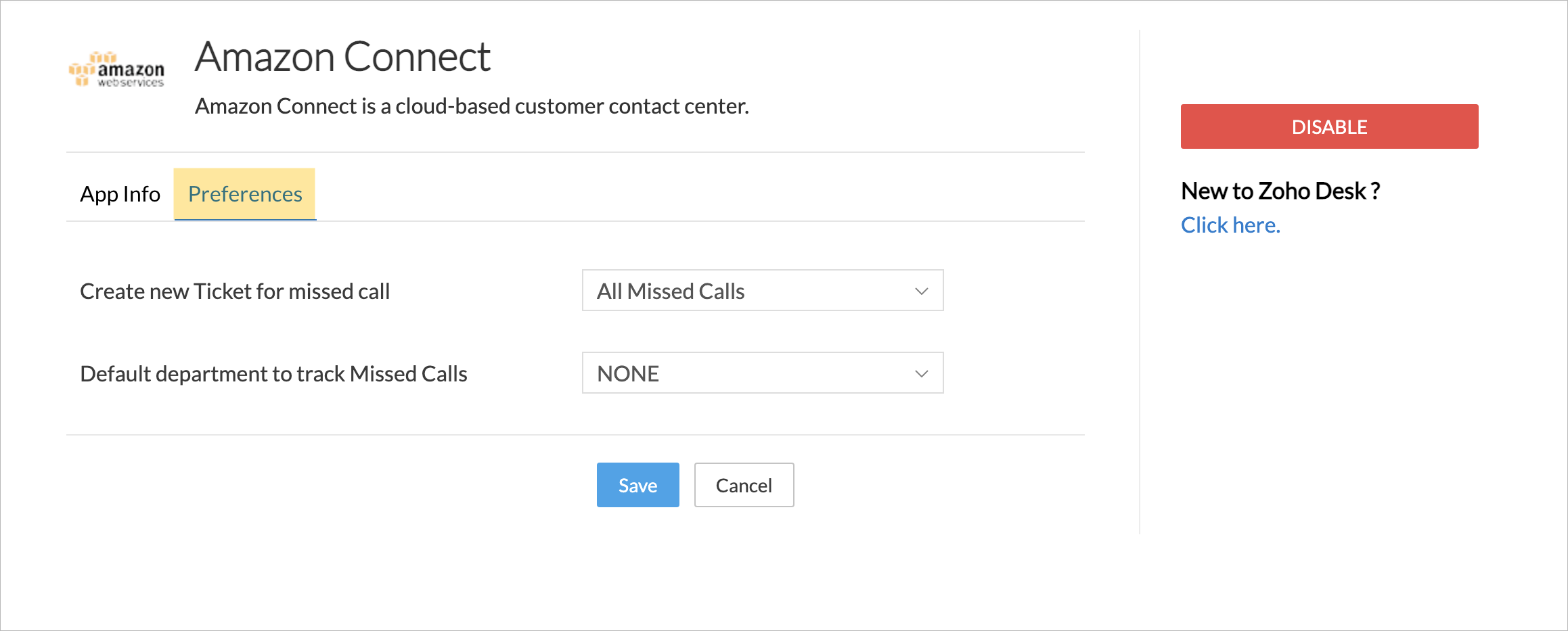 • Amazon Connect連携を無効にすると、Amazon Connect経由でZoho Deskから発信できなくなります。