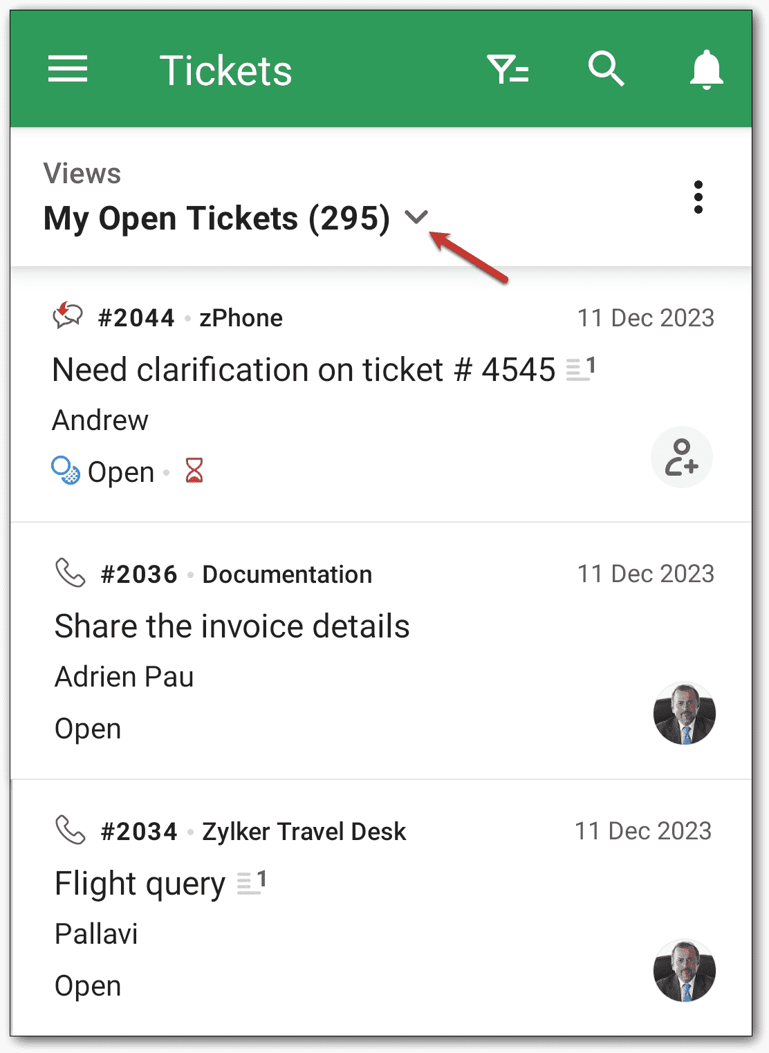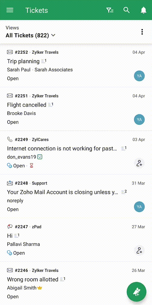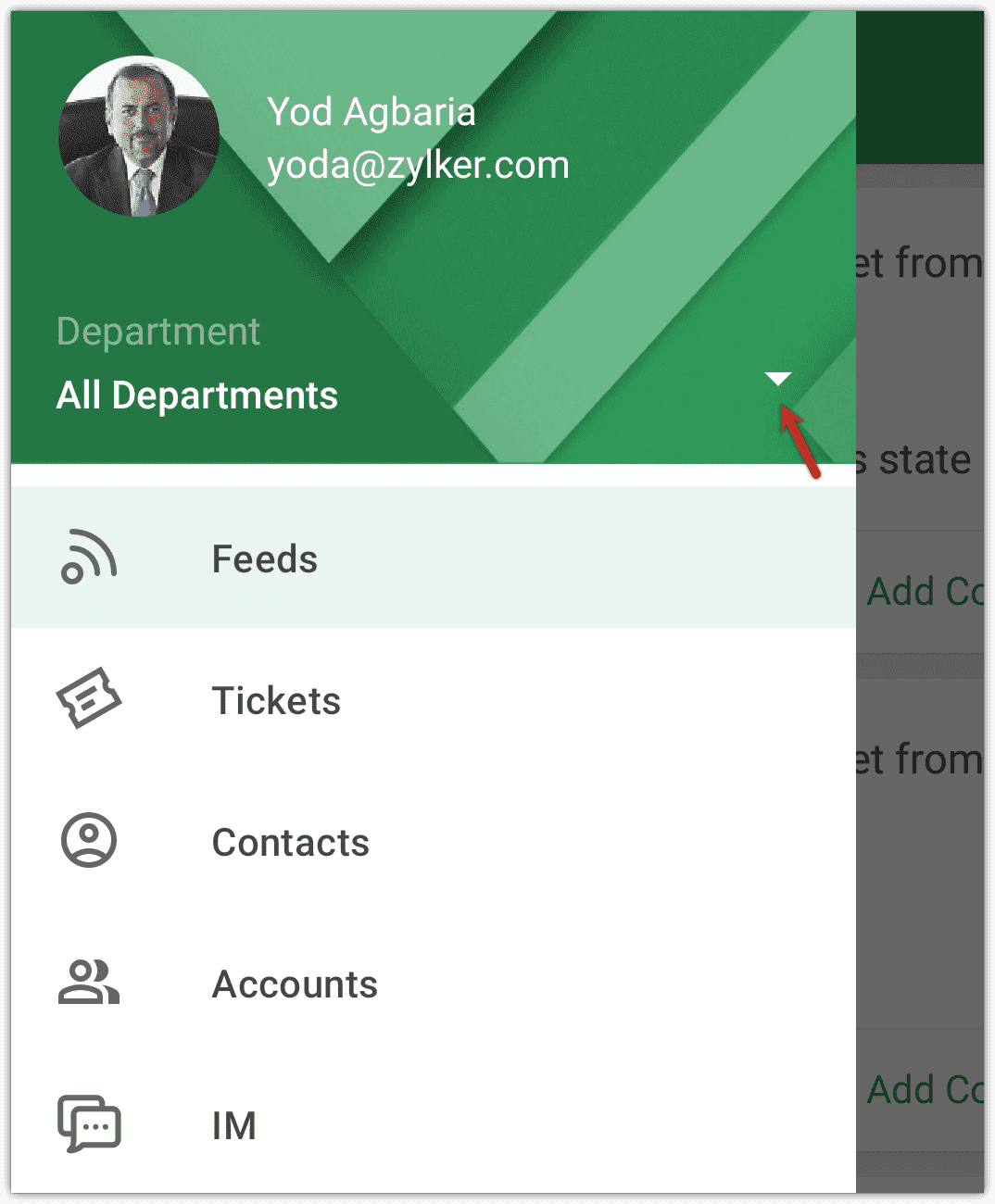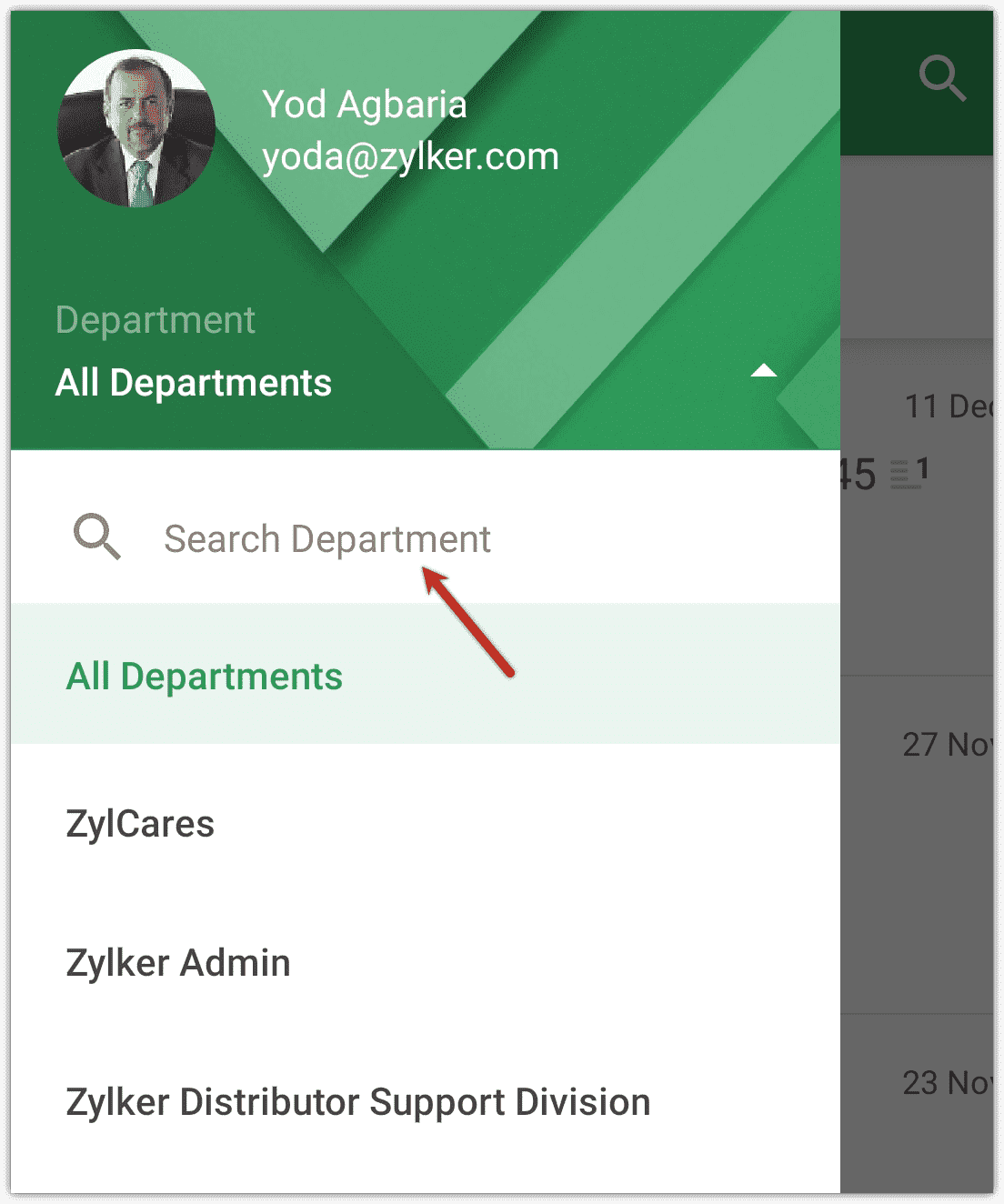 Zoho Deskでは、部門ごとに問い合わせを管理します。モバイルアプリで問い合わせを表示する際に、部門を検索し、対象の部門の問い合わせを表示するよう切り替えることができます。また、特定の問い合わせを検索することも可能です。