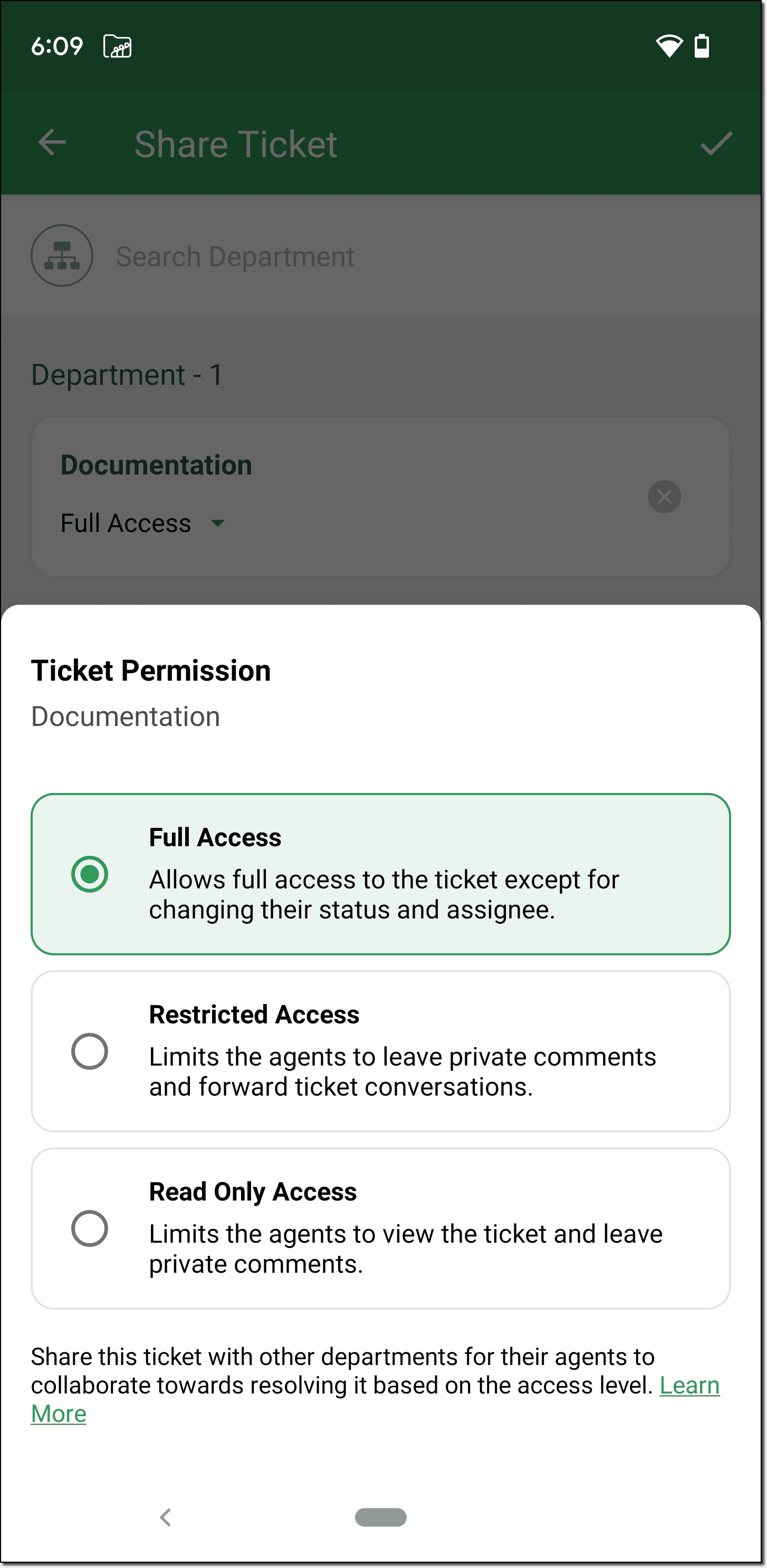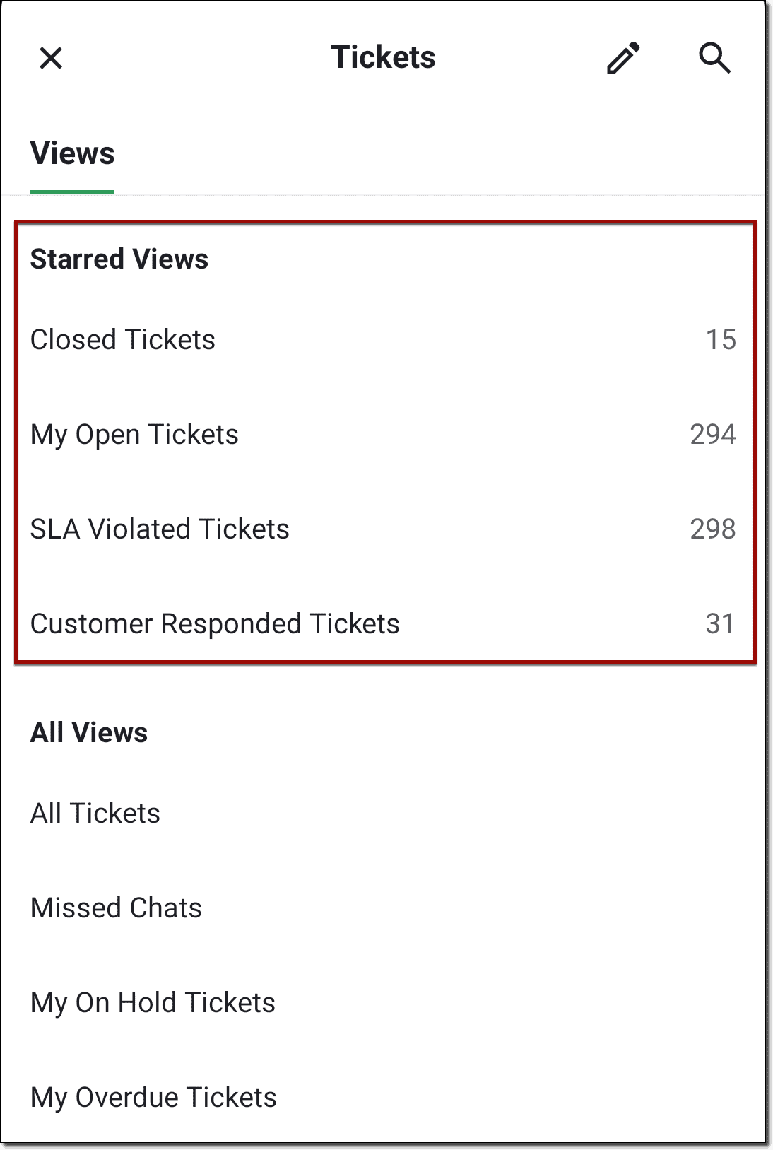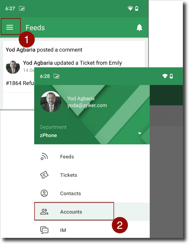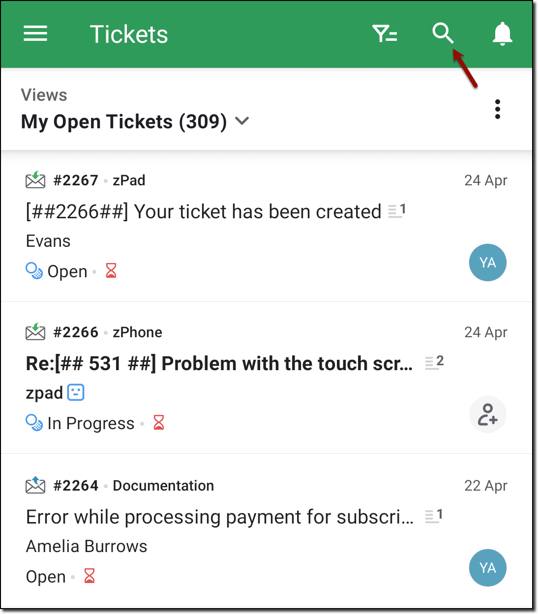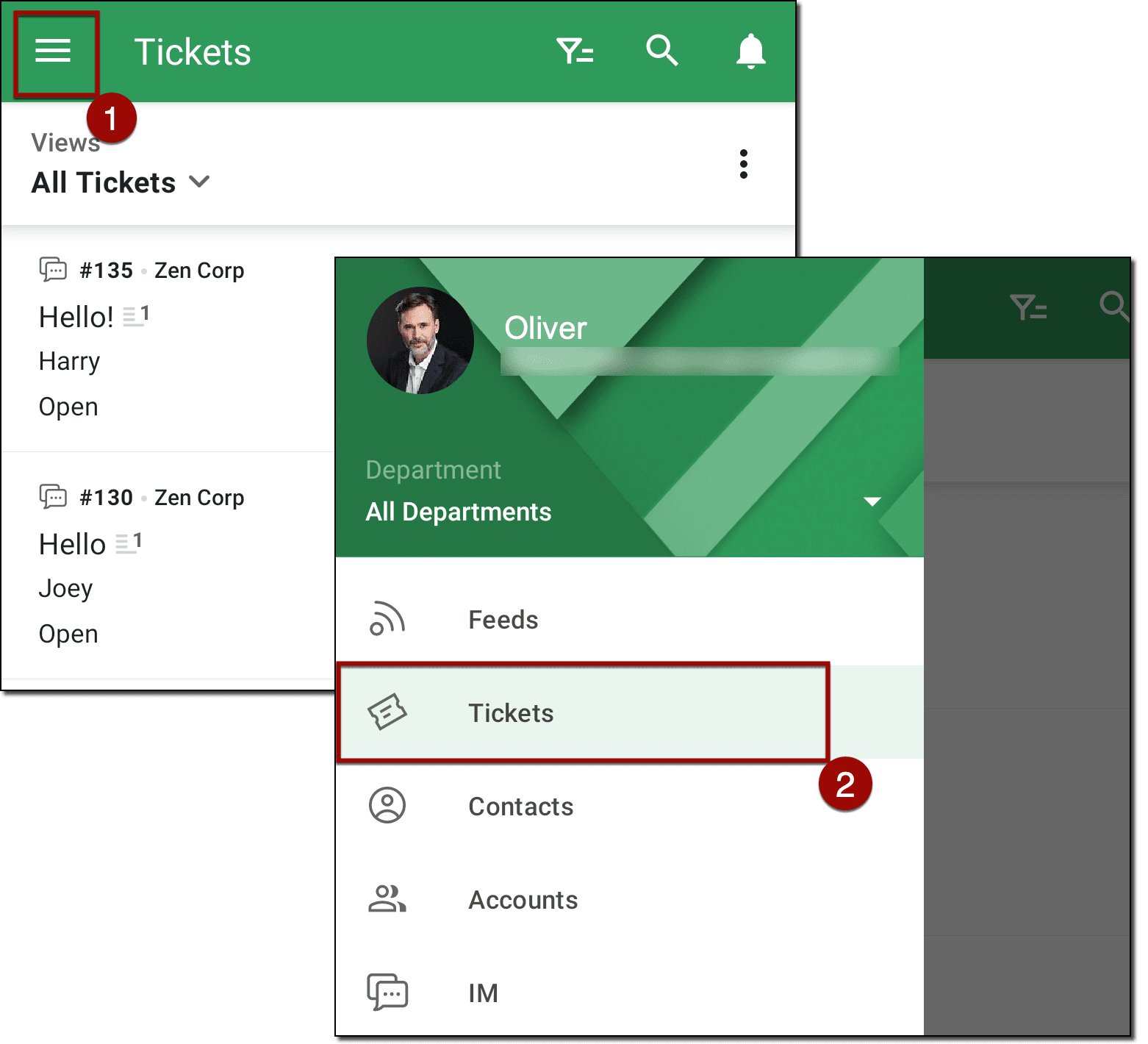 Zoho Deskでは、部門ごとに問い合わせを管理します。モバイルアプリで問い合わせを表示する際に、部門を検索し、対象の部門の問い合わせを表示するよう切り替えることができます。また、特定の問い合わせを検索することも可能です。