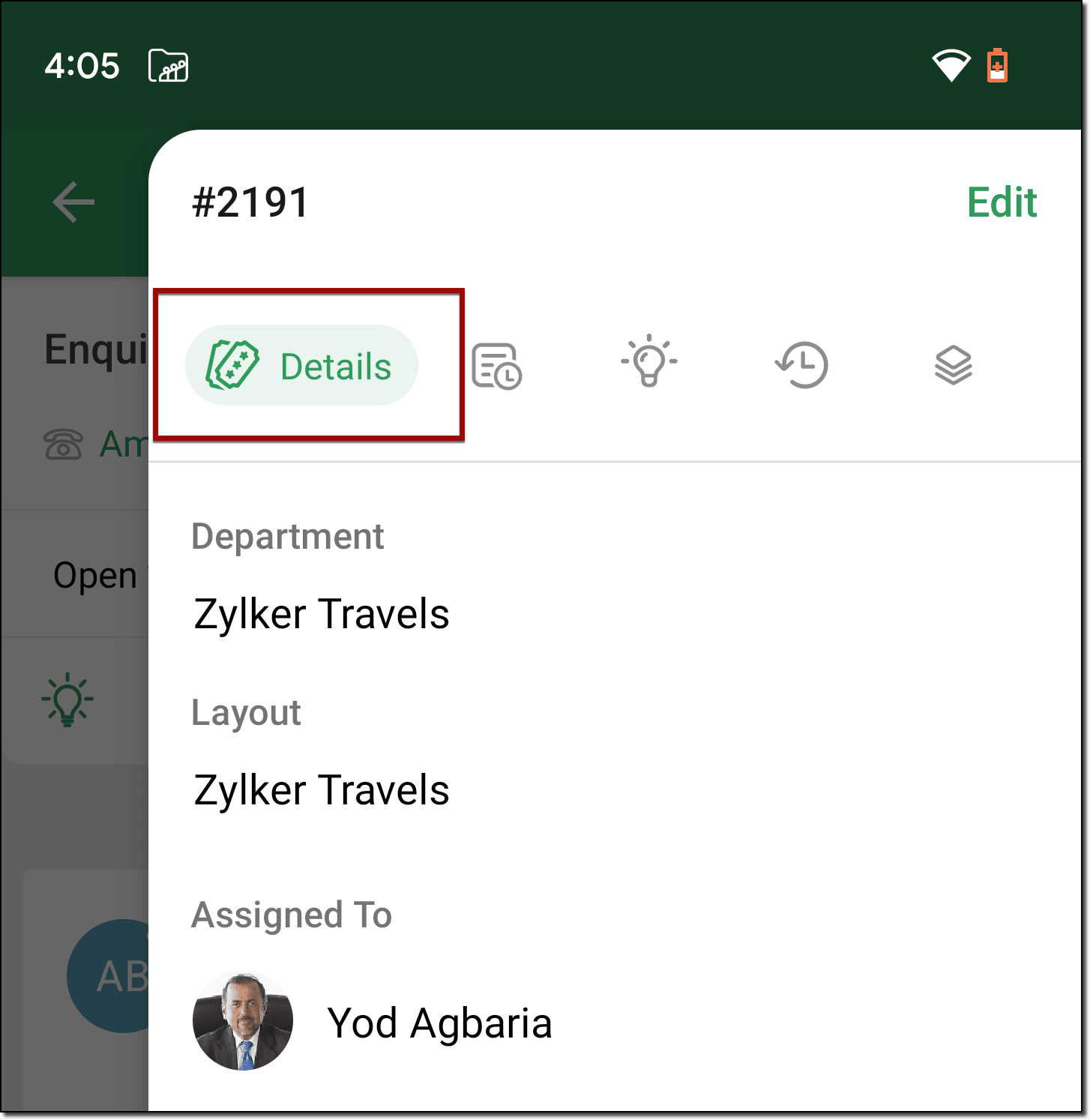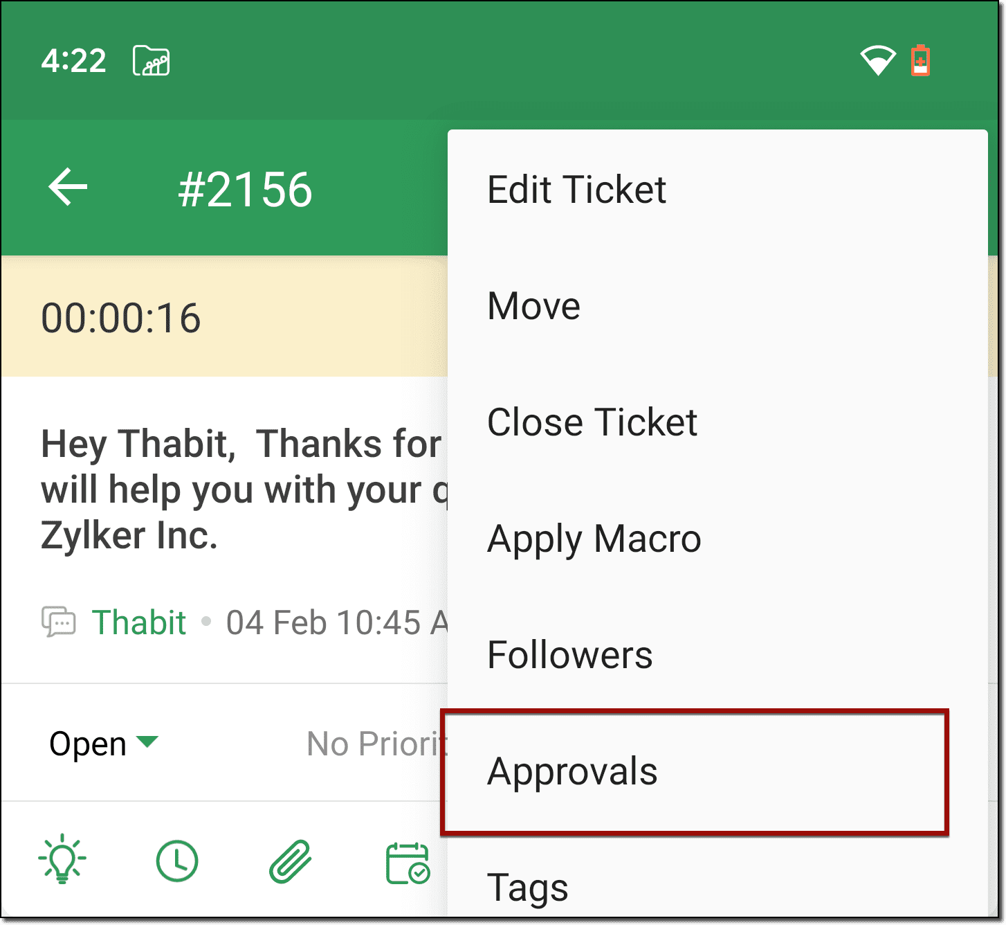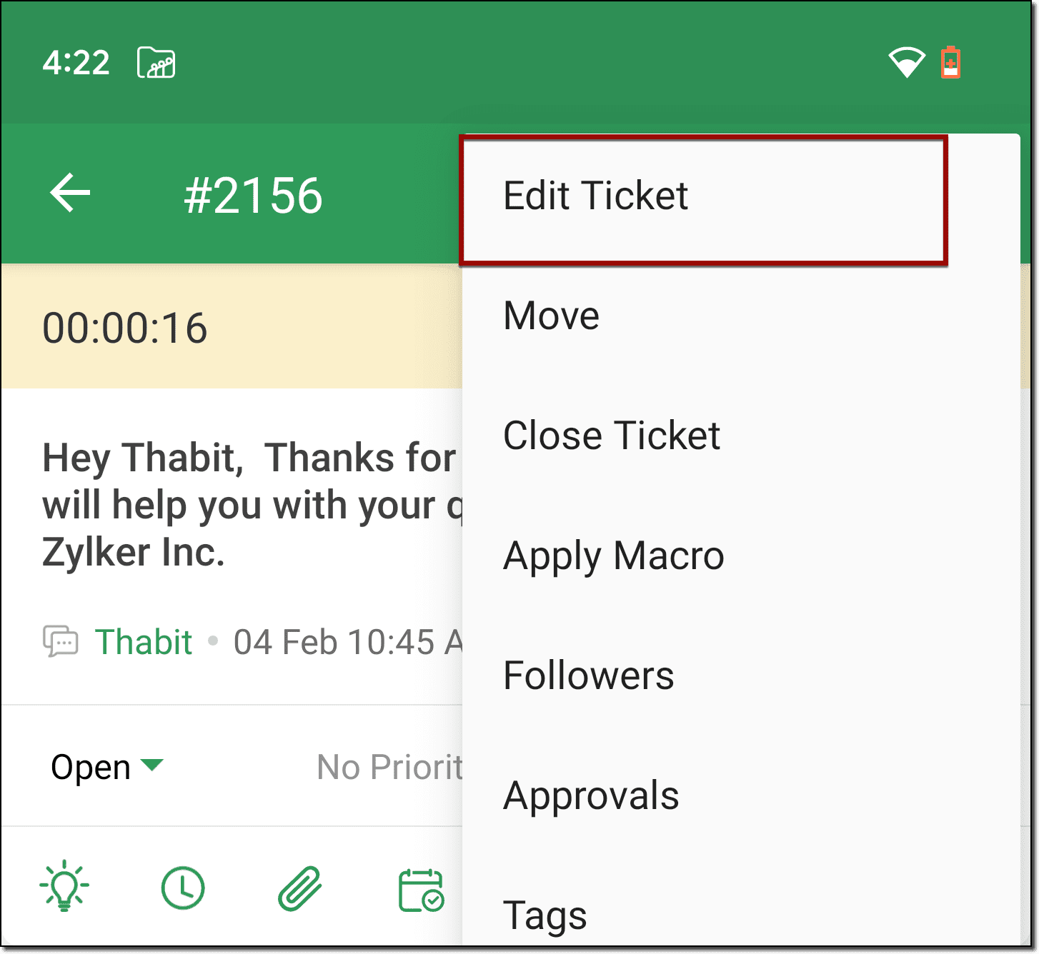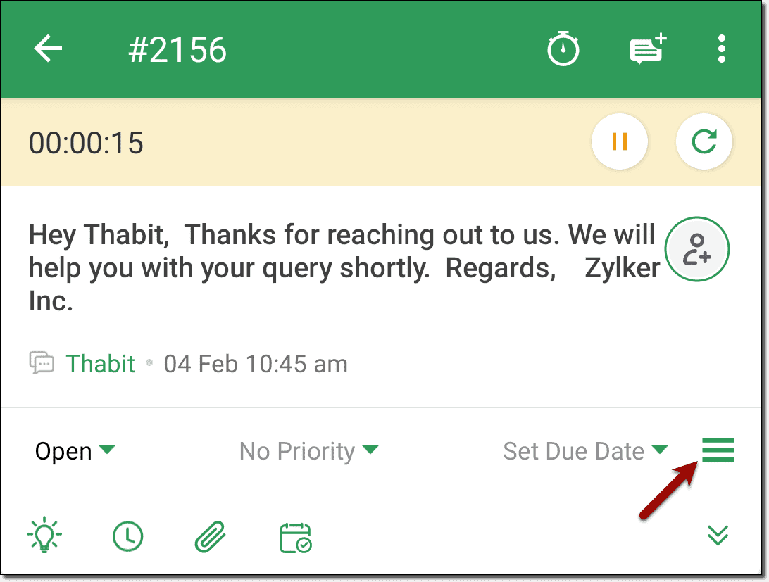 Zoho Deskのモバイルアプリでは、問い合わせの詳細ページの画面右上にある