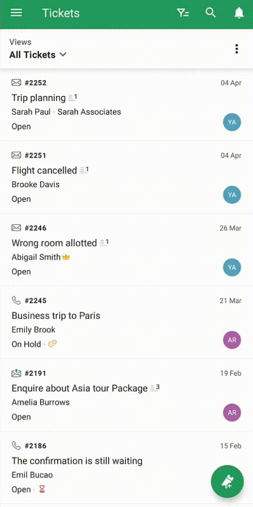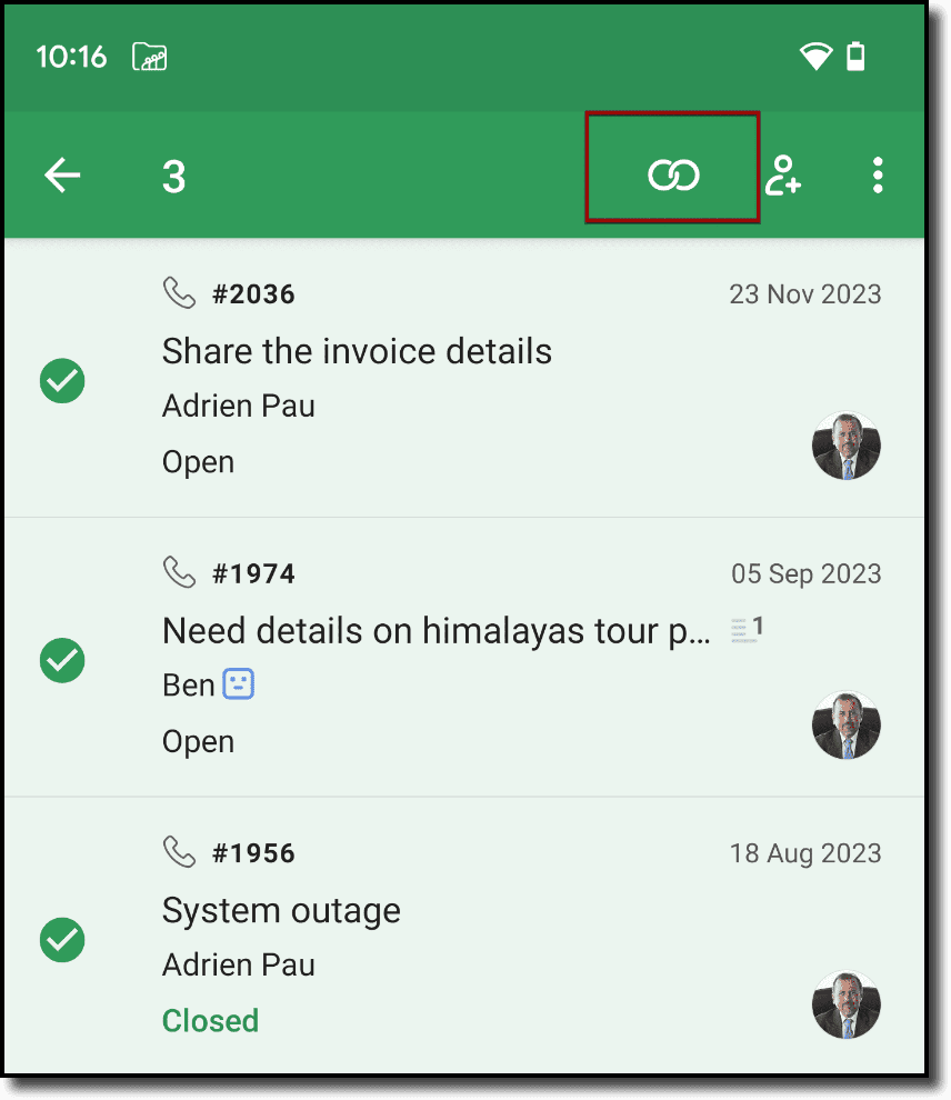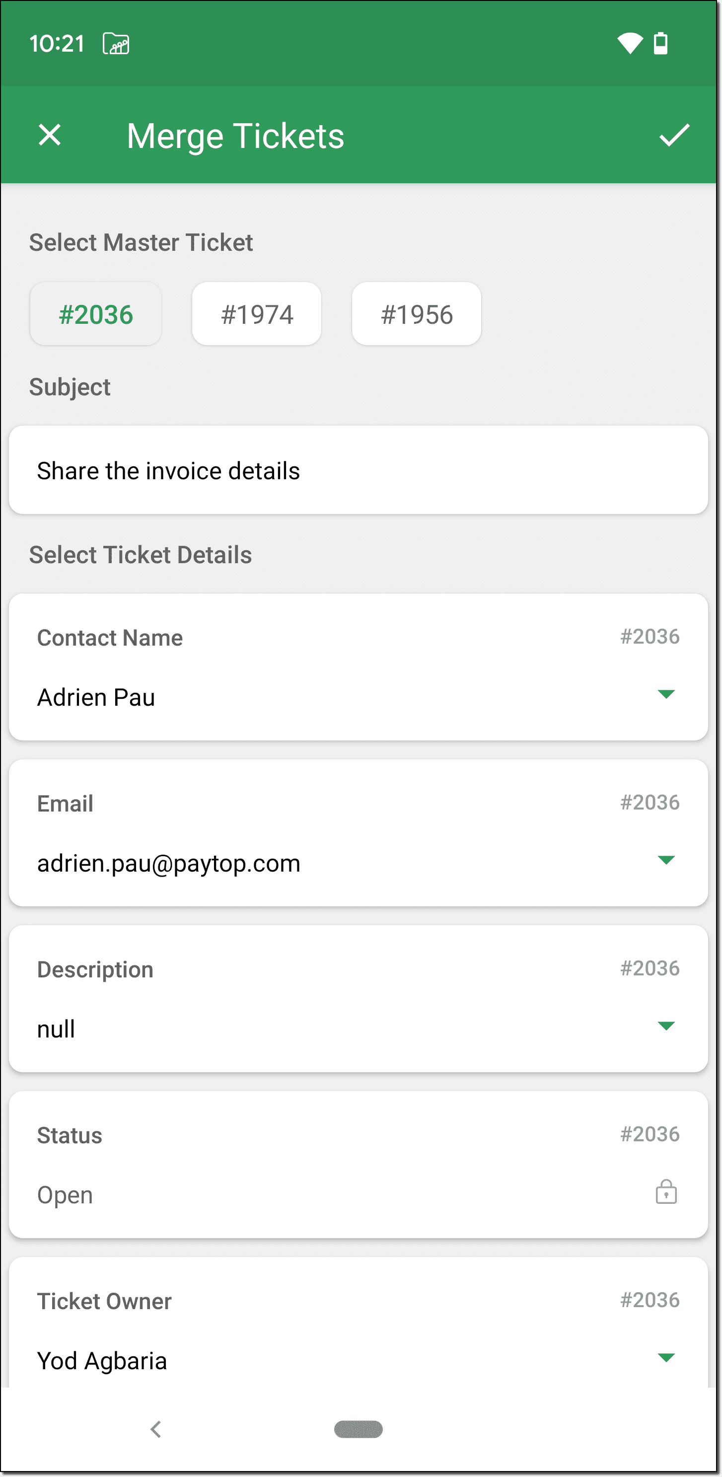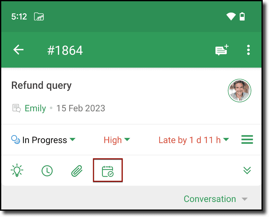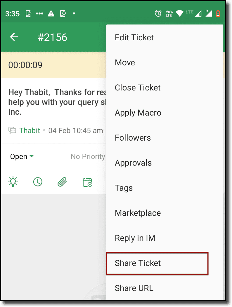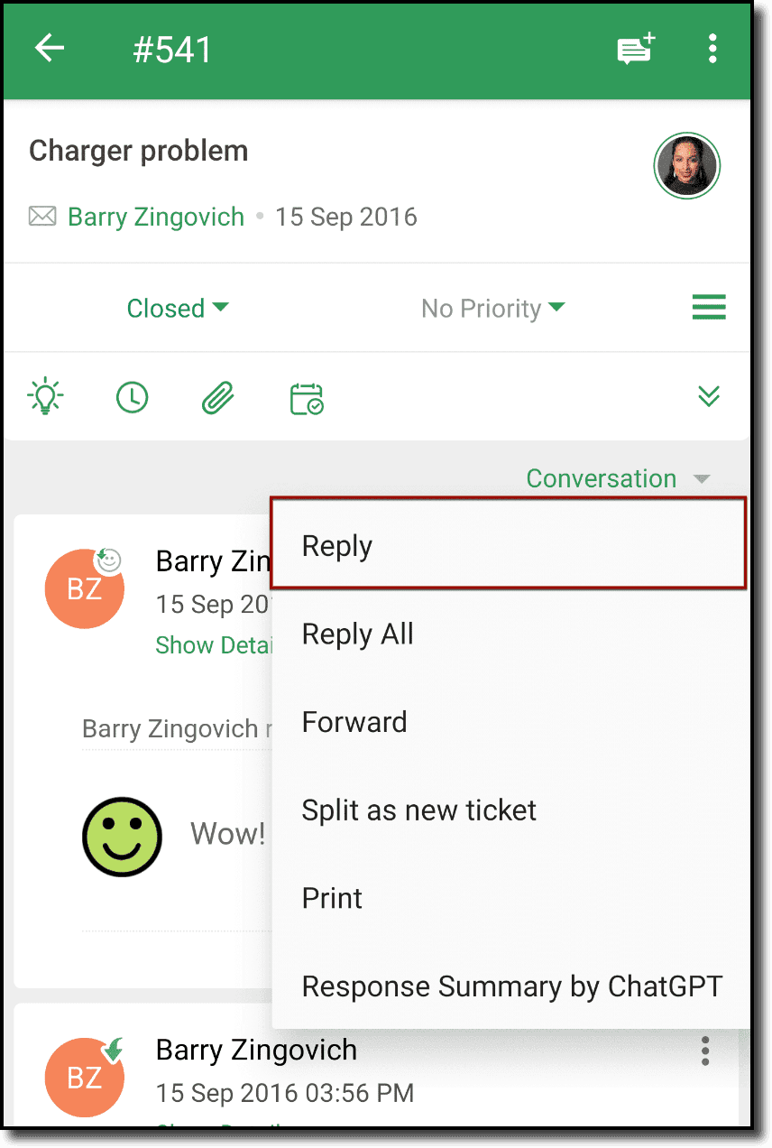 Zoho Deskのモバイルアプリでは、問い合わせの詳細ページの画面右上にある
