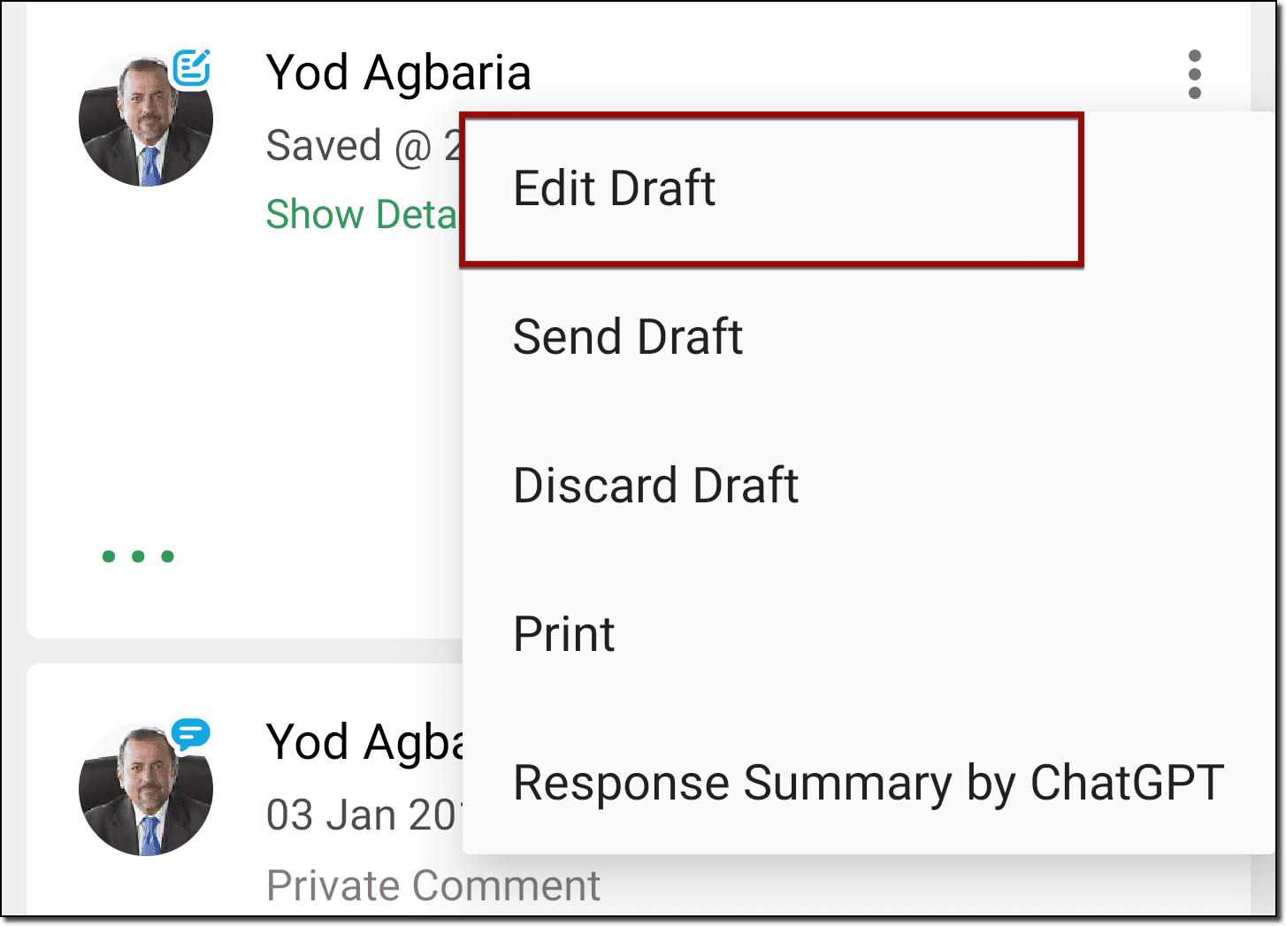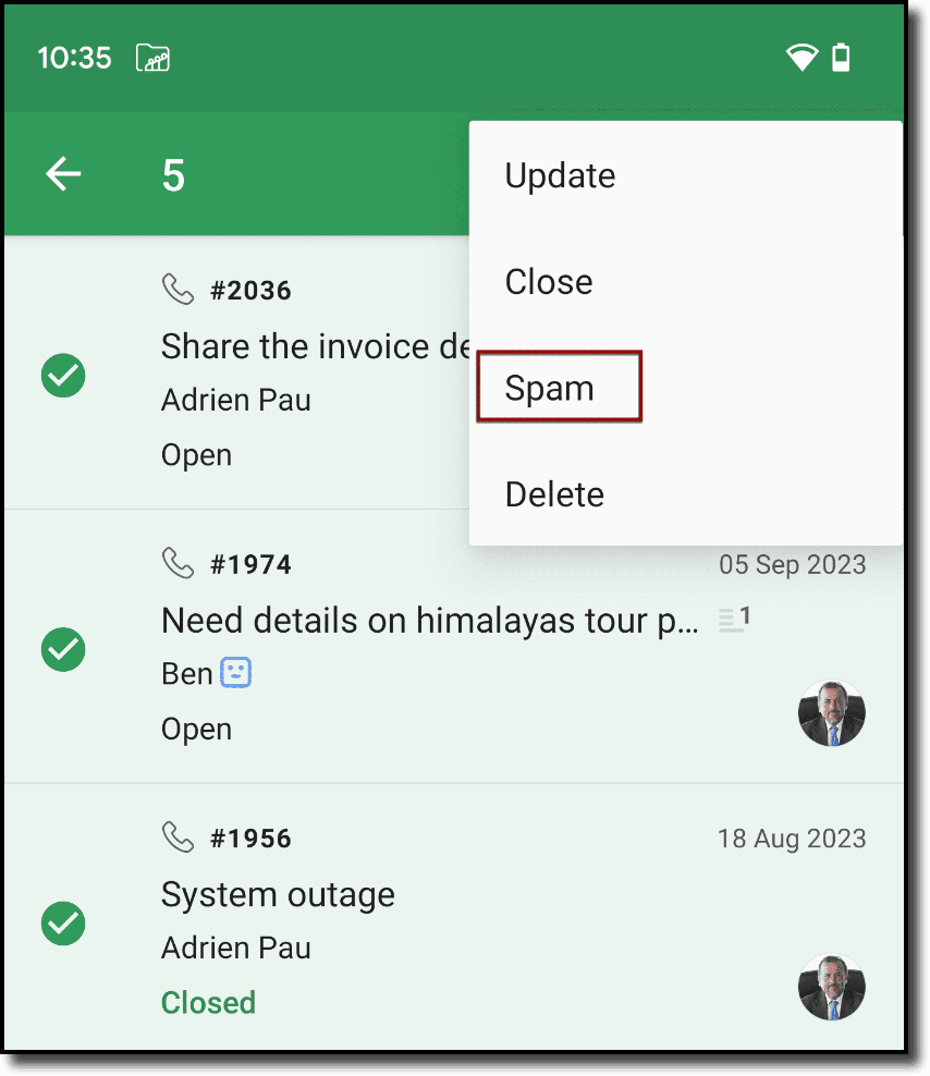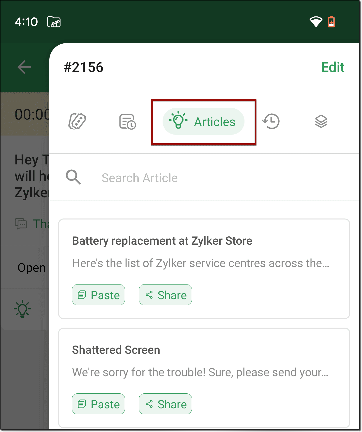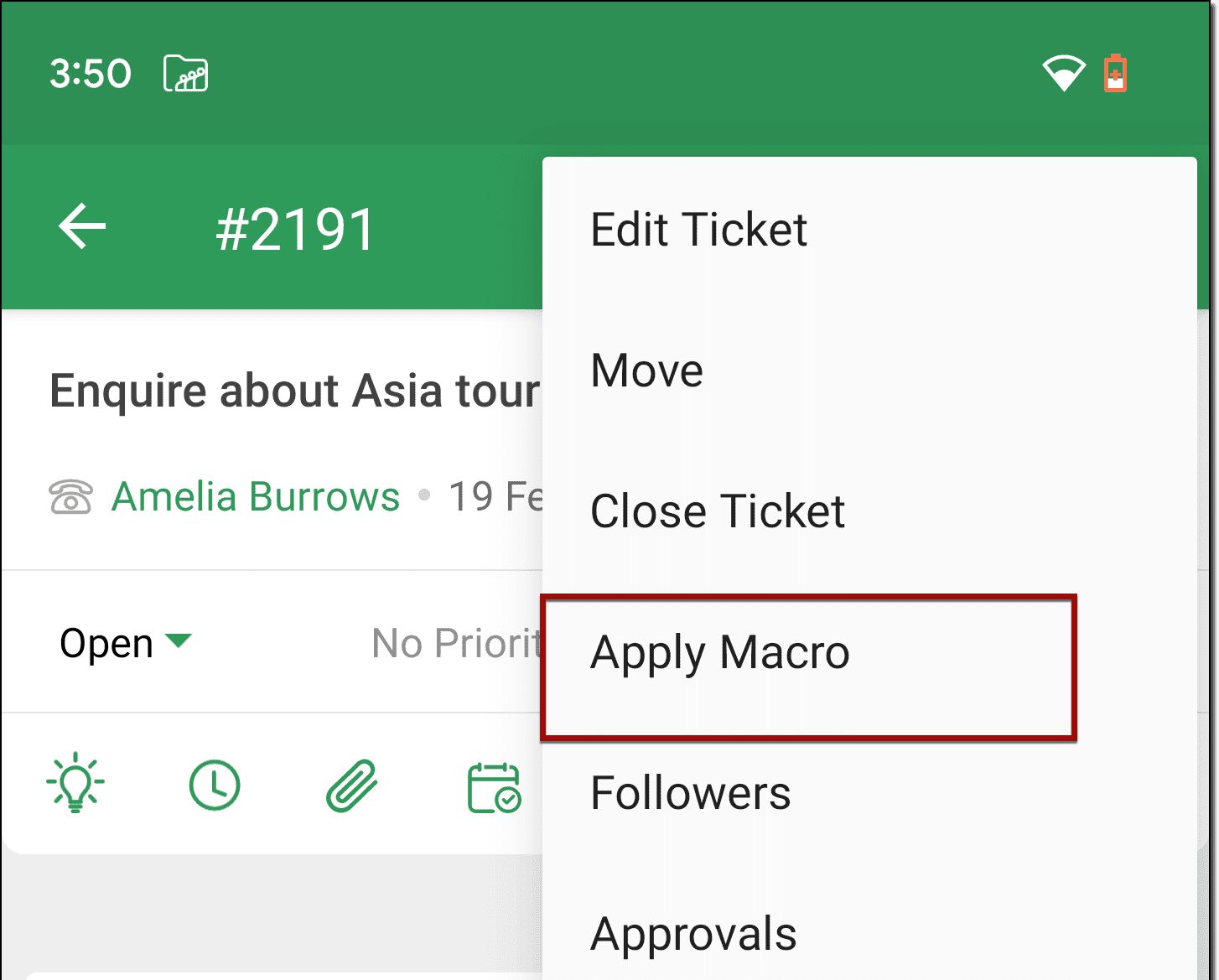 Zoho Deskのモバイルアプリでは、問い合わせの詳細ページの画面右上にある