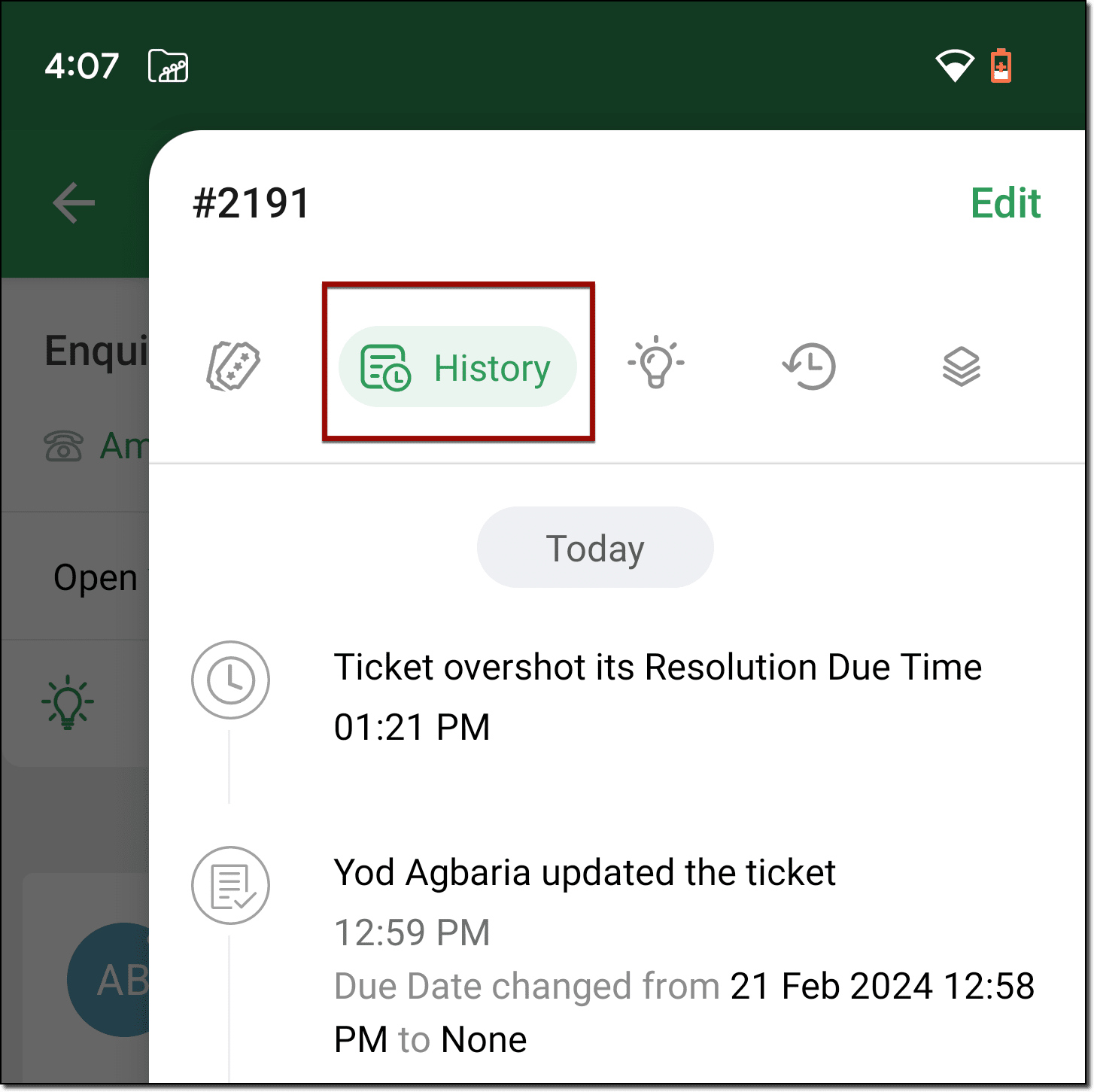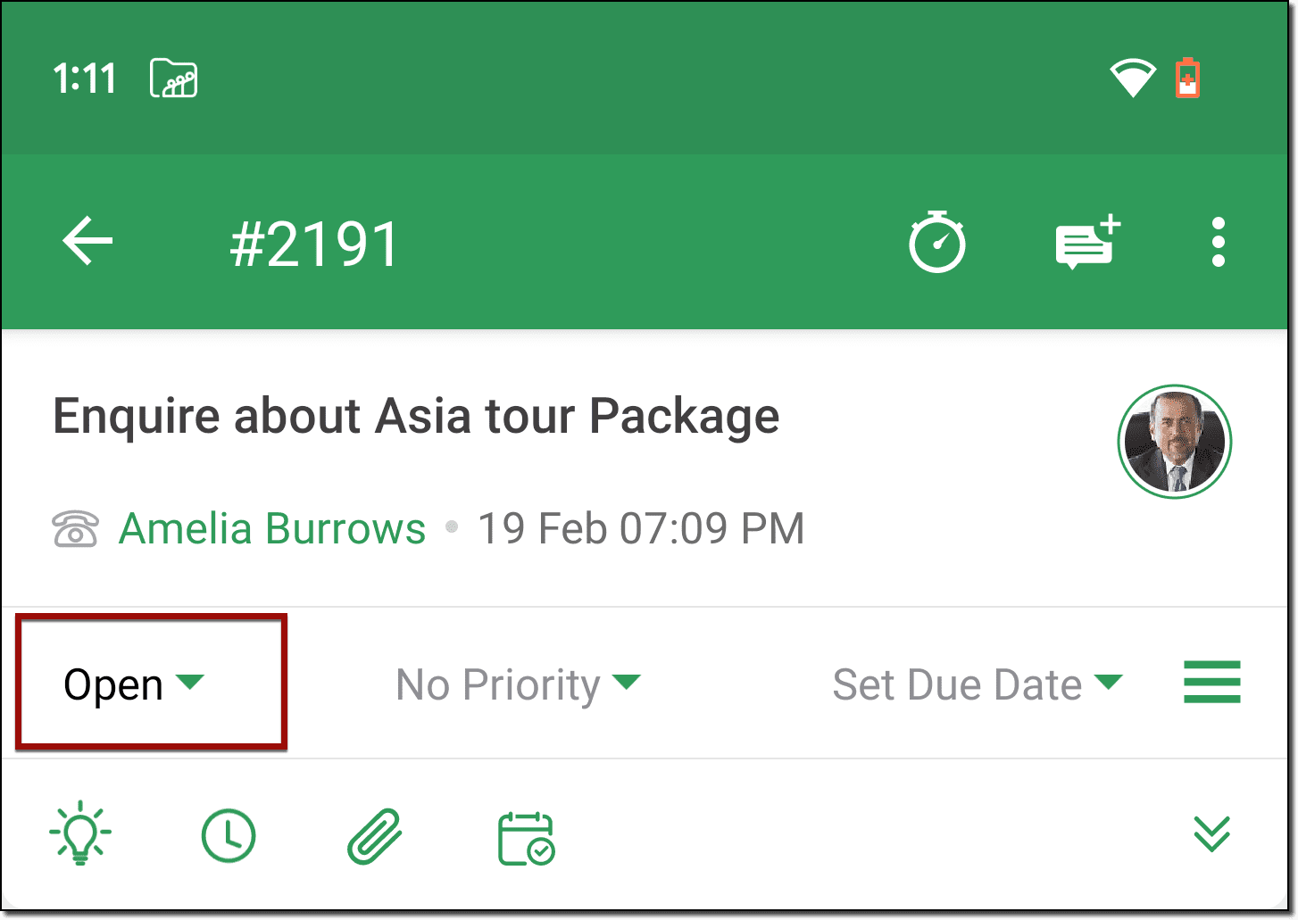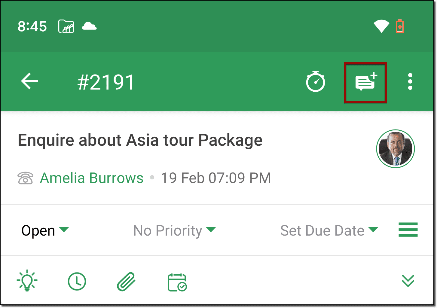 - 問い合わせの詳細ページを開き、活動アイコンをタップします。