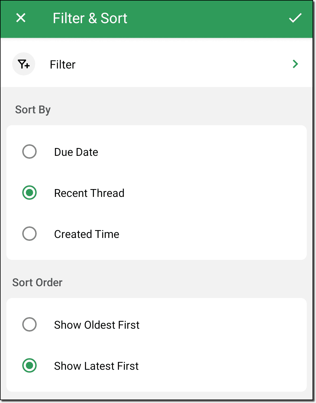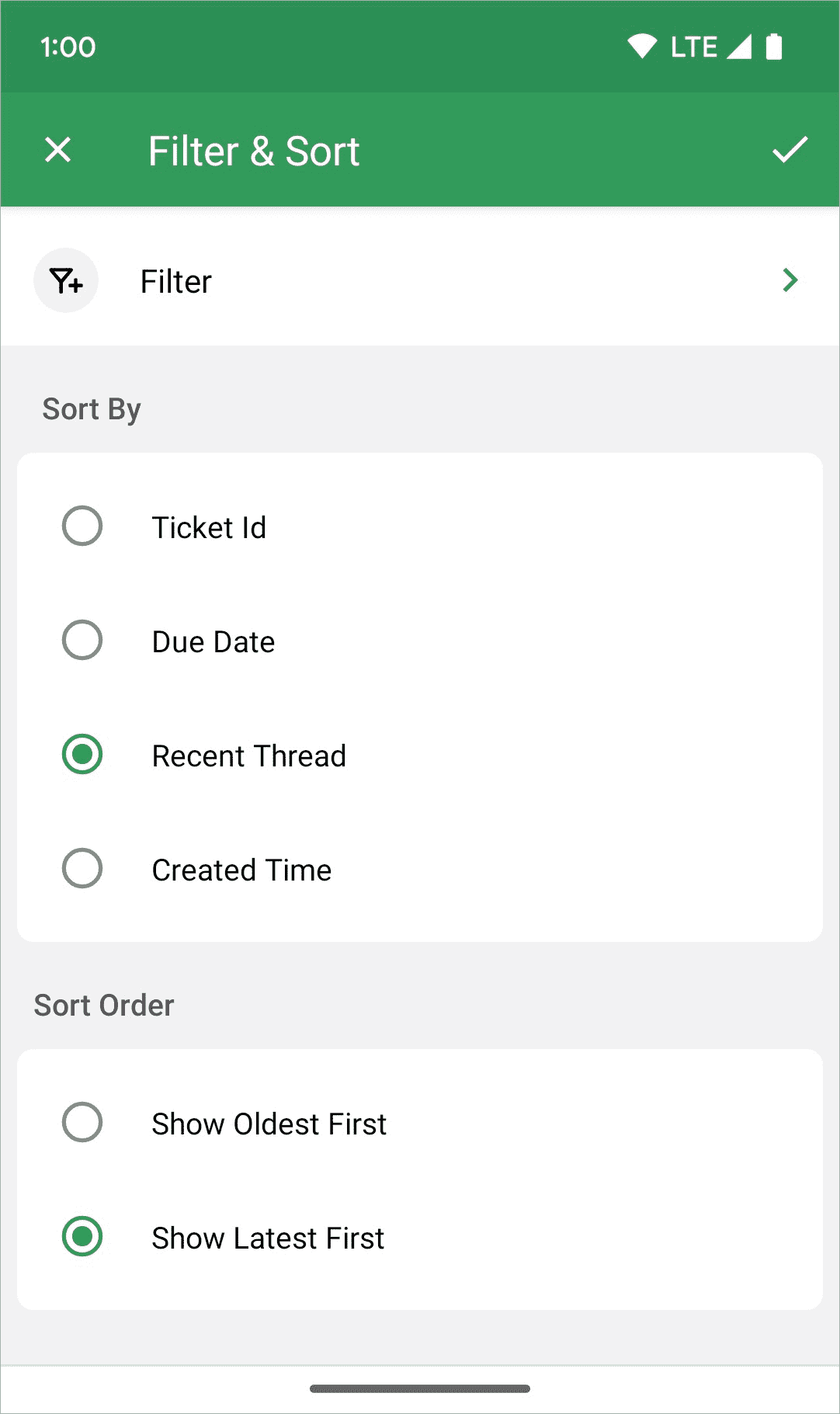 フィルターを用いて条件に当てはまる問い合わせを抽出することができます。また、基準を指定して問い合わせを並べ替えることも可能です。Zoho Deskのモバイルアプリで使用できるフィルターの条件は以下のとおりです。