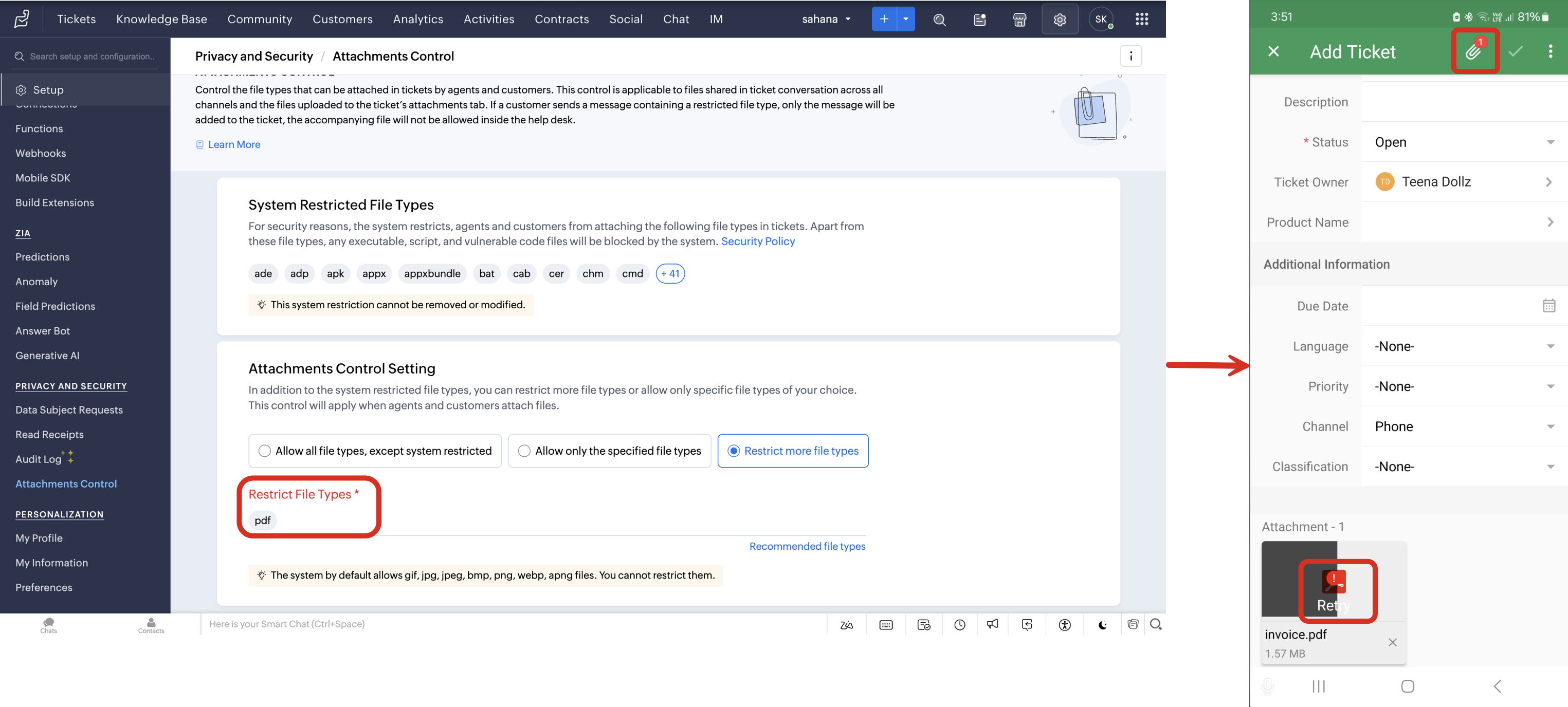 添付ファイルの制限機能では、問い合わせの添付ファイルの形式を制限できます。これにより、組織のシステム管理者は、問い合わせの受信時と送信時の両方において、特定の形式のファイルを許可または制限できます。