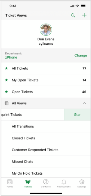特定の問い合わせ一覧をお気に入りとして設定するには、対象の問い合わせ一覧を左にスワイプし、[星を付ける]を選択します。