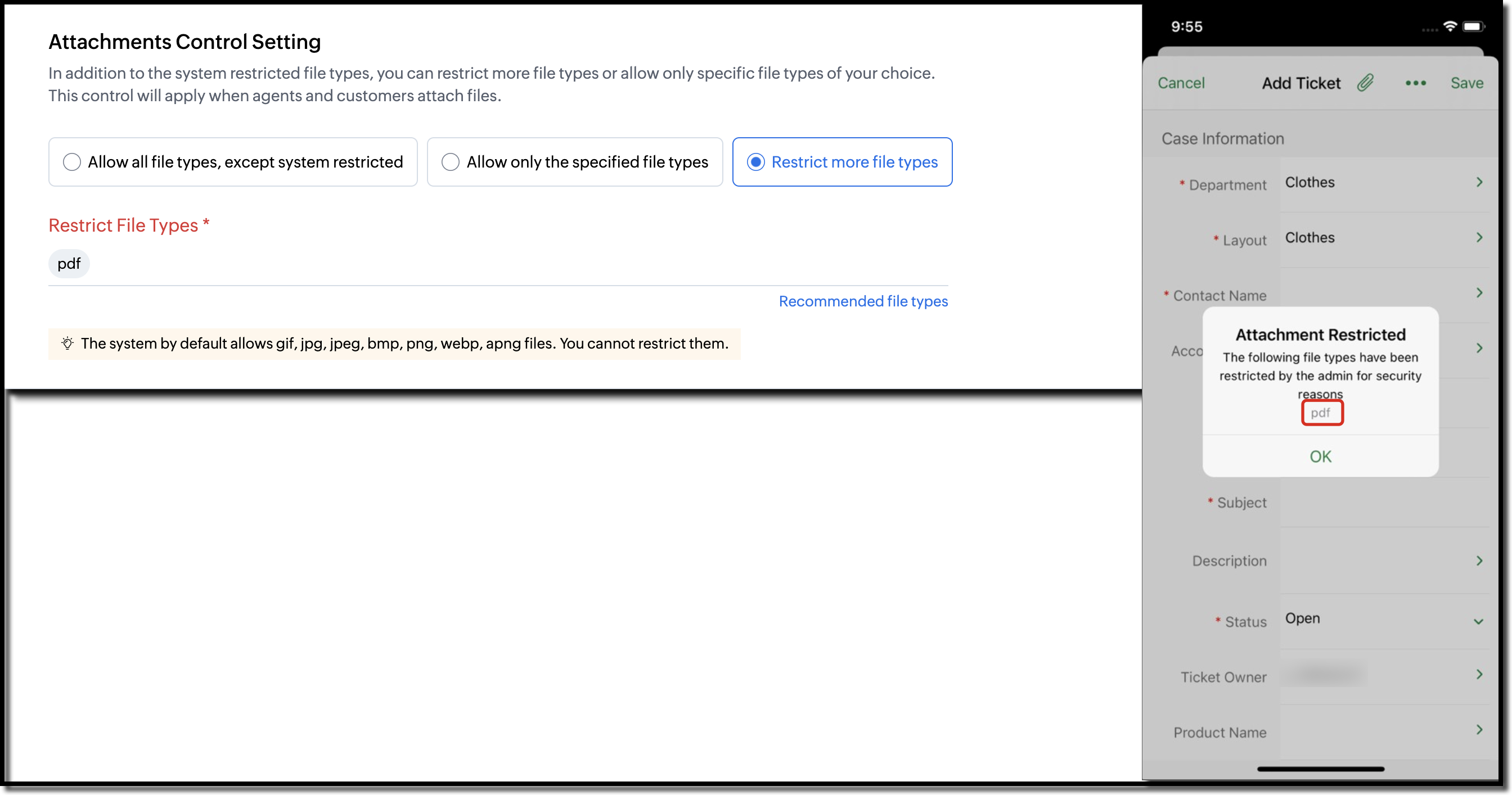 添付ファイルの制限機能では、問い合わせの添付ファイルの形式を制限できます。これにより、組織のシステム管理者は、問い合わせの受信時と送信時の両方において、特定の形式のファイルを許可または制限できます。