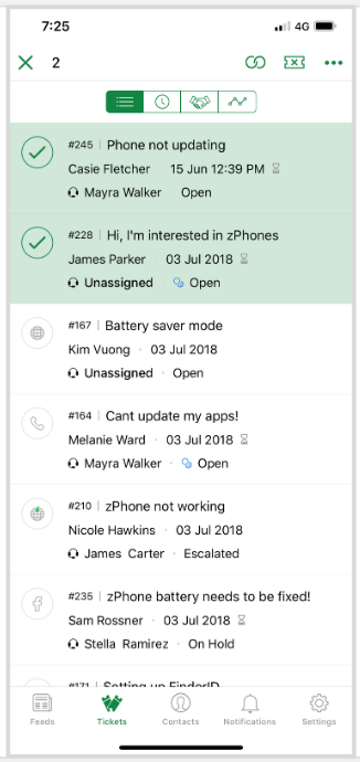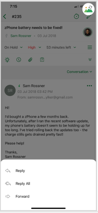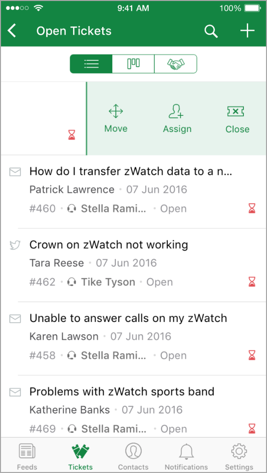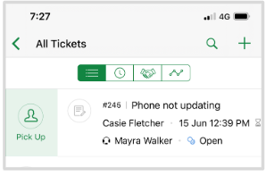 問い合わせを右にスワイプすると自分に割り当てることができます。また、左にスワイプすると、移動/割り当て/完了の操作が可能です。