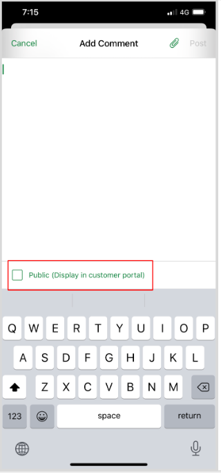 - コメントを公開する場合は、 [公開] のチェックボックスにチェックを入れます。コメントを公開すると、顧客向けのポータルで表示されます。チェックボックスにチェックが入っていない場合、コメントは[非公開]のままになります。非公開のコメントは、自分の組織内のユーザーに対してのみ表示されます(顧客には表示されません)。