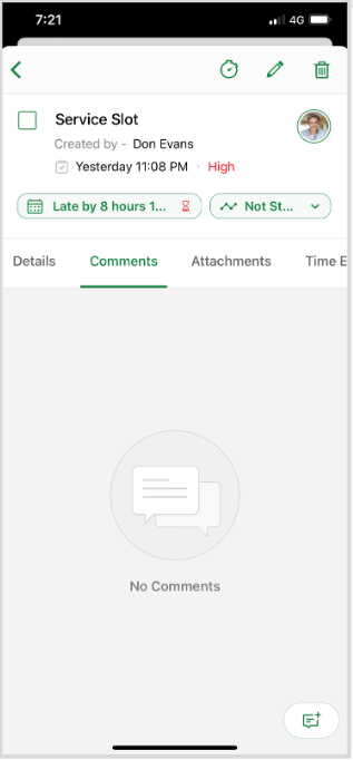- タスクページで [コメント] タブに移動して、ページの右下に表示されているコメント追加用のアイコンをタップします。