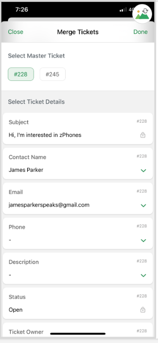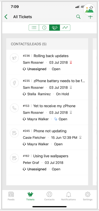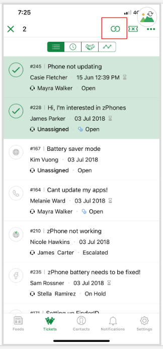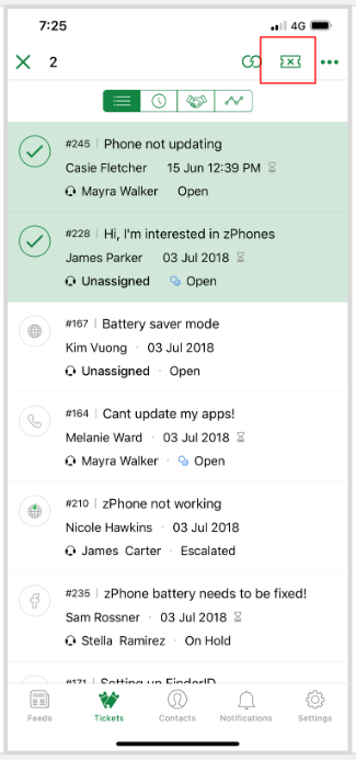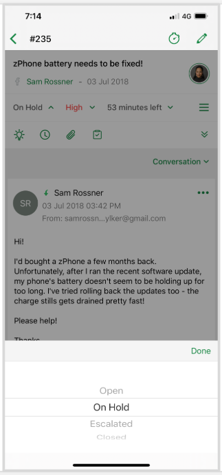 - 未完了の問い合わせで、 [ステータス] の選択リストをタップします。