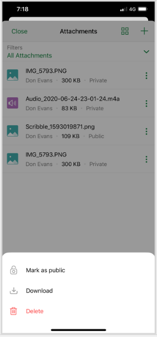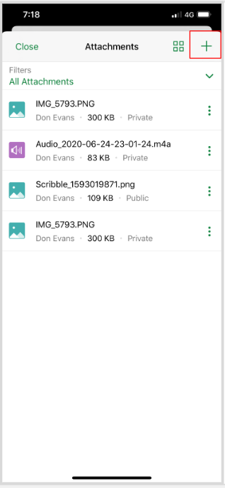 - タスクページで [添付ファイル] タブに移動します。ページの右下に表示されている添付ファイルの追加アイコンをタップします。