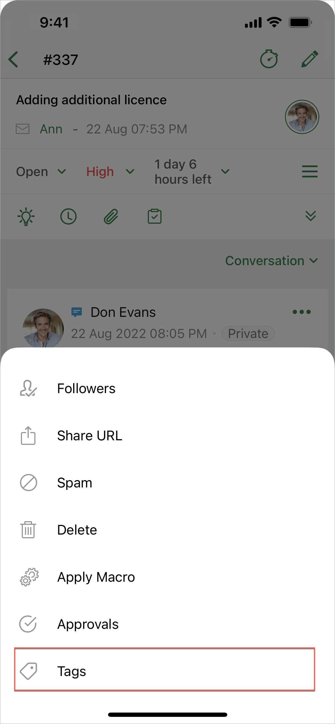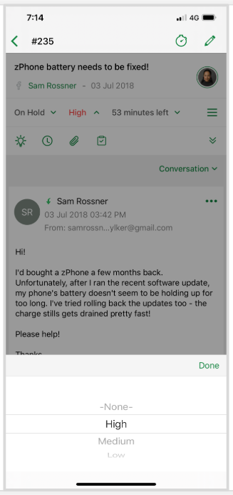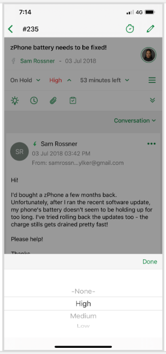 - 未完了の問い合わせで、 [優先度] の選択リストをタップします。