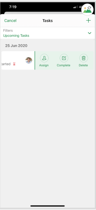 - タスクページで、タスクを左にスワイプすると、タスクの処理に関するメニューが表示されます。