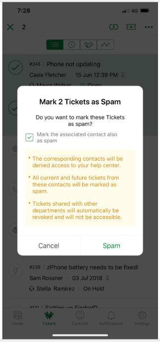 問い合わせの下部にある3点マークのアイコン(その他の操作)を使用して、問い合わせのスパム設定や、問い合わせの削除が可能です。
