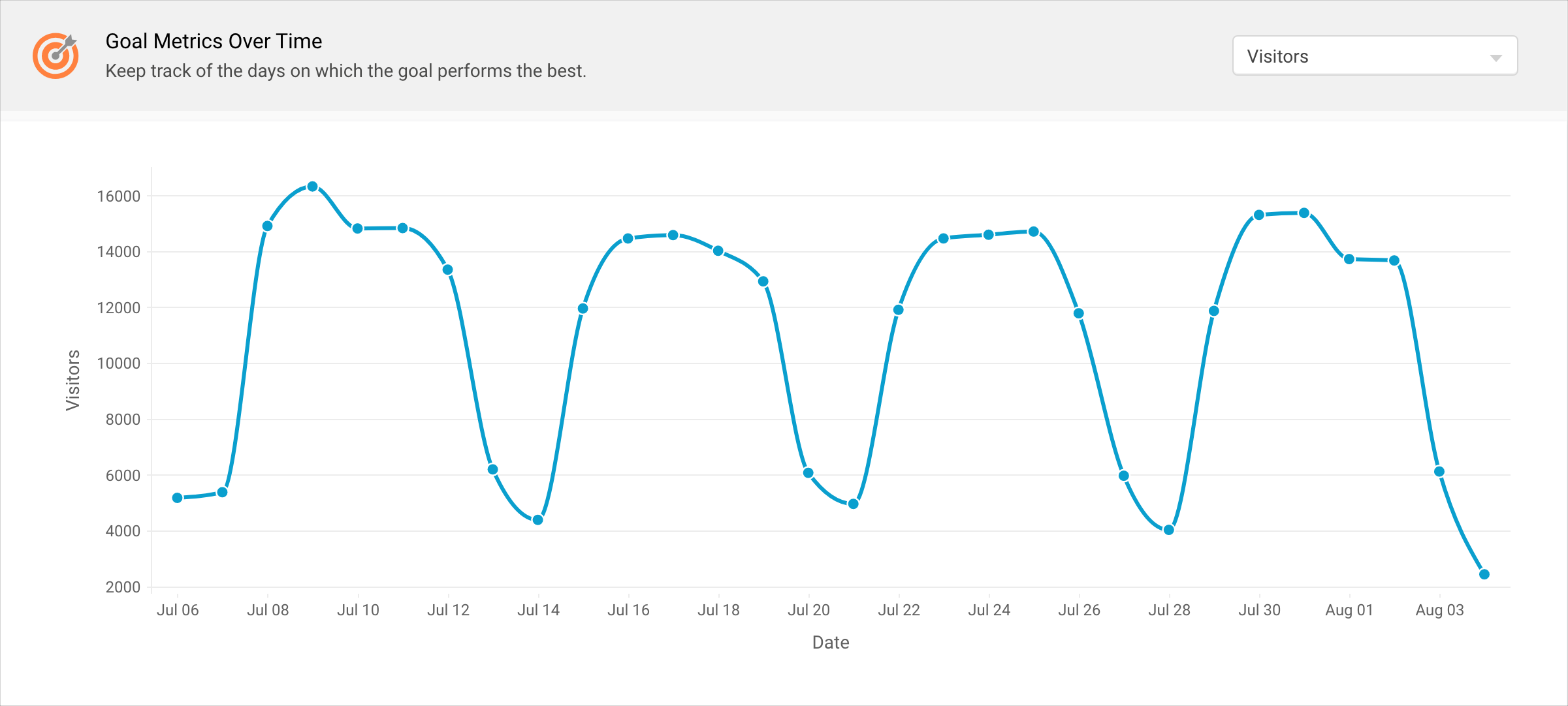 このウィジェットでは、一定期間におけるコンバージョン数、コンバージョン率、訪問者数がグラフで表示されます。メニューから、これら3つの指標のいずれかを選択できます。また、日付の選択画面で日付の範囲を変更することもできます。