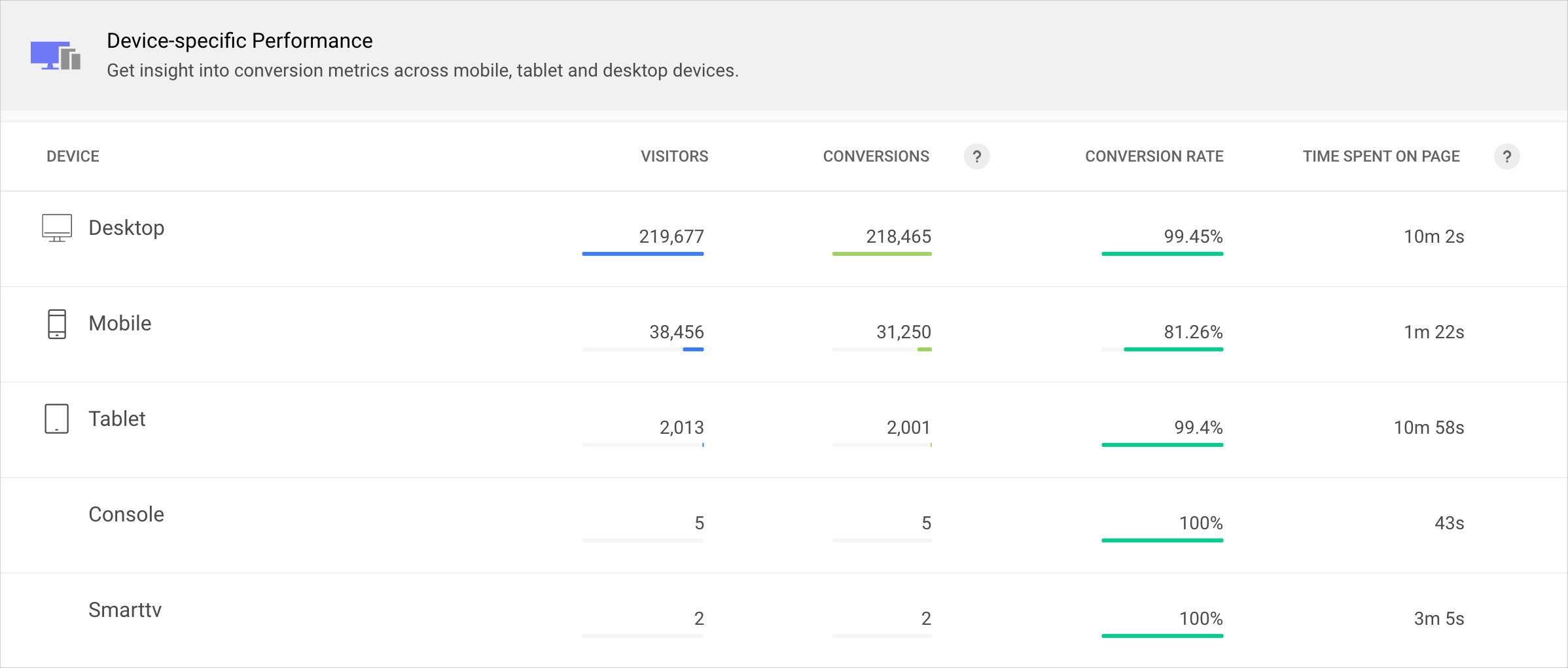 このウィジェットでは、目標を追跡するWebページへのアクセスに訪問者が利用したデバイスの一覧が表示されます。各デバイスの種類の項目では、訪問者数、コンバージョン数、コンバージョン率、コンバージョンの平均時間(ページの目標に滞在時間を設定している場合は平均滞在時間)を確認できます。