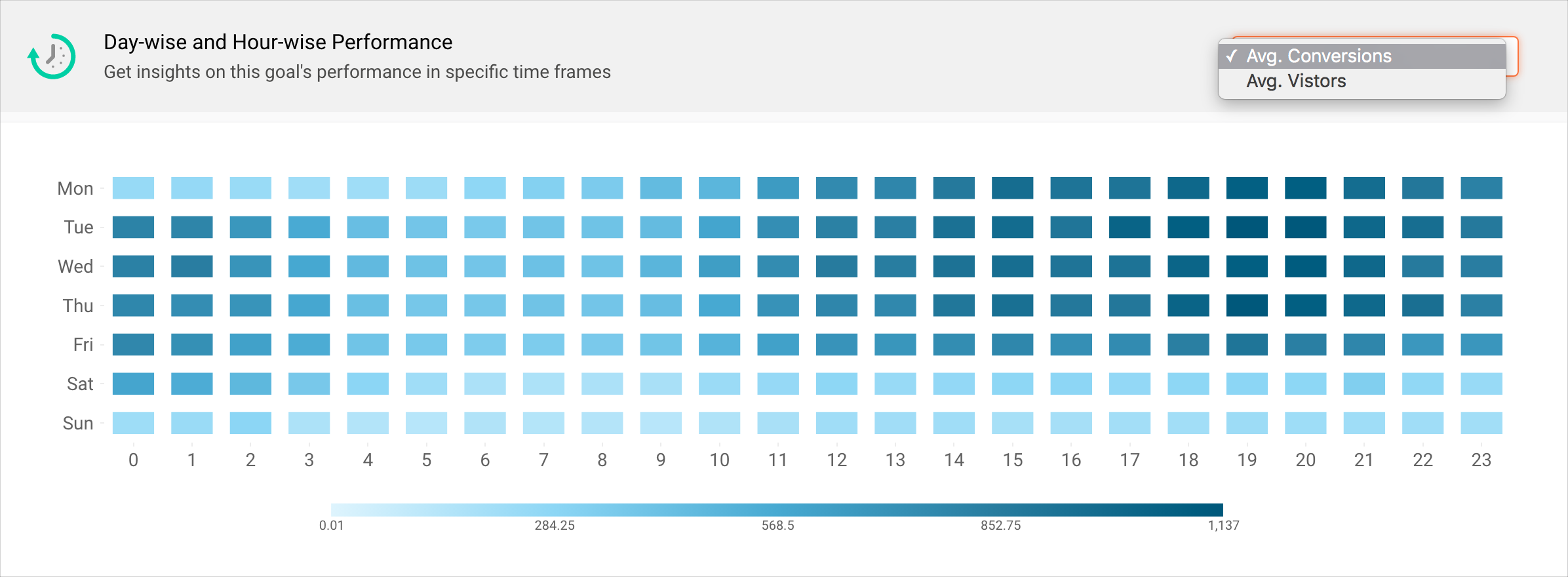 このウィジェットでは、顧客がWebサイトに最も頻繁にアクセスする時間帯を確認することにより、Webサイトで最もアクセスが行われる時間を把握することができます。平均コンバージョン数や訪問者数を把握することで、ページを効率よく最適化できます。
