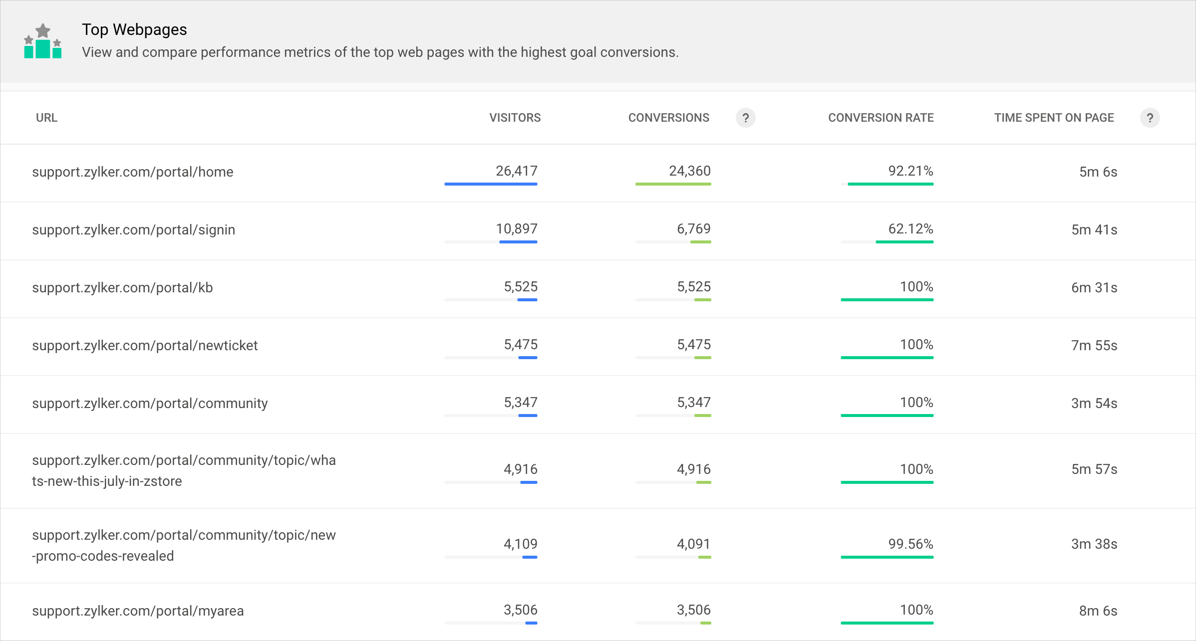 ヘルプセンターがカスタマーサポート業務でどのように有効に機能しているか把握することは、ページへの訪問者数などの指標を測定することと同様にとても重要です。たとえば、フォームの送信、ボタンのクリック回数、アカウントの作成など、ヘルプセンターでの行われる訪問者の操作を把握することで、顧客のニーズを満たせているかどうかを把握できます。ヘルプセンターとZoho PageSenseを連携することで、それぞれの指標を目標として設定し、管理することができます。