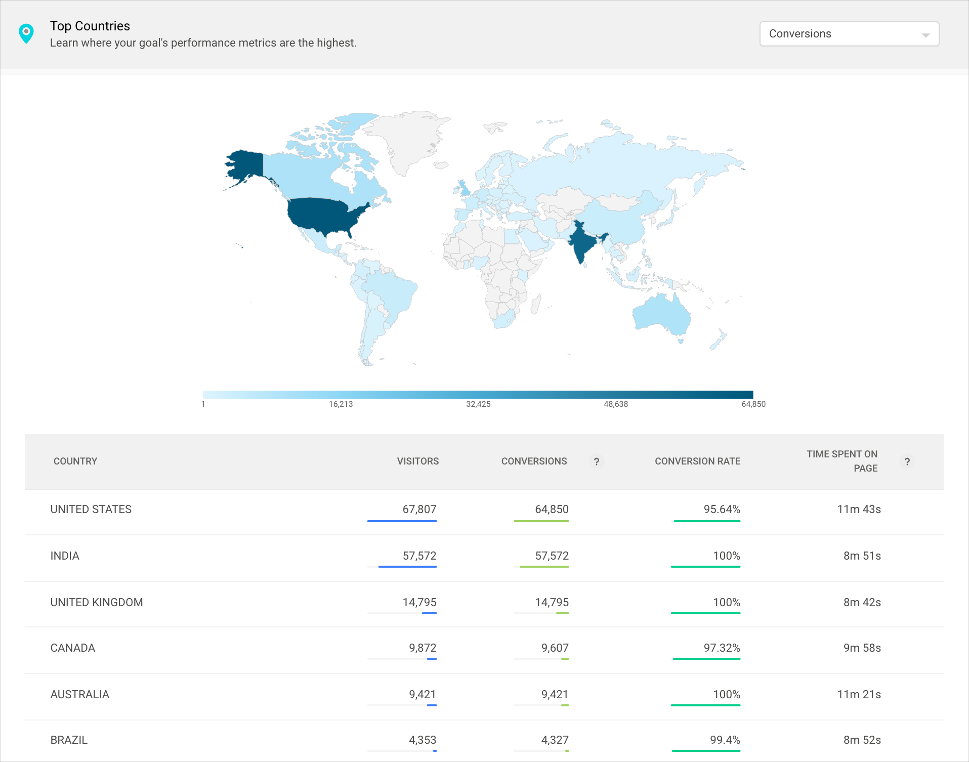 このウィジェットでは、目標を追跡するWebページにアクセスした訪問者の国の一覧が表示されます。各国の項目では、訪問者数、コンバージョン数、コンバージョン率、コンバージョンの平均時間(ページの目標に滞在時間を設定している場合は平均滞在時間)を確認できます。