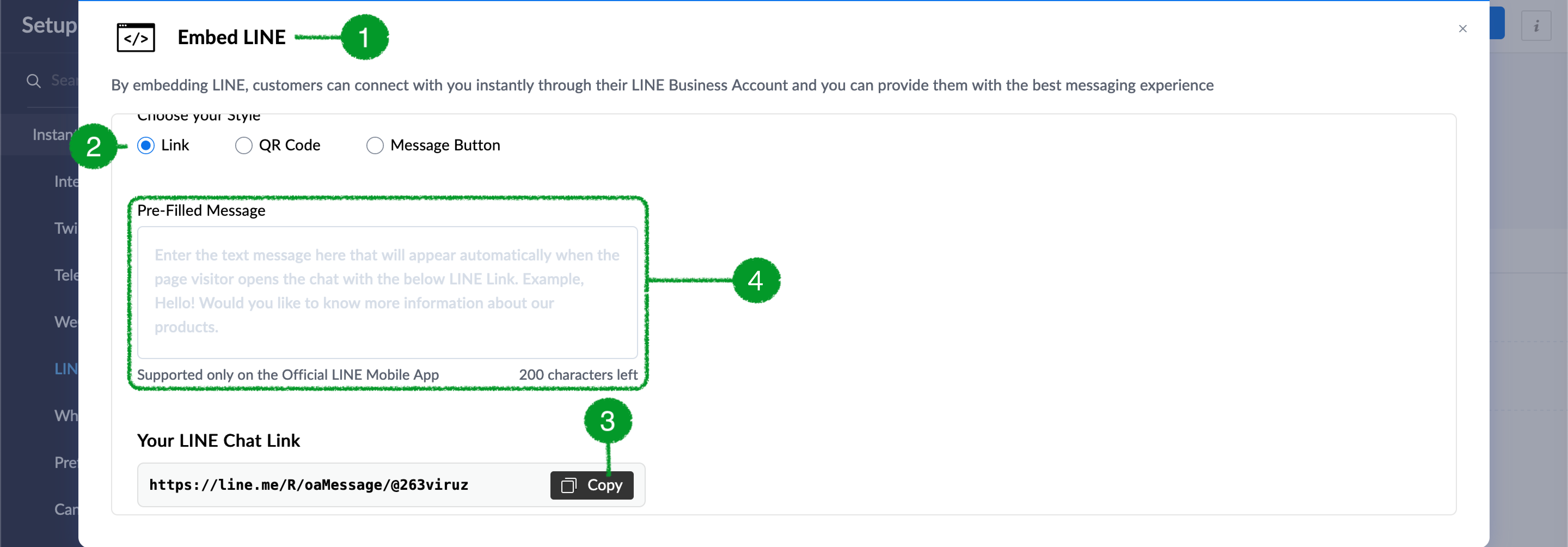 顧客が、自動生成されたLINEのチャット用リンクをクリックすると、LINEアプリが開き、すぐにチャットを開始できます。顧客がチャット画面を開いた際に、メッセージ入力欄にあらかじめメッセージ例が入力された状態にすることもできます。