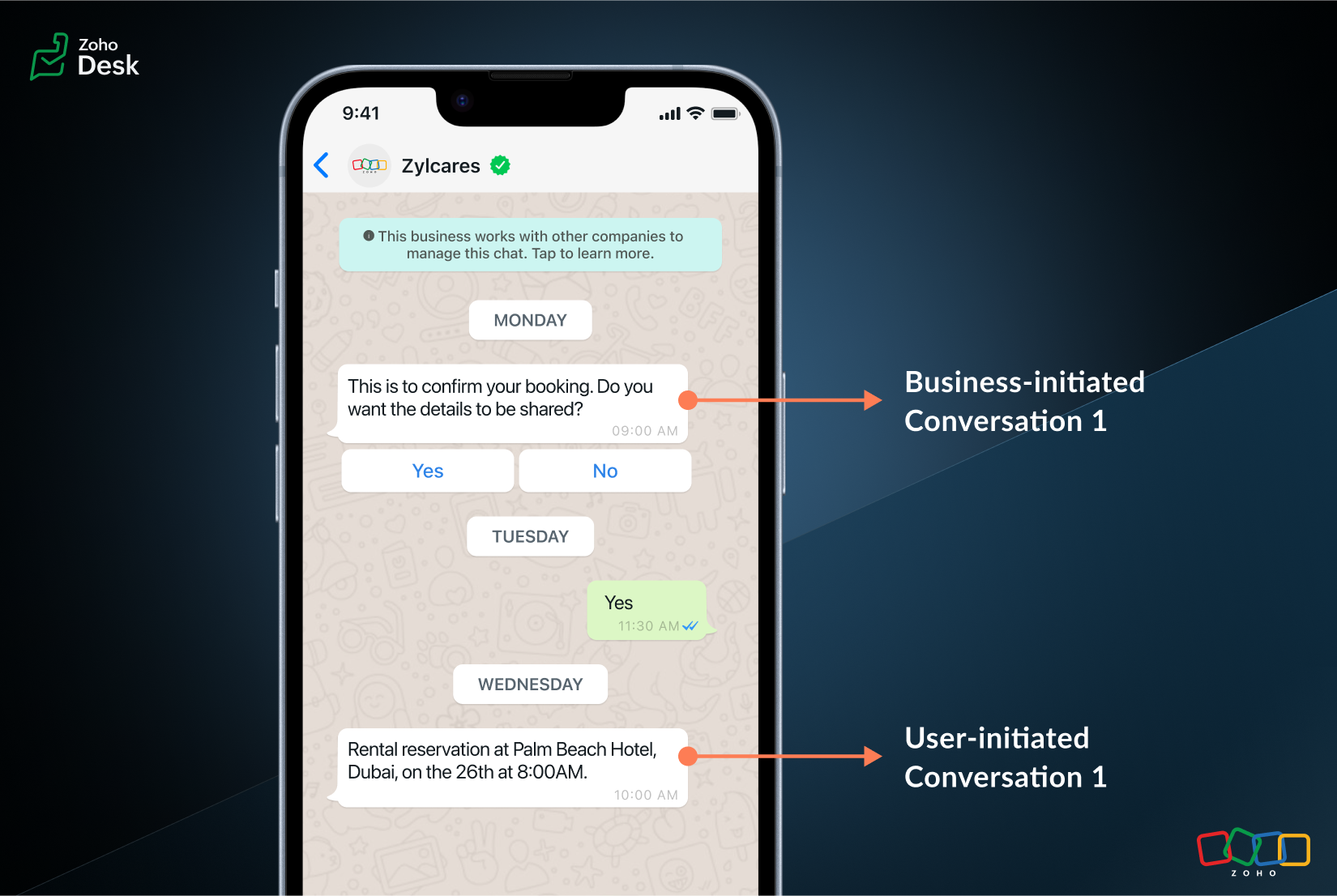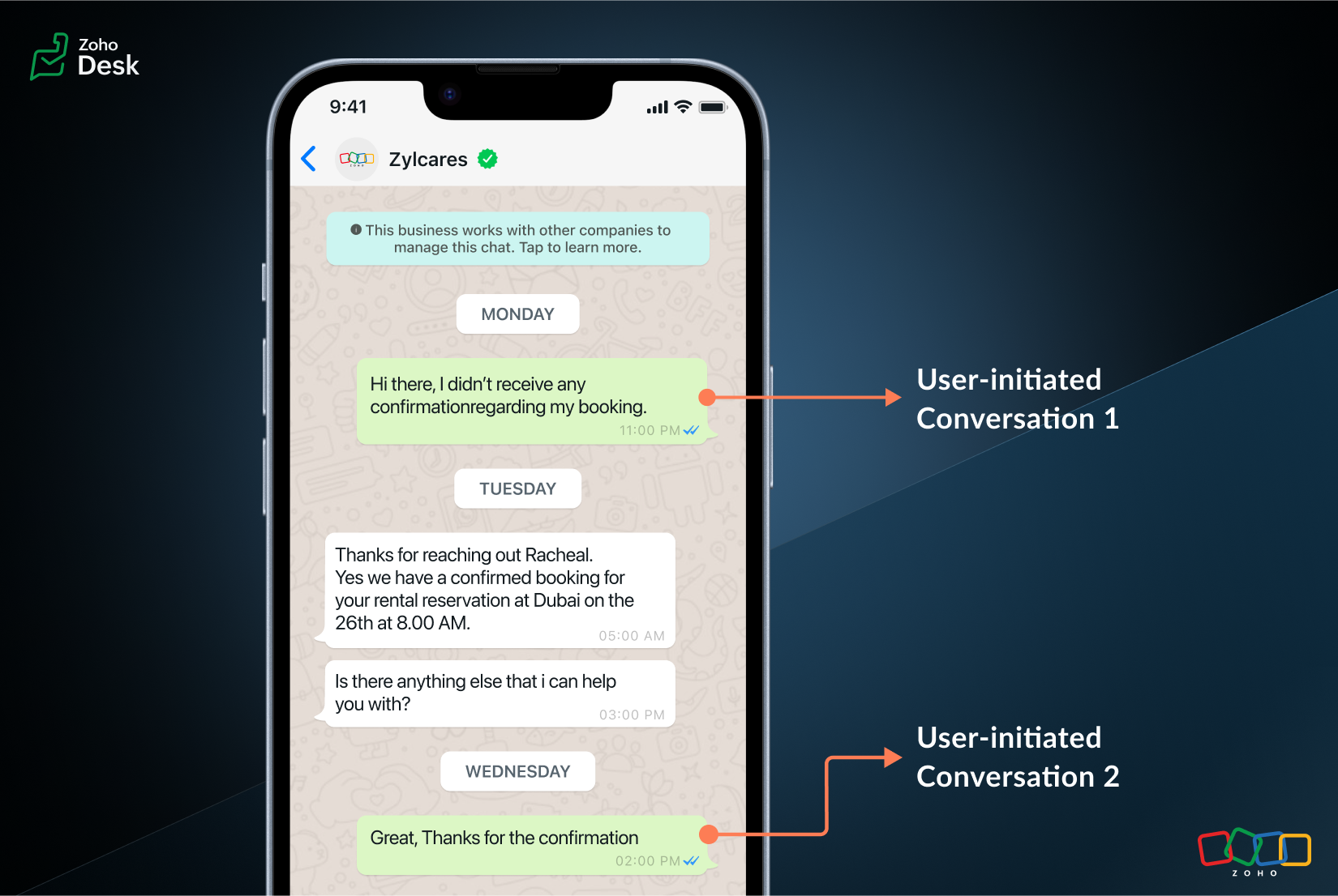 企業は 火曜日 午前10時 に返信を行いました。この際、企業が返信を行ったことにより、「顧客側が開始した会話」(UIC:User-Initiated Conversation)1件分の料金が発生します。また、火曜日の午前10時を起点とする24時間の顧客サービス時間枠が開始します。