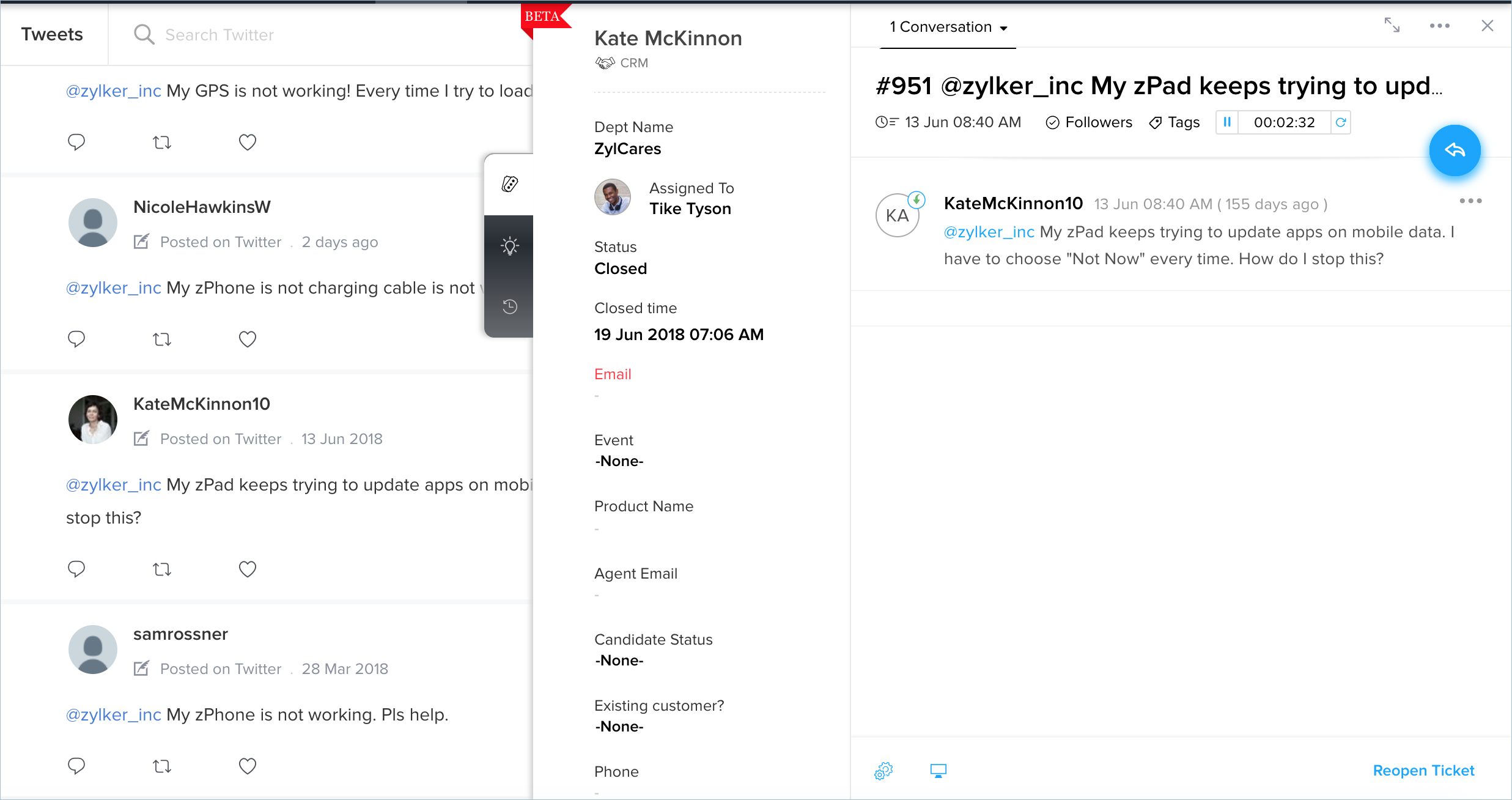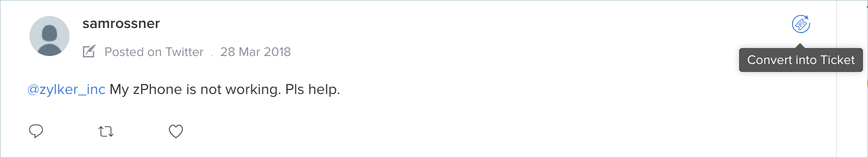 ソーシャルメディアの投稿やメッセージを問い合わせに変換するには、投稿の右上にある[問い合わせに変換]アイコンをクリックします。投稿はすぐに問い合わせに変換され、アイコンが問い合わせ番号に置き換えられます。番号の下にはポップアップメニューが表示されます。このポップアップメニューから、問い合わせを担当者やチームに割り当てることができます。