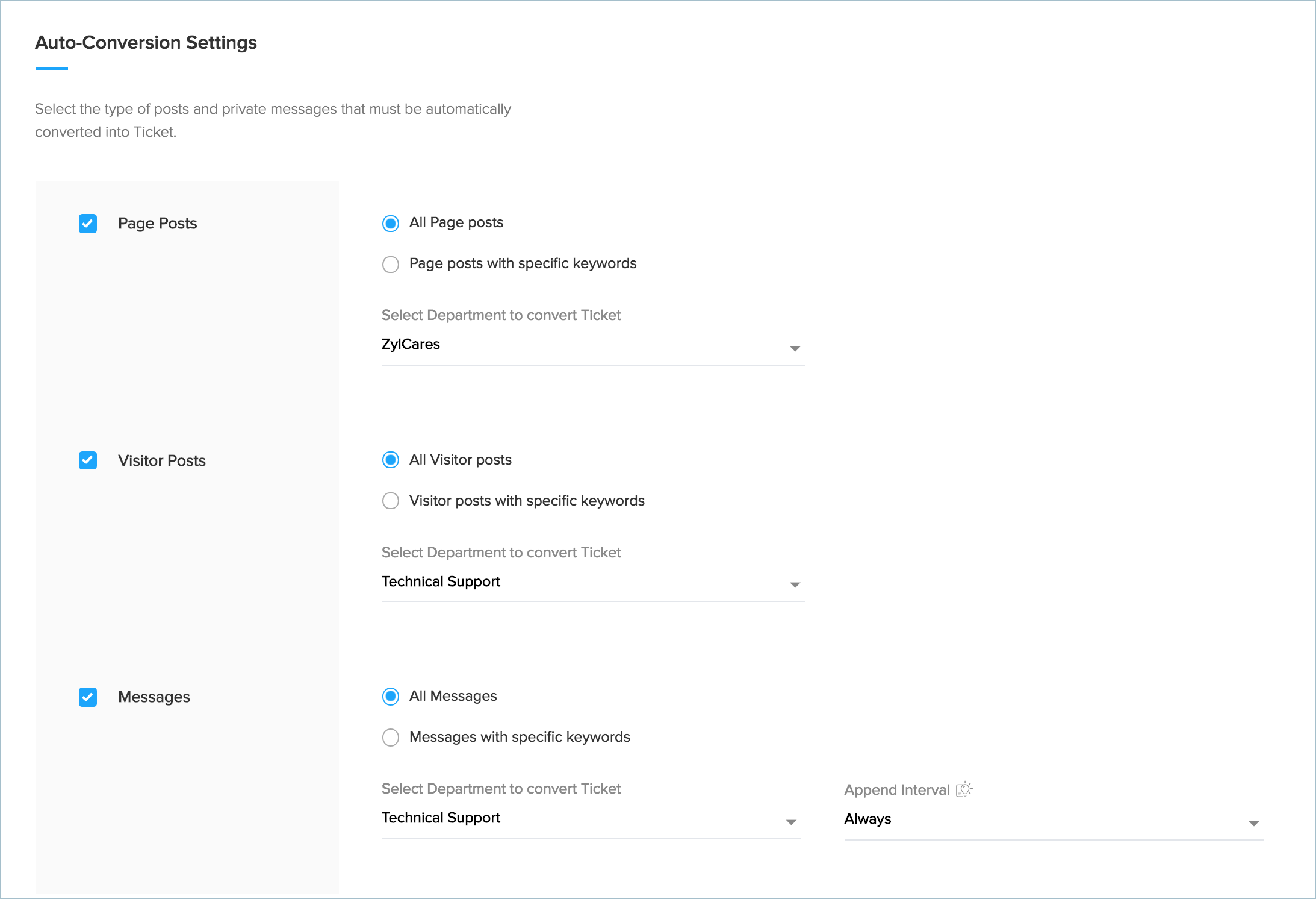 - すべての投稿とメッセージ: このサブオプションを選択すると、オプションで定義された種類のすべての投稿とメッセージが、自動的に問い合わせに変換されます。