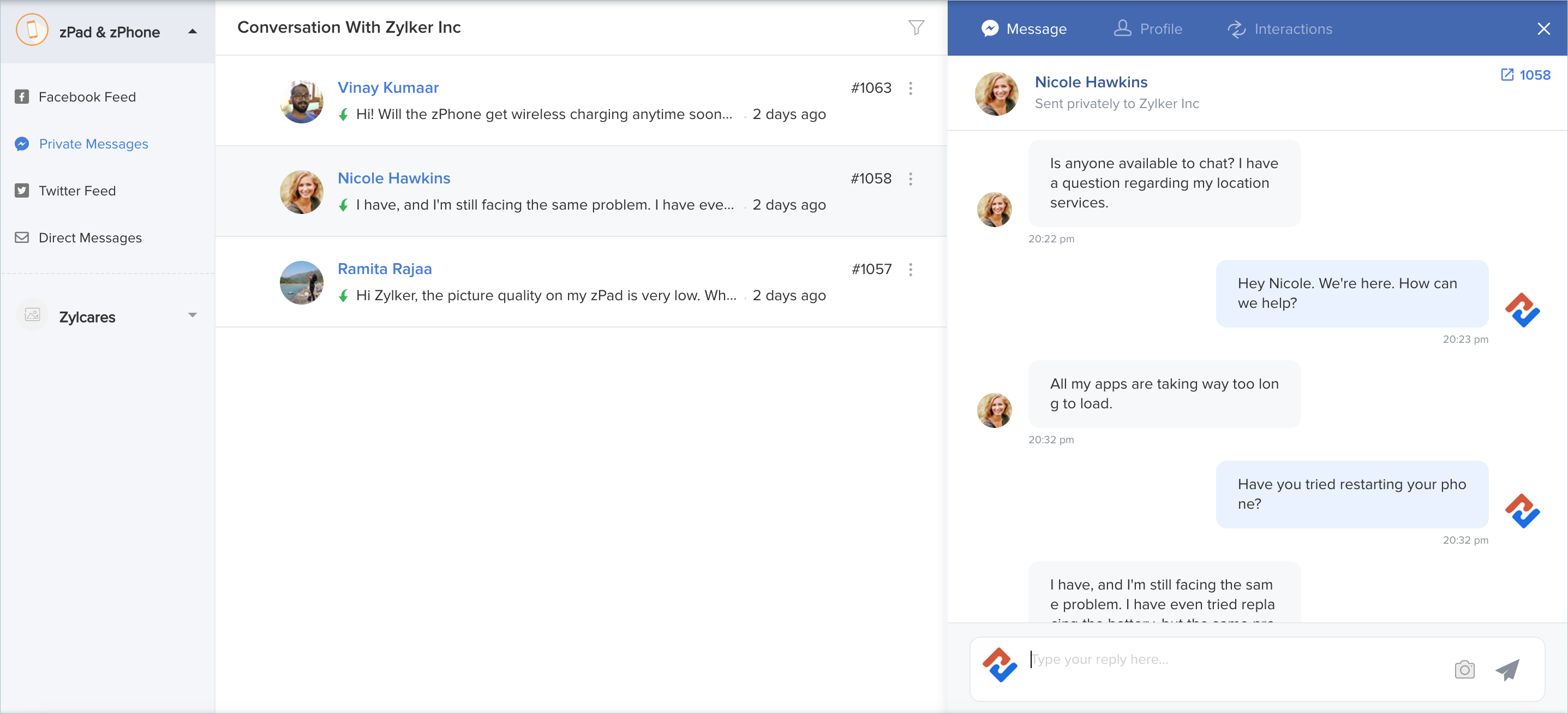 非公開メッセージのフィードには、エンドユーザーが非公開で送信したメッセージが表示されます。投稿と同様に、非公開メッセージも問い合わせに変換できます。また、すべてのメッセージを表示したり、問い合わせに変換された、または変換されなかったメッセージのみを抽出して表示したりできます。