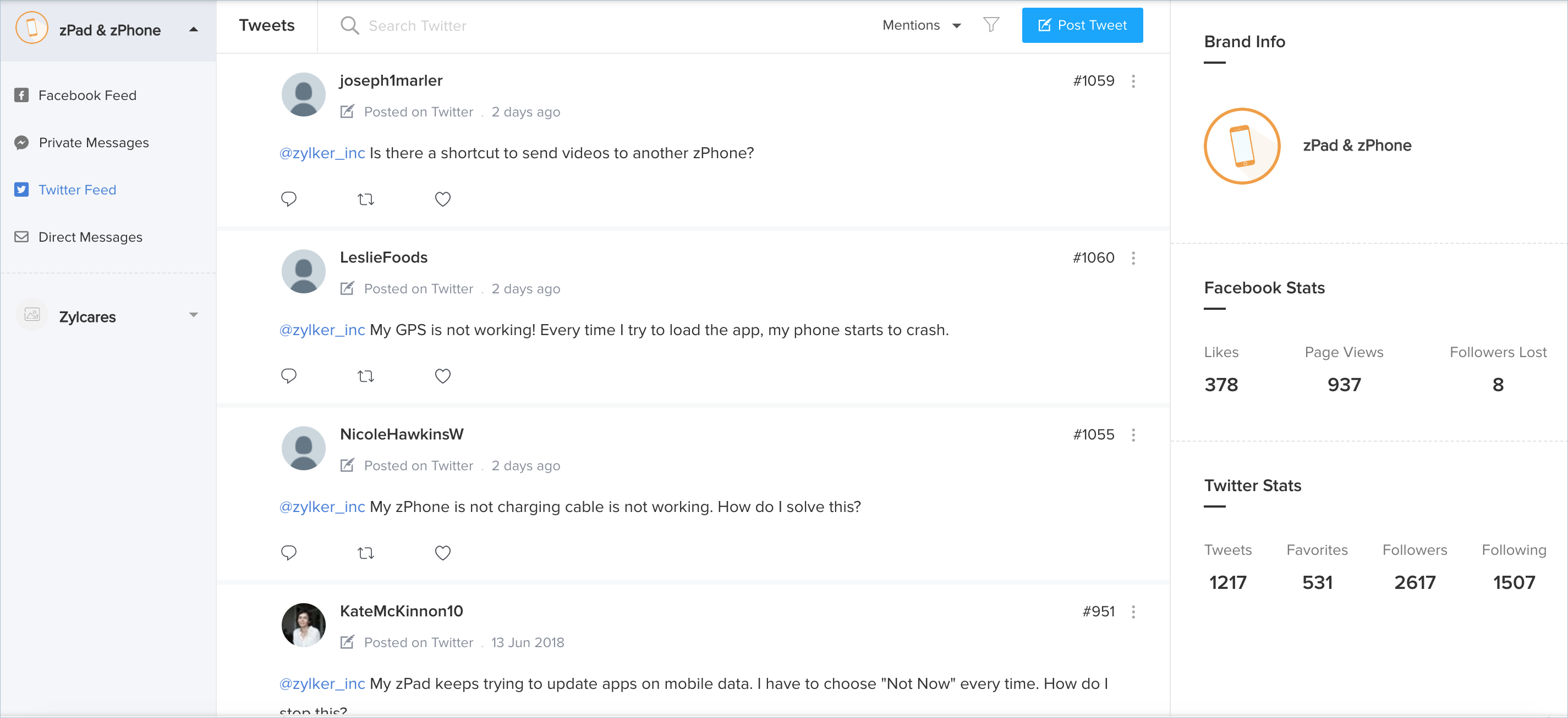 ソーシャルメディアアカウントをソーシャルタブのブランドに接続すると、ソーシャルメディアアカウントで行われた投稿、@メンション、メッセージなどの情報がFacebookやTwitterのフィードに自動的に表示されます。このフィードでは、投稿へのコメント、投稿に対する評価、ツイートへの返信、ツイートへのリツイートや評価など、基本的な操作をすべて行うことができます。また、これらの投稿をヘルプデスクの問い合わせに手動、または自動で変換することもできます。