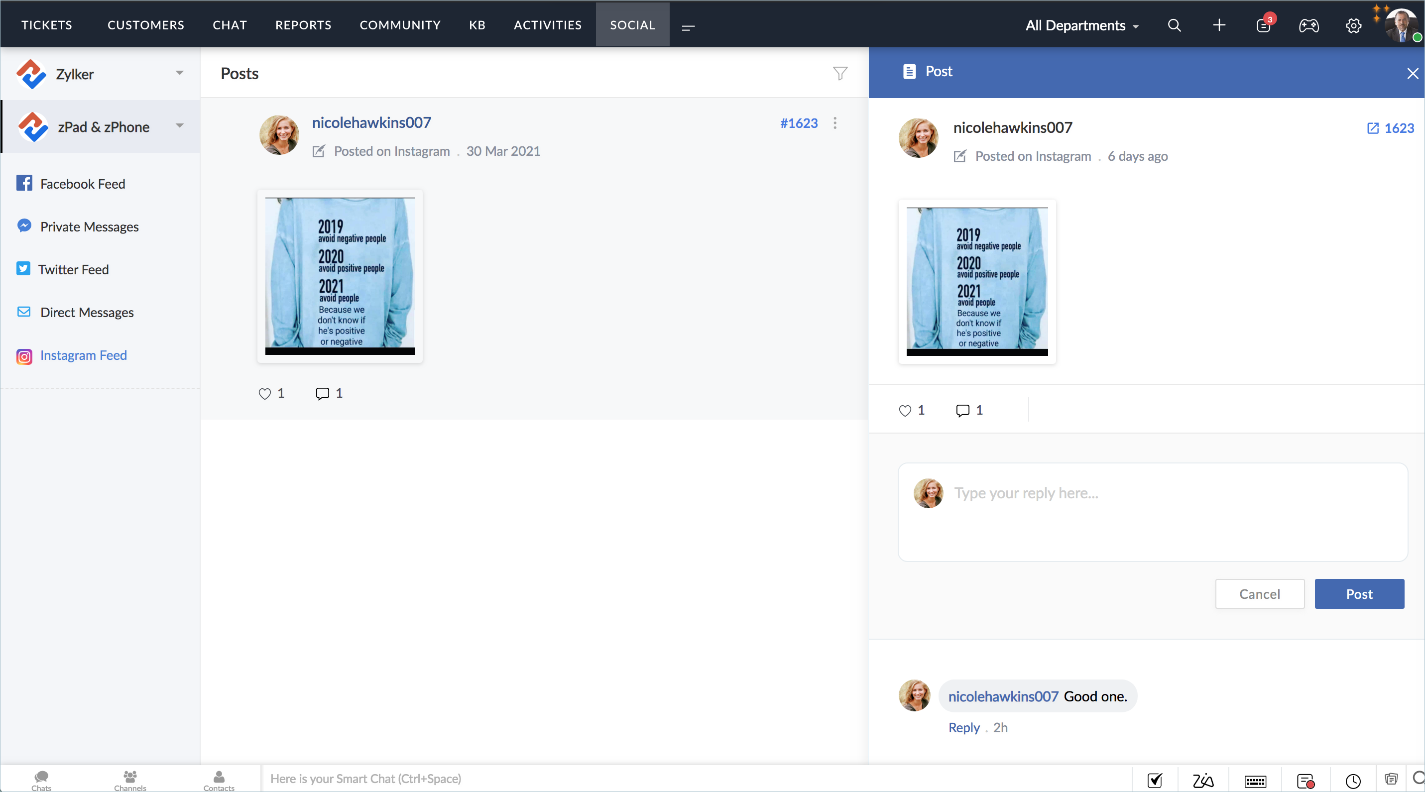 現在、ソーシャルメディアは、カスタマーサポート業務を行う上で最も便利なサポート経路(チャネル)の1つになっています。ソーシャルメディアによって、顧客と直接的にすぐにやりとりすることが可能になりました。ソーシャルメディアで存在感を出し、顧客の投稿に対してきめ細やかに反応していくことは、どのようなビジネスのカスタマーサポートにおいても重要です。Zoho Deskでは、ソーシャルメディア連携の機能が用意されています。Zoho Deskにはソーシャルメディアでのやりとりを効果的に管理するためのソーシャルタブが用意されており、より適切なツールを提供できるように改良が重ねられています。