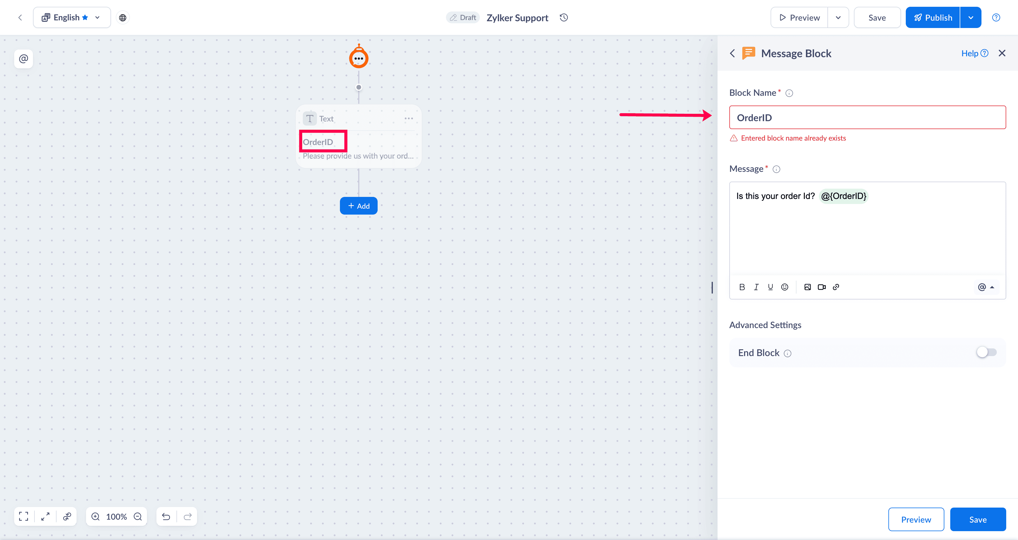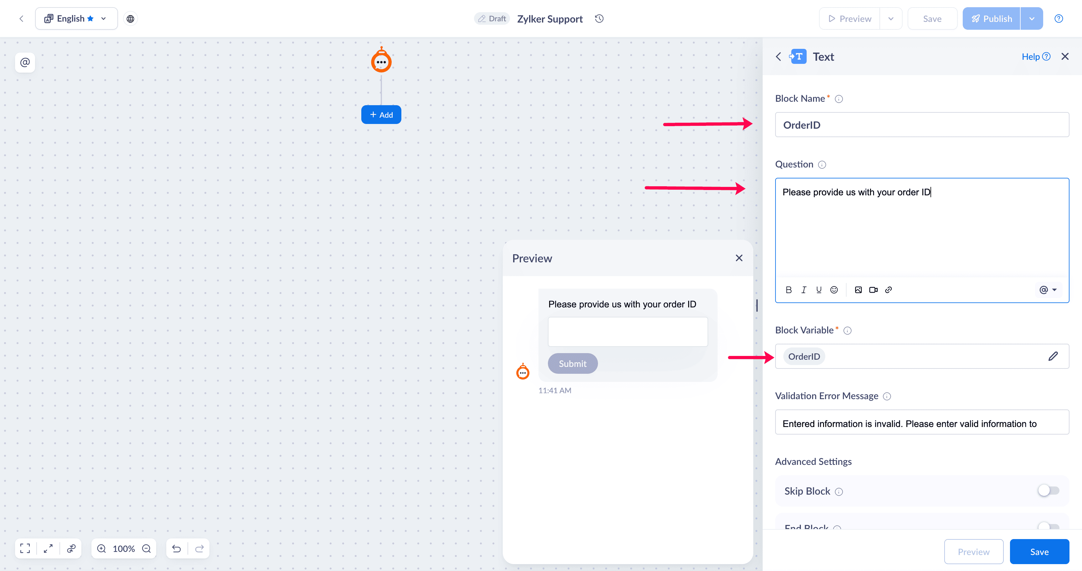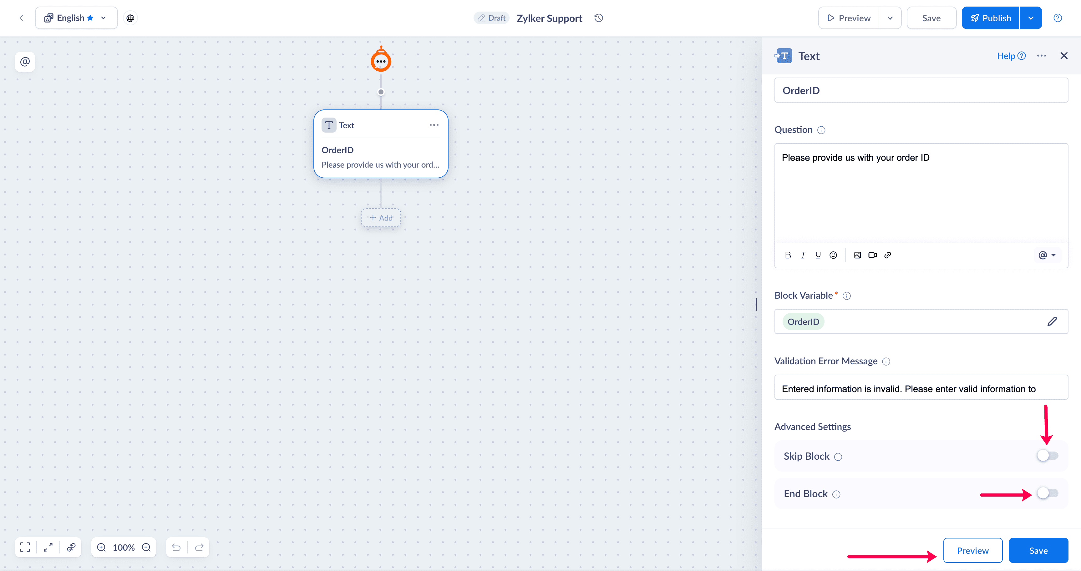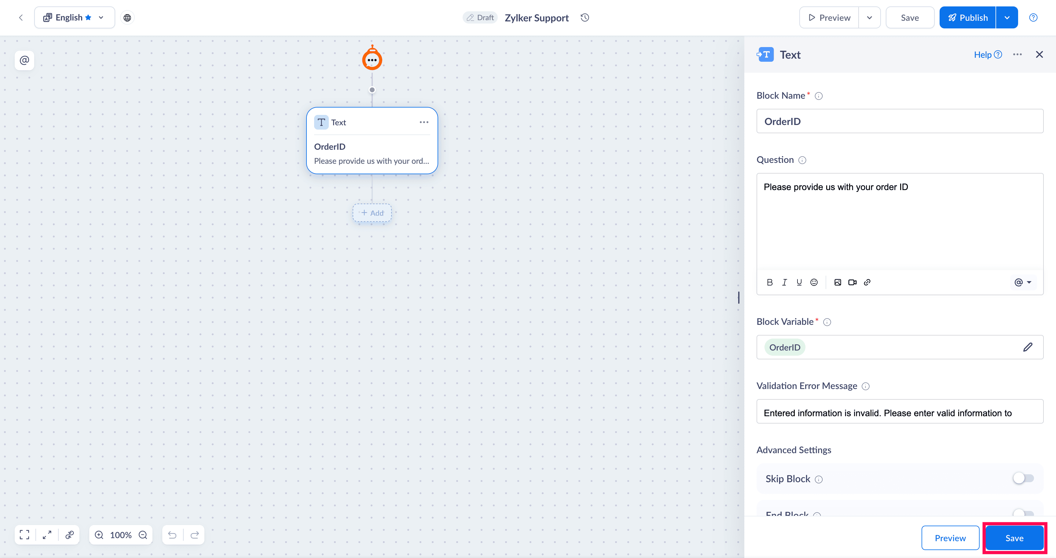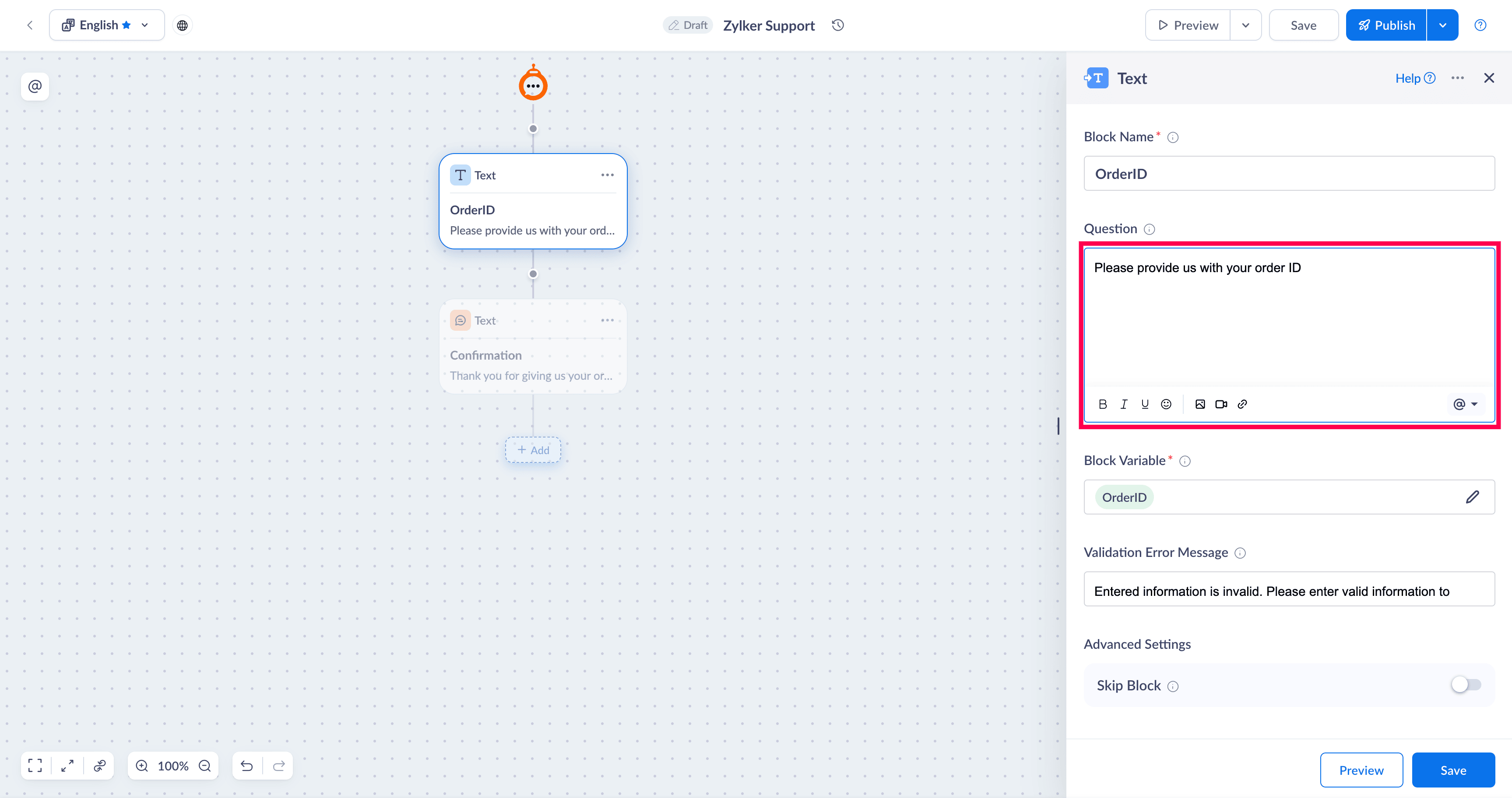 必要に応じてテキストブロックを編集できます。自動ガイドボットのフローが公開中、または下書きであっても編集可能です。編集するには、以下の手順を実施します。