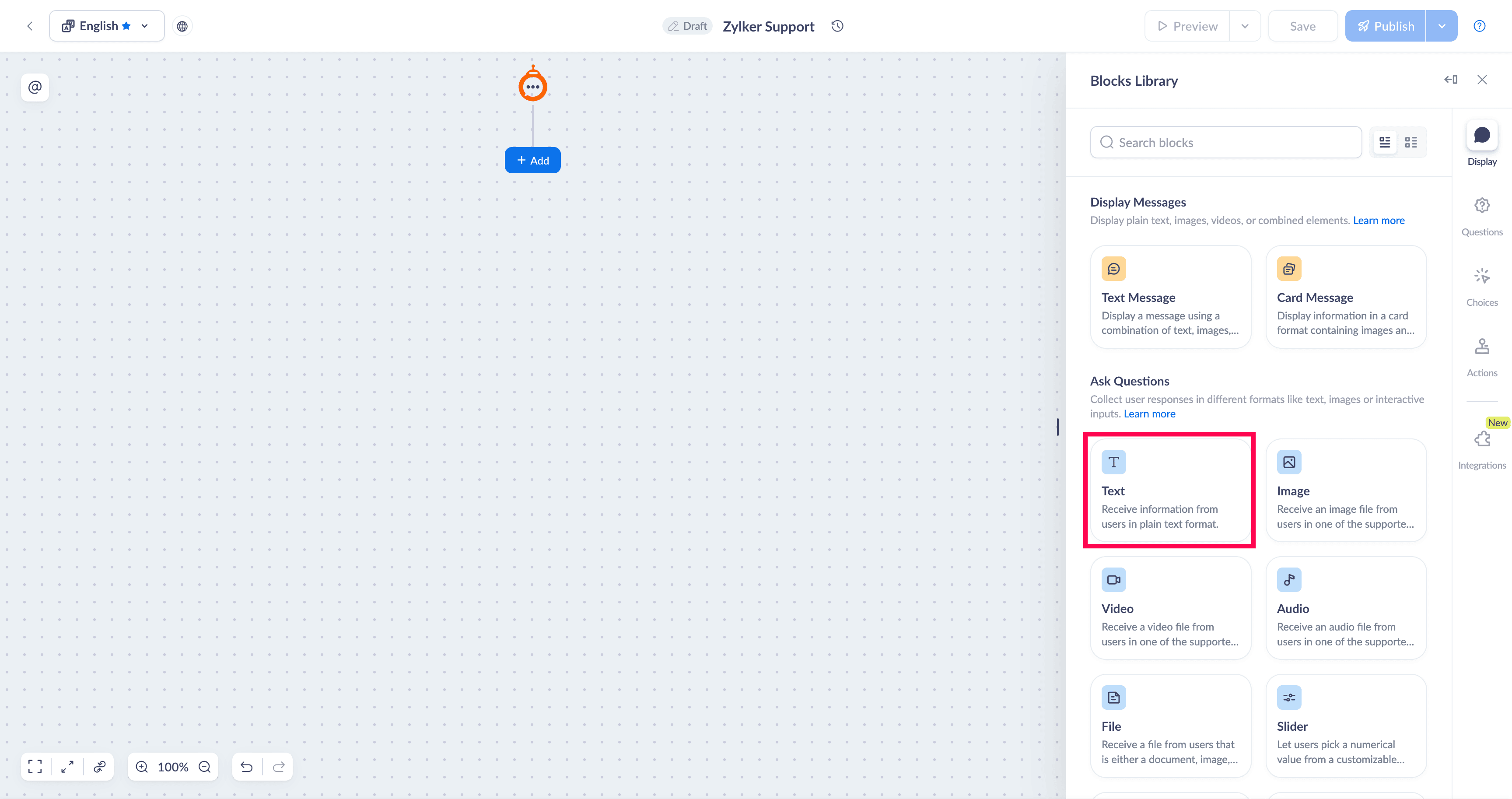 テキストブロックを作成するには、以下の手順を実施します。なお、自動ガイドボットのフローの作成方法については、こちらをご参照ください。