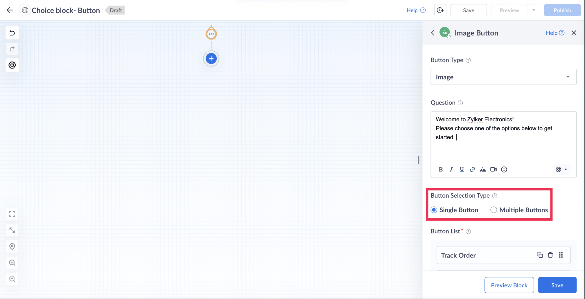 要件に応じたさまざまな種類のボタンブロックを選択できます。これにより、自動ガイドボットのフローを効率よく作成できます。
